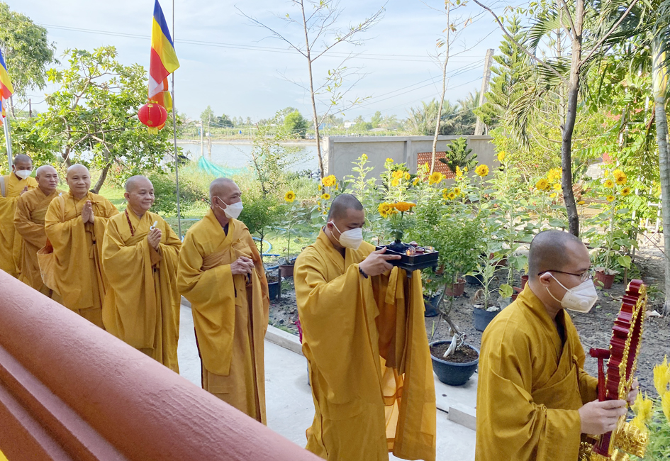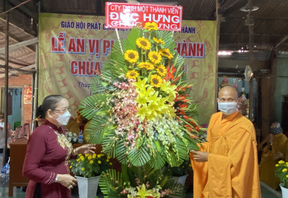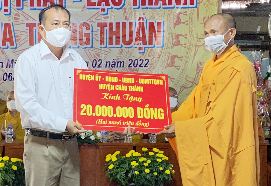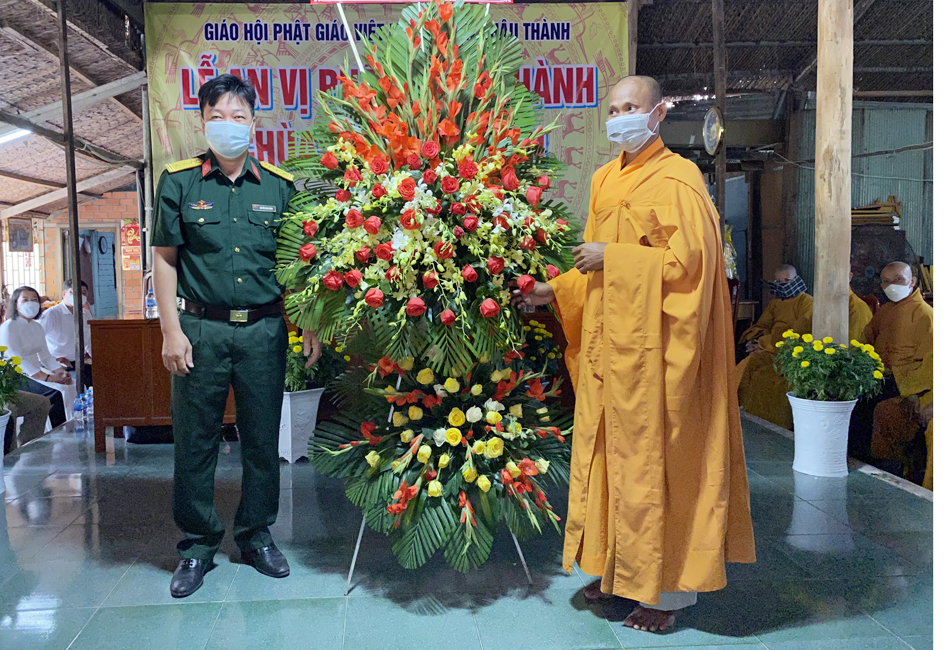 Tại buổi lễ Đại đức trụ trì đã thành kính đón nhận những tịnh tài do HT chứng minh và quý chư tôn đức Tăng, Ni trao tặng. những lẵng hoa tươi thắm của các ban ngành, đoàn thể của huyện Châu thành và xã trao tặng.