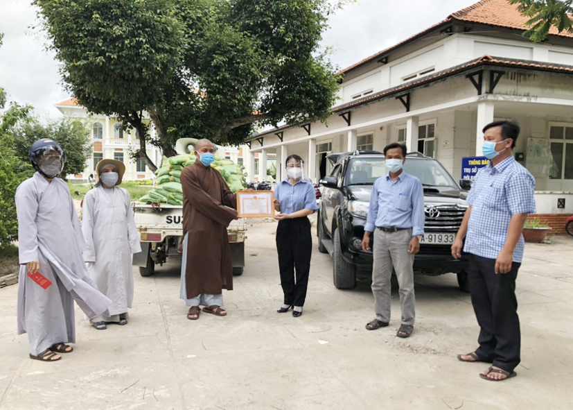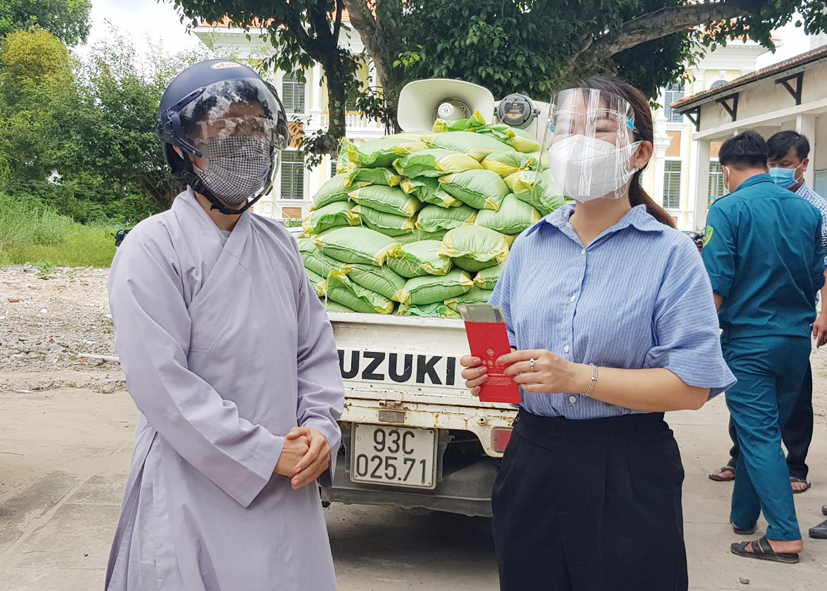 Thay lời chính quyền xã Đức Lập Thượng, bà Trần Thị Thúy Lâm – Phó CT UBND xã tiếp nhận vật phẩm, gửi tặng Thư cảm ơn tri ân sâu sắc, chúc sức khỏe đến quý Chư tôn đức Tăng Ni trong đoàn đã chung tay cùng nhân dân vượt qua đại dịch Covid-19.