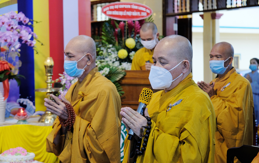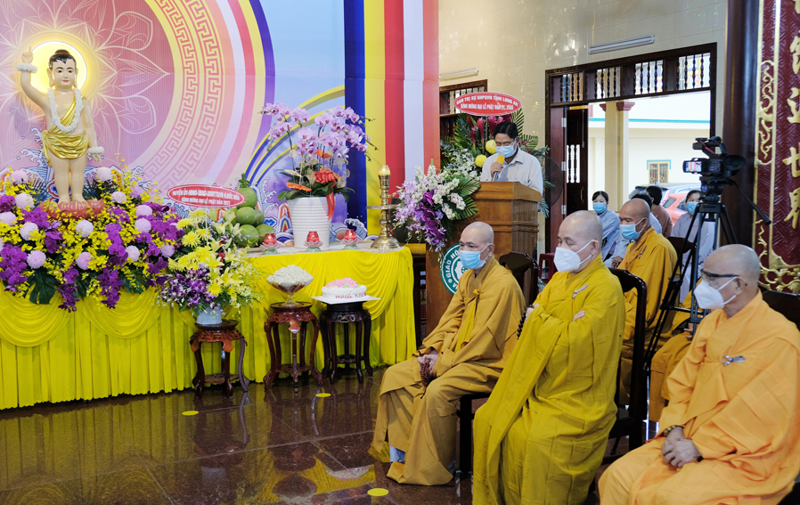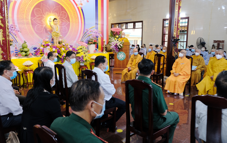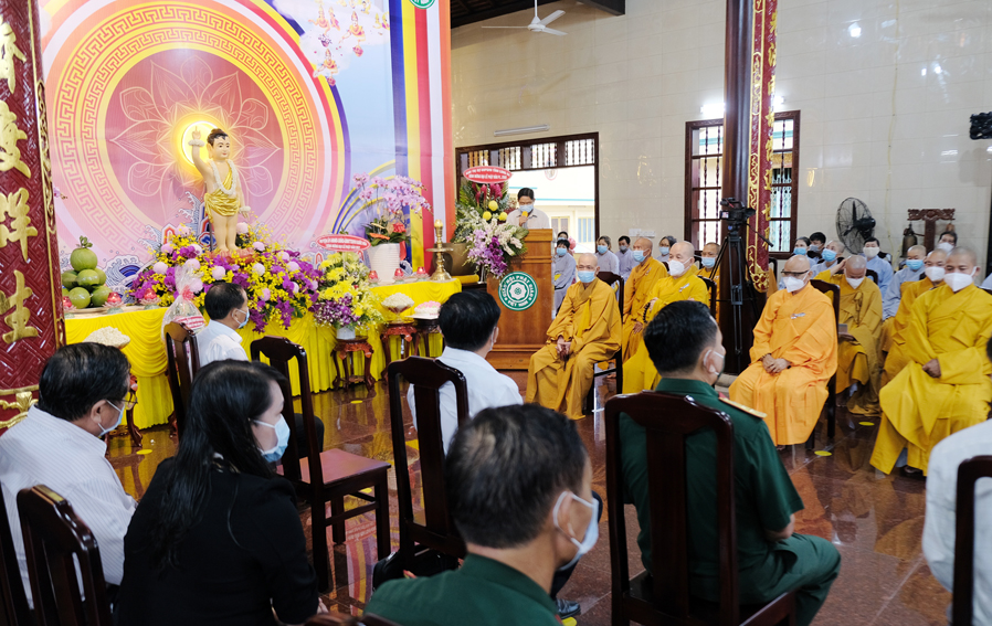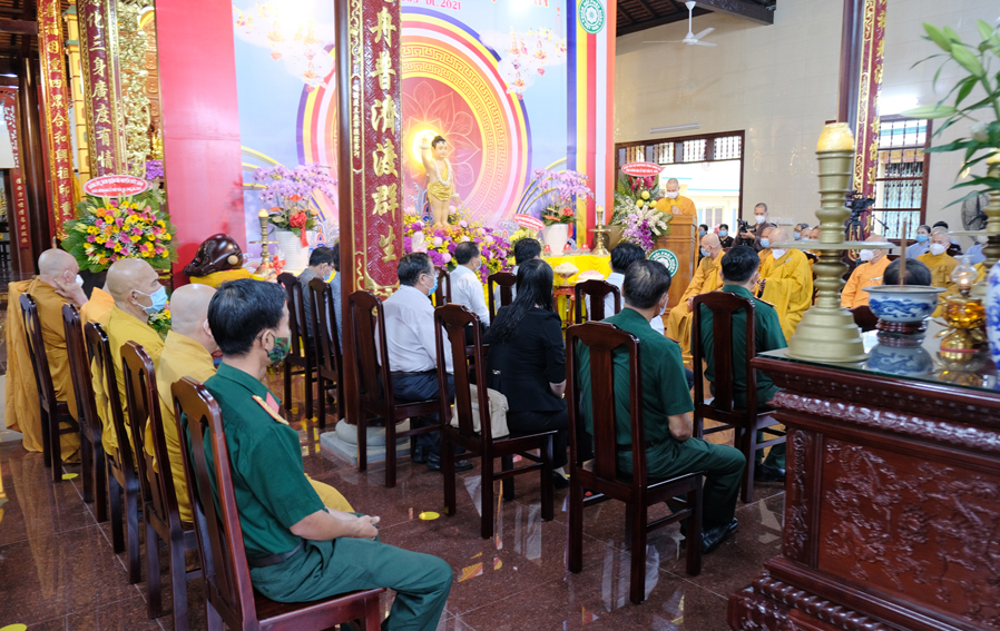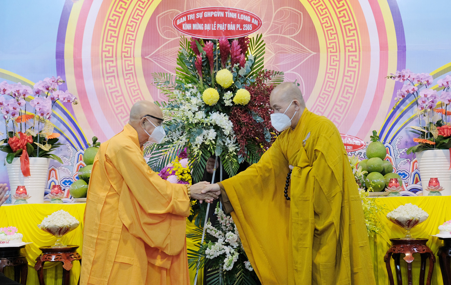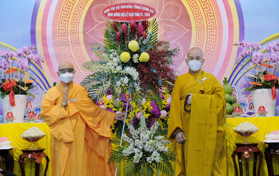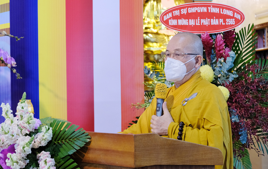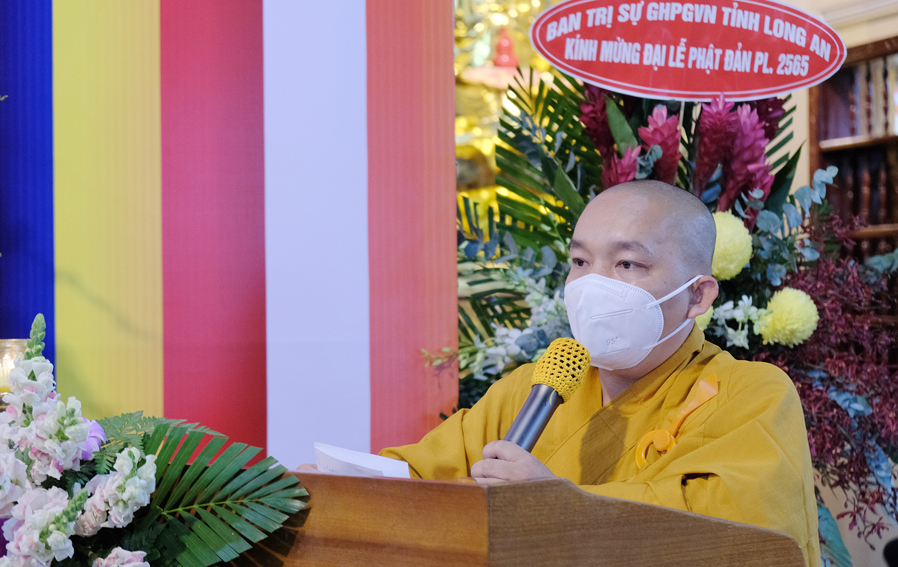 Trong buổi lễ, Hòa thượng Thích Minh Thiện – Trưởng Ban Trị sự GHPGVN tỉnh Long An đã tuyên đọc thông điệp Phật Đản PL 2565 của Đức Pháp Chủ Giáo hội Phật giáo Việt Nam, kỉ niệm 2645 năm ngày Khánh đản của Đức Thế Tôn và chào mừng kỉ niệm 40 năm ngày Giáo hội được thành lập. Nhân mùa Phật Đản năm nay Đức Pháp Chủ đã gửi lời chúc sức khỏe đến toàn thể chư Tăng Ni và đồng bào Phật tử trong và ngoài nước. Kêu gọi các Tự viện, Chư tôn đức Tăng Ni cùng quý Phật tử các giới đồng lòng vì sức khỏe của bản thân và gia đình chấp hành nghiêm túc các biện pháp phòng chống sự lây lan của đại dịch và có những biện pháp ứng phó kịp thời trong quá trình phòng dịch. Trong đó Hòa thượng đã ôn lại những nét son lịch sử Phật giáo đã đồng hành cùng dân tộc, những vị anh hùng thời xa xưa đã hy sinh, cống hiến thân mình giữ gìn vẹn toàn lãnh thổ cho dân tộc Việt Nam.