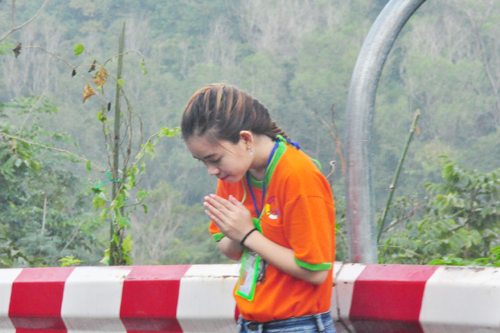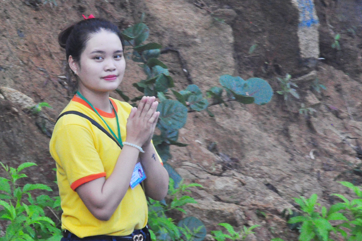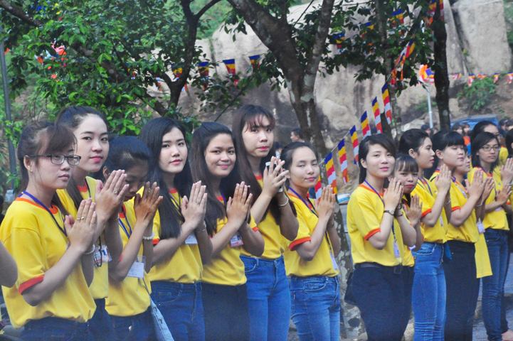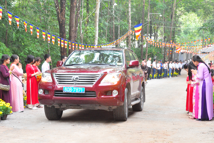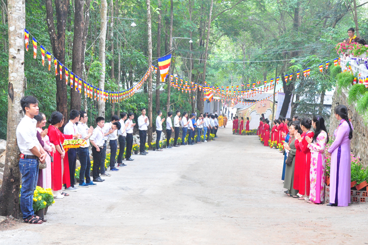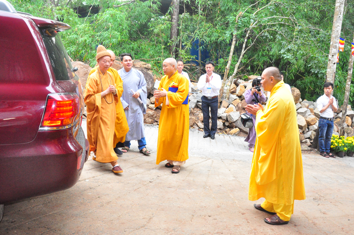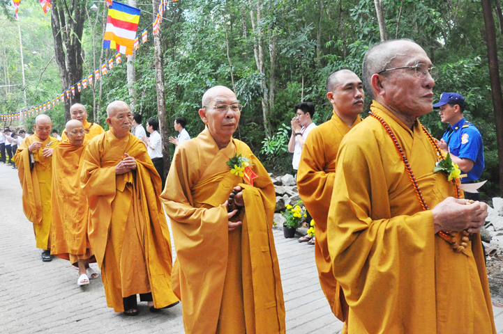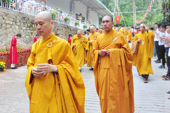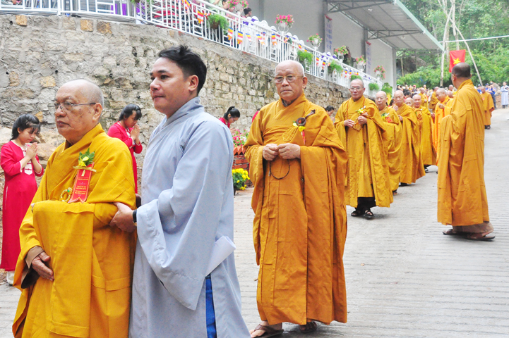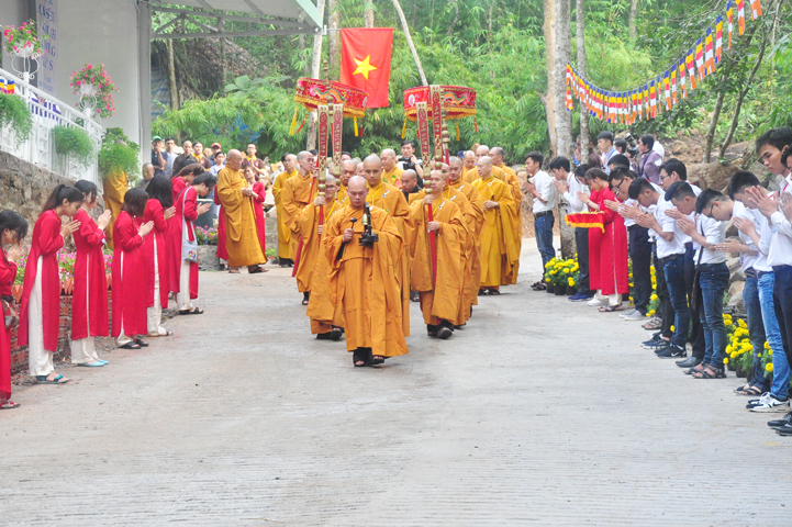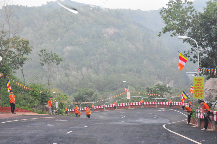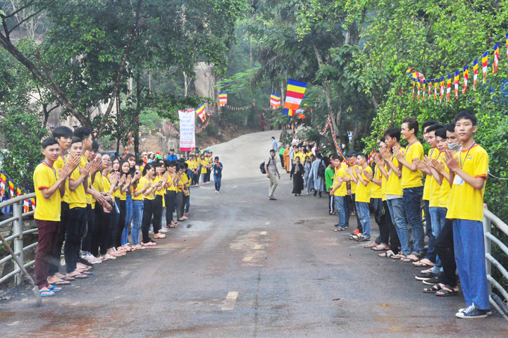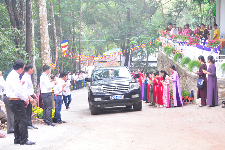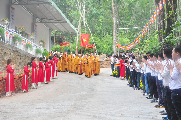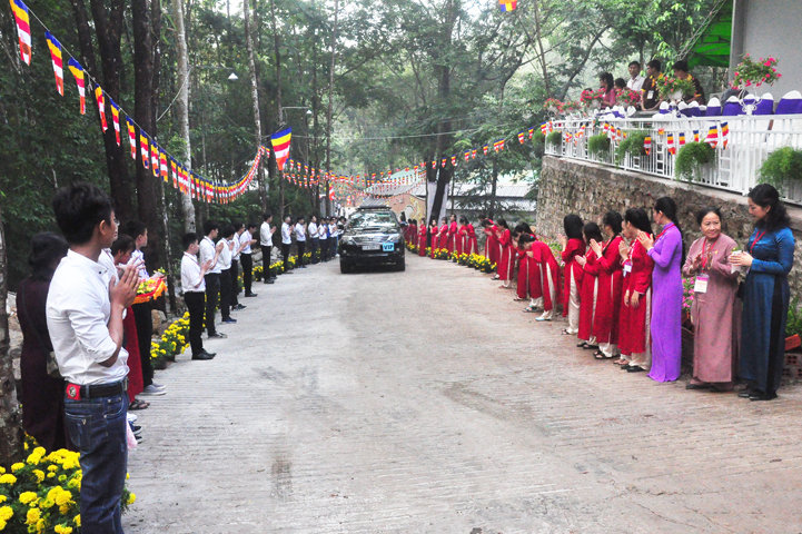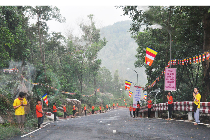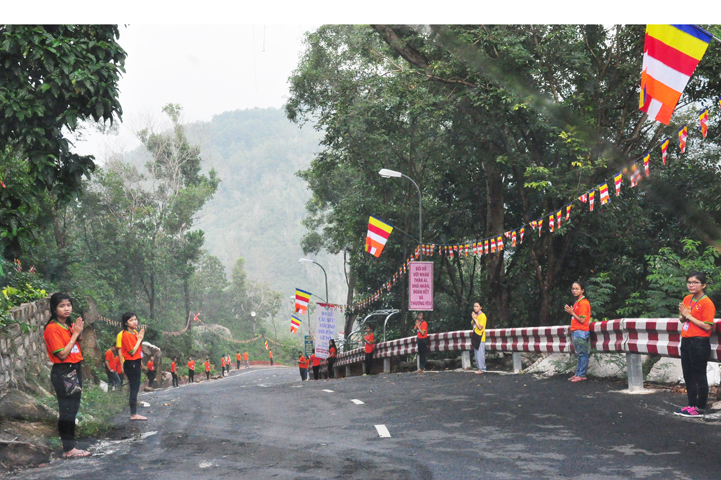 Xuyên qua triền dốc núi cao cao, trong ánh nắng ban mai còn vương hơi lạnh, đoàn cung nghinh chư Tôn giáo phẩm đi giữa hai hàng Phật tử tình nguyện viên cung kính đón chào, khiến cho người người đều cảm nhận được niềm cảm xúc vô biên đang trổi dậy trong tâm hồn thanh tịnh thuần chân.