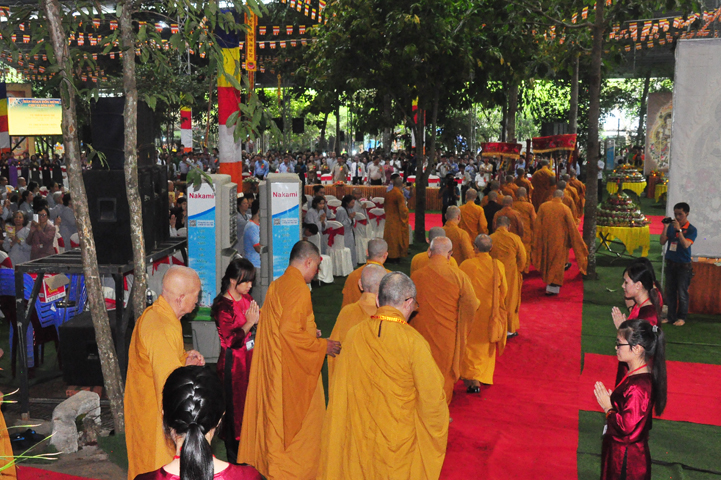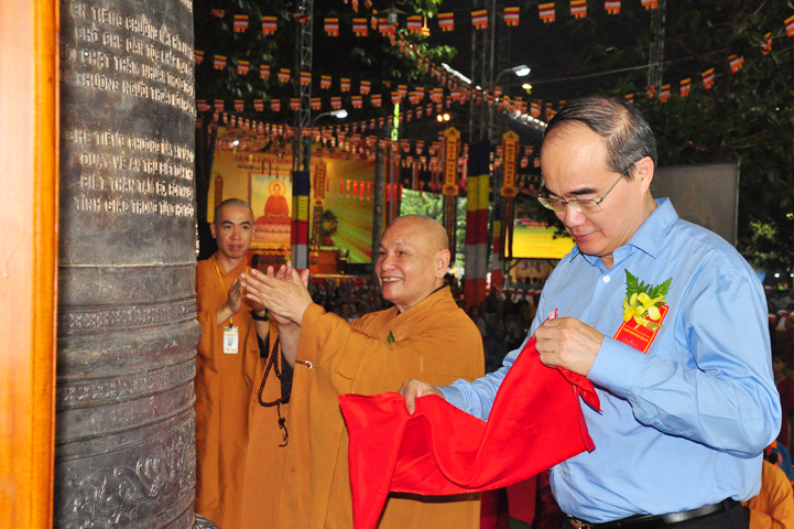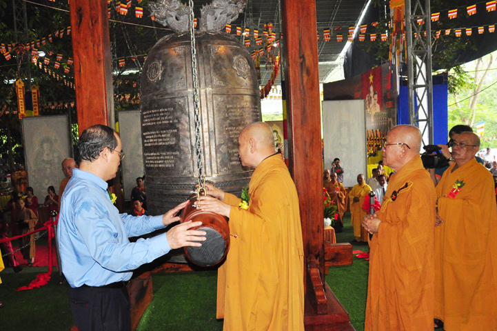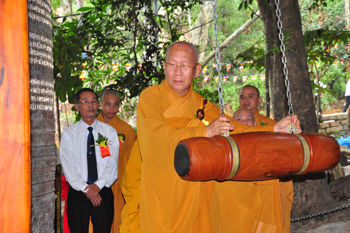 Tiếp theo, Ban nghi lễ cung thỉnh chư Tôn đức Giáo phẩm và đại diện khách quý đồng tiến đến khởi sự triển đại Hồng chung.