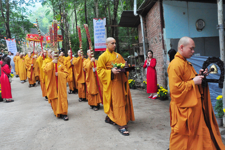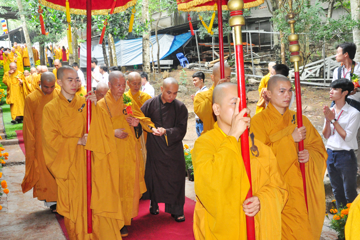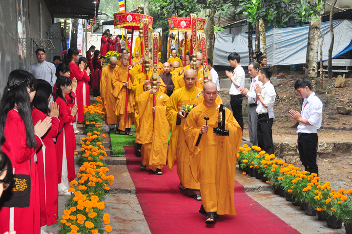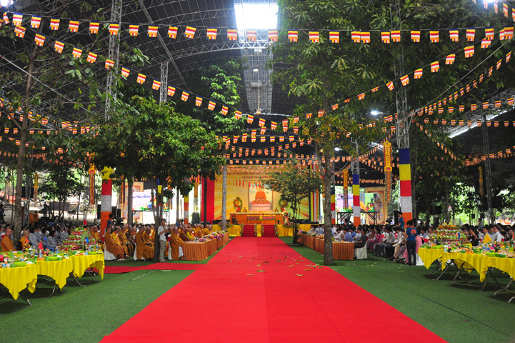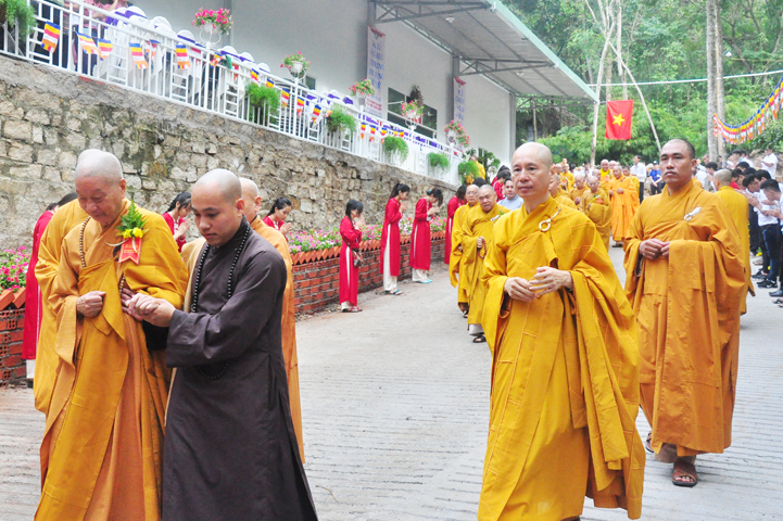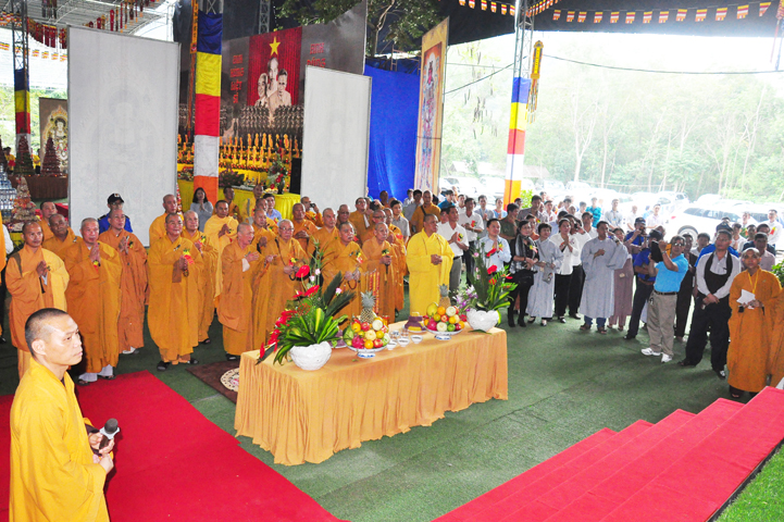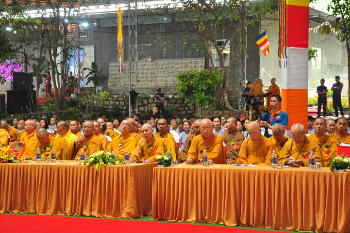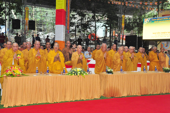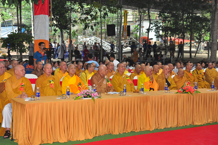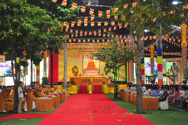Quang cảnh nơi diễn ra Đại lễ vô cùng trang nghiêm, cờ phan phướn lọng rực rỡ tung bay trong gió, giữa rừng núi bạt ngàn màu xanh cây lá, ngập tràn hơi thở thiên nhiên hòa trong tiếng nhạc khánh, linh tạo thành một cảnh sắc thiêng liêng đầy đạo vị.