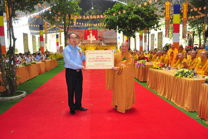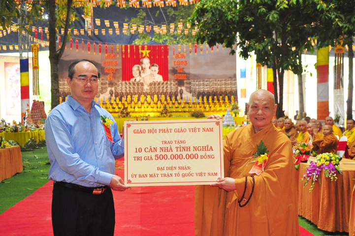 Sau phát biểu đầy cảm xúc của ông Nguyễn Thiện Nhân, tại buổi lễ HT. Thích Thiện Nhơn thay mặt Chư tôn đức trung ương GHPGVN trao tặng 10 căn nhà tình thương trị giá 500 triệu đồng cho những người có hoàn cảnh khó khăn.