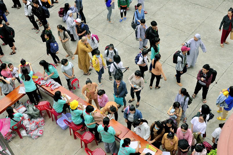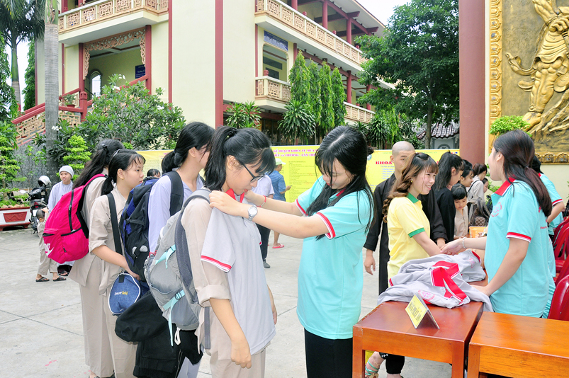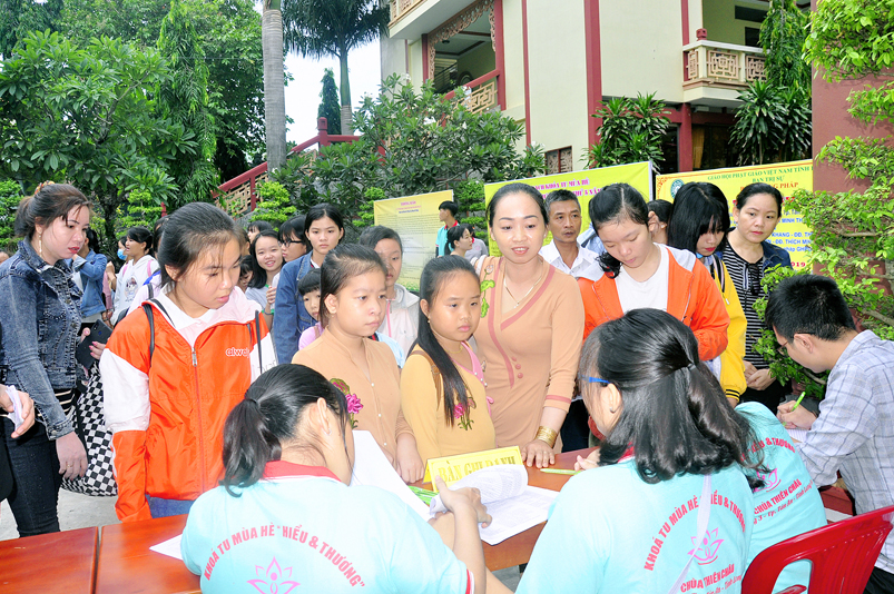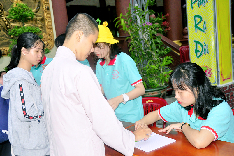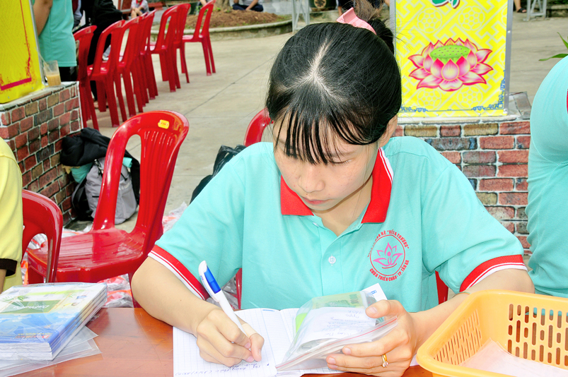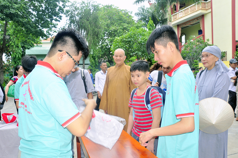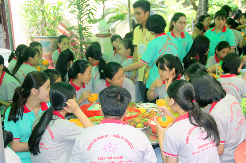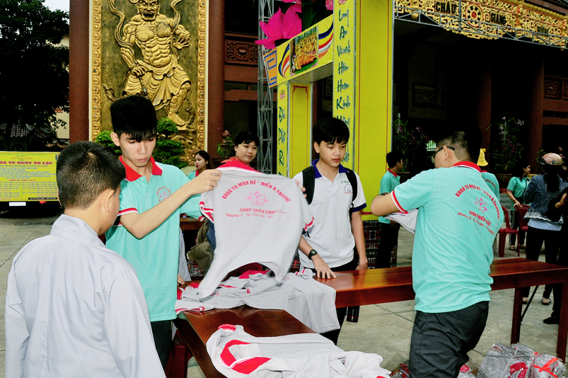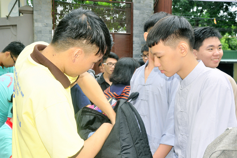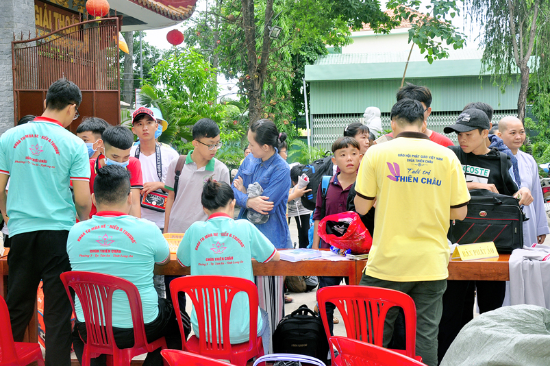 Từ mờ sáng, các em đã vân tập về Thiên Châu trong tâm trạng bồi hồi với nhiều cung bậc cảm xúc khác nhau. Bởi lẽ, có những em đã từng tham gia Khóa tu mùa hè từ những năm trước, hôm nay được trở về chùa cũ, gặp lại bạn xưa nên vui mừng nói cười rộn rã. Bên cạnh đó cũng có những em lần đầu tiên tham dự nên vô cùng bỡ ngỡ, thái độ rụt rè nửa vui nửa sợ. Tuy nhiên nhìn thấy bầu không khí xung quanh tưng bừng nhộn nhịp, các em đã nhanh hòa nhập cùng các bạn; và được quý Thầy Cô cùng các anh chị tình nguyện viên tận tình hướng dẫn đến ghi danh, nhận đồng phục mới, ấm lòng trong tình yêu thương thân thiện.