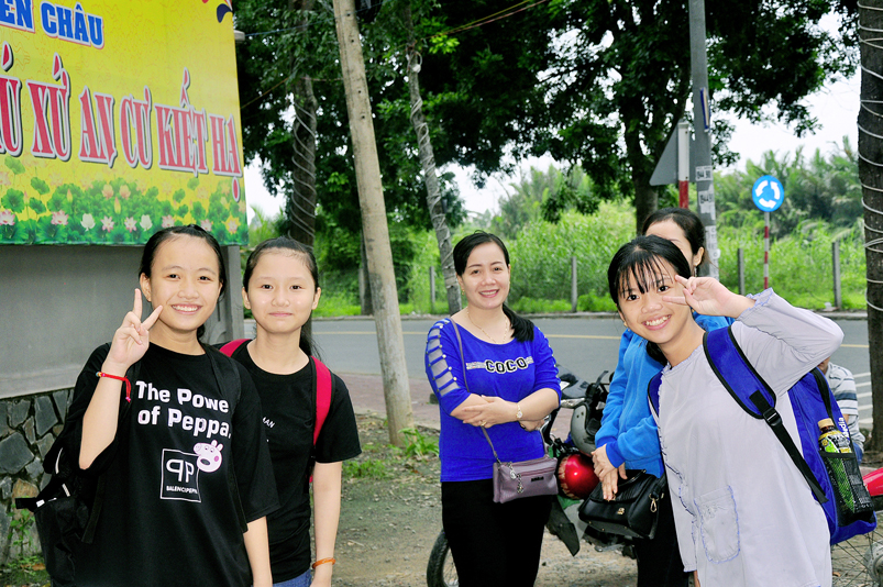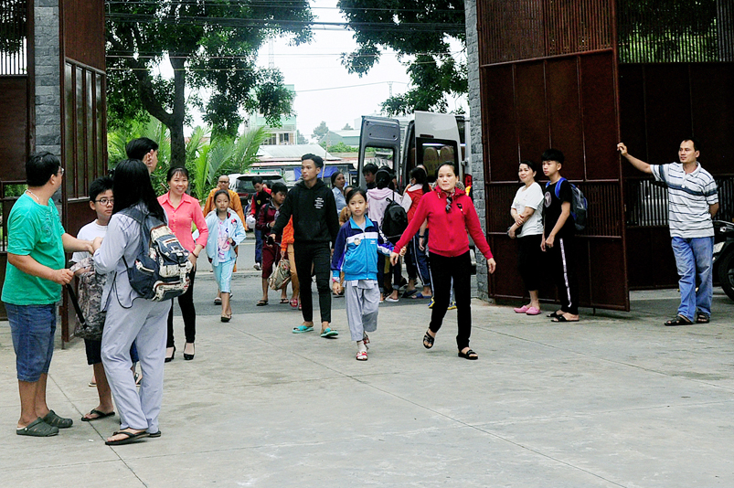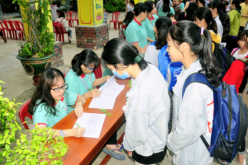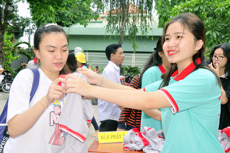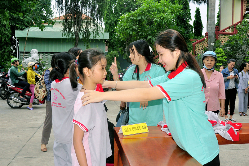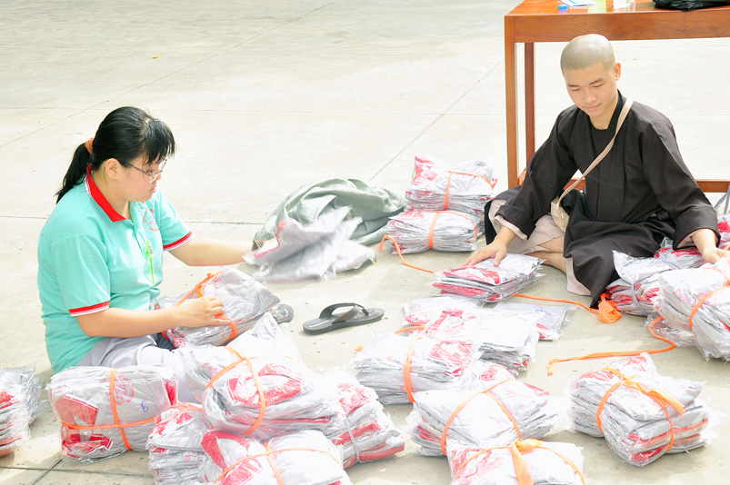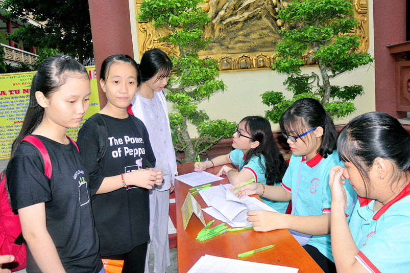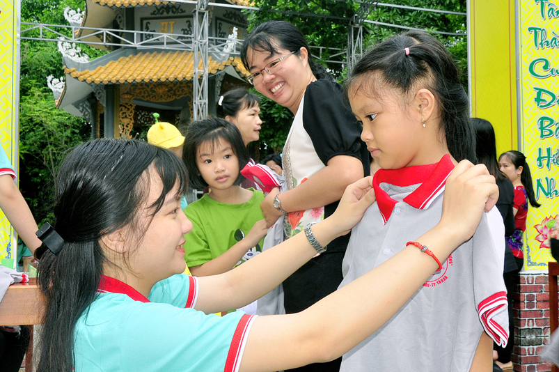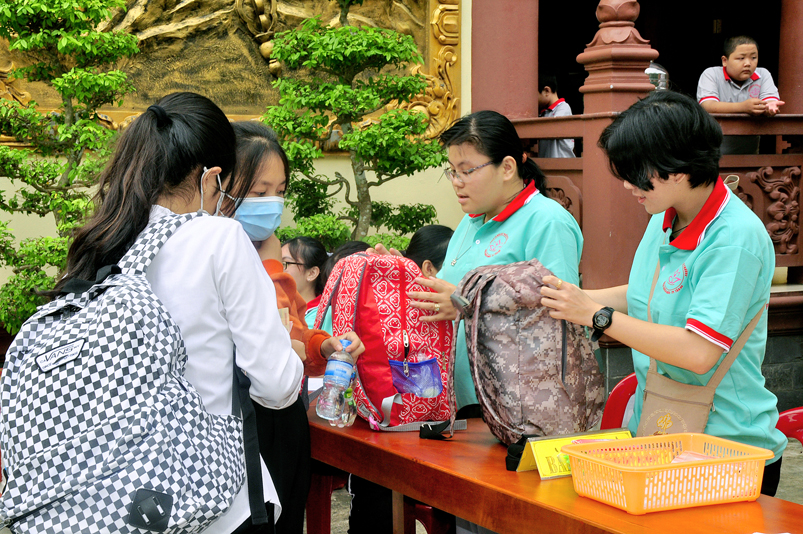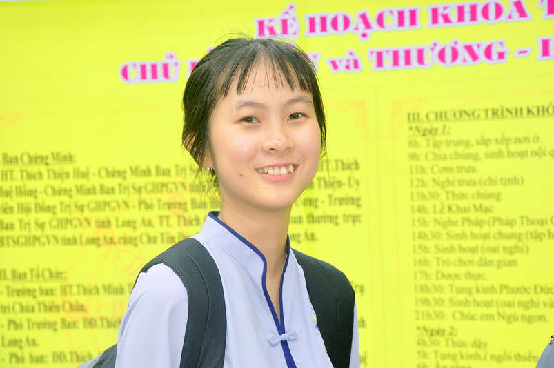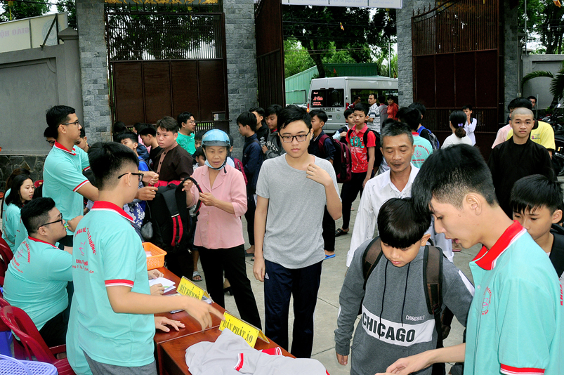 Từ mờ sáng, các em đã vân tập về Thiên Châu trong tâm trạng bồi hồi với nhiều cung bậc cảm xúc khác nhau. Bởi lẽ, có những em đã từng tham gia Khóa tu mùa hè từ những năm trước, hôm nay được trở về chùa cũ, gặp lại bạn xưa nên vui mừng nói cười rộn rã. Bên cạnh đó cũng có những em lần đầu tiên tham dự nên vô cùng bỡ ngỡ, thái độ rụt rè nửa vui nửa sợ. Tuy nhiên nhìn thấy bầu không khí xung quanh tưng bừng nhộn nhịp, các em đã nhanh hòa nhập cùng các bạn; và được quý Thầy Cô cùng các anh chị tình nguyện viên tận tình hướng dẫn đến ghi danh, nhận đồng phục mới, ấm lòng trong tình yêu thương thân thiện.