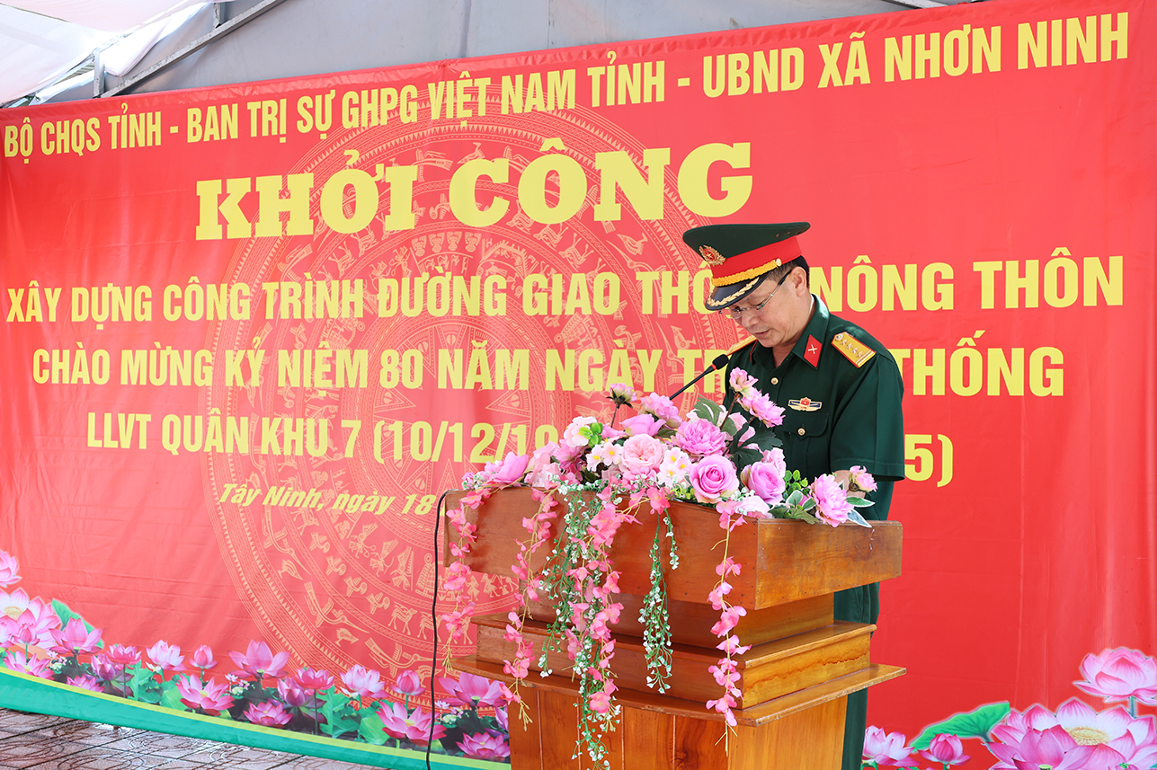 Phát biểu tại lễ khởi công, Đại tá Nguyễn Minh Tấn nhấn mạnh: Công trình là biểu tượng sinh động của tình đoàn kết, gắn bó máu thịt giữa LLVT tỉnh với cấp ủy, chính quyền, Giáo hội Phật giáo và nhân dân địa phương. Mỗi phần việc hôm nay không chỉ góp phần hoàn thiện hạ tầng giao thông, nâng cao đời sống người dân, mà còn là hành động tri ân sâu sắc của cán bộ, chiến sĩ LLVT tỉnh Tây Ninh hướng về truyền thống vẻ vang “Trung thành vô hạn, chủ động sáng tạo, tự lực tự cường, đoàn kết quyết thắng” của Quân khu 7 anh hùng.