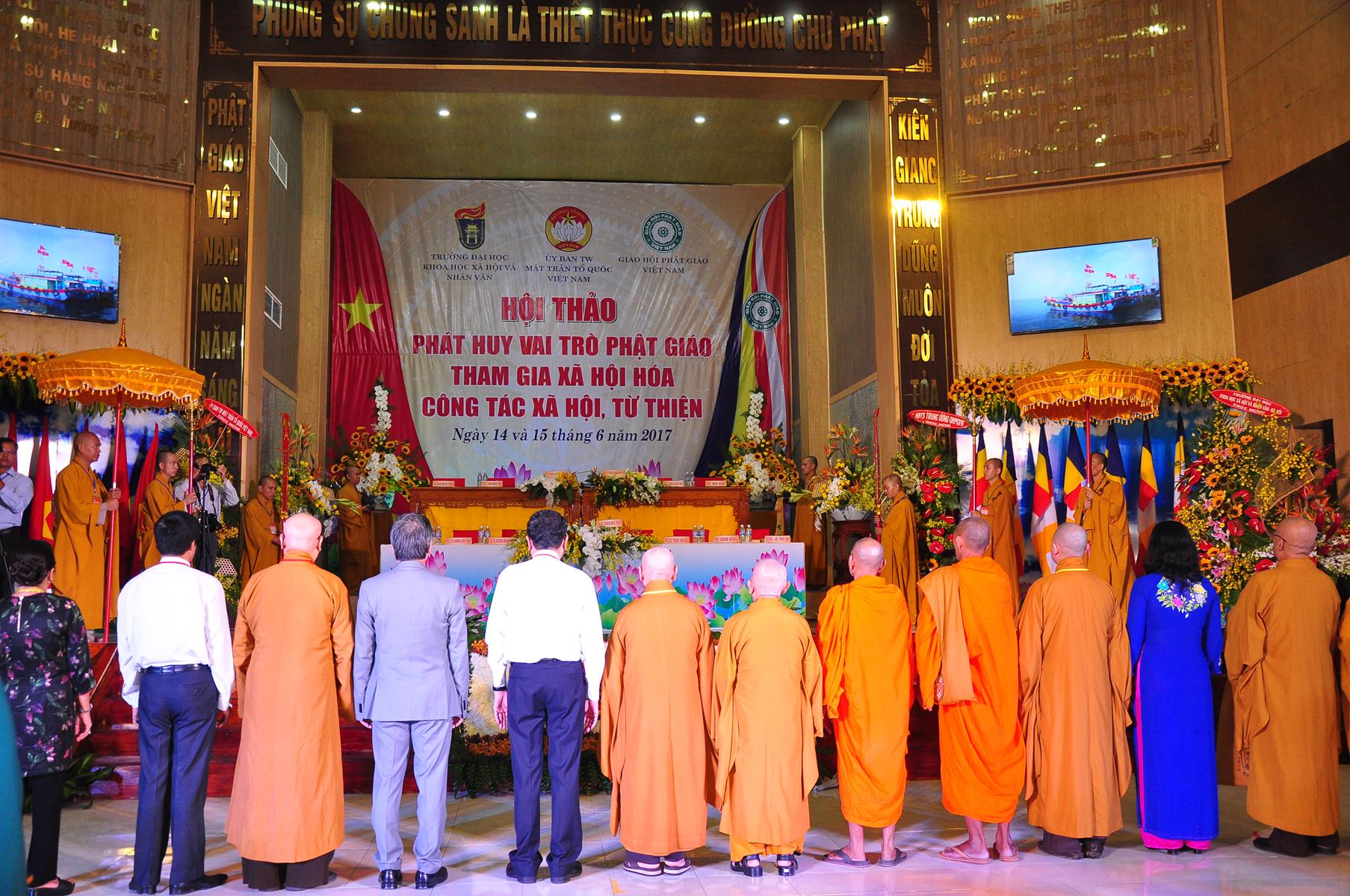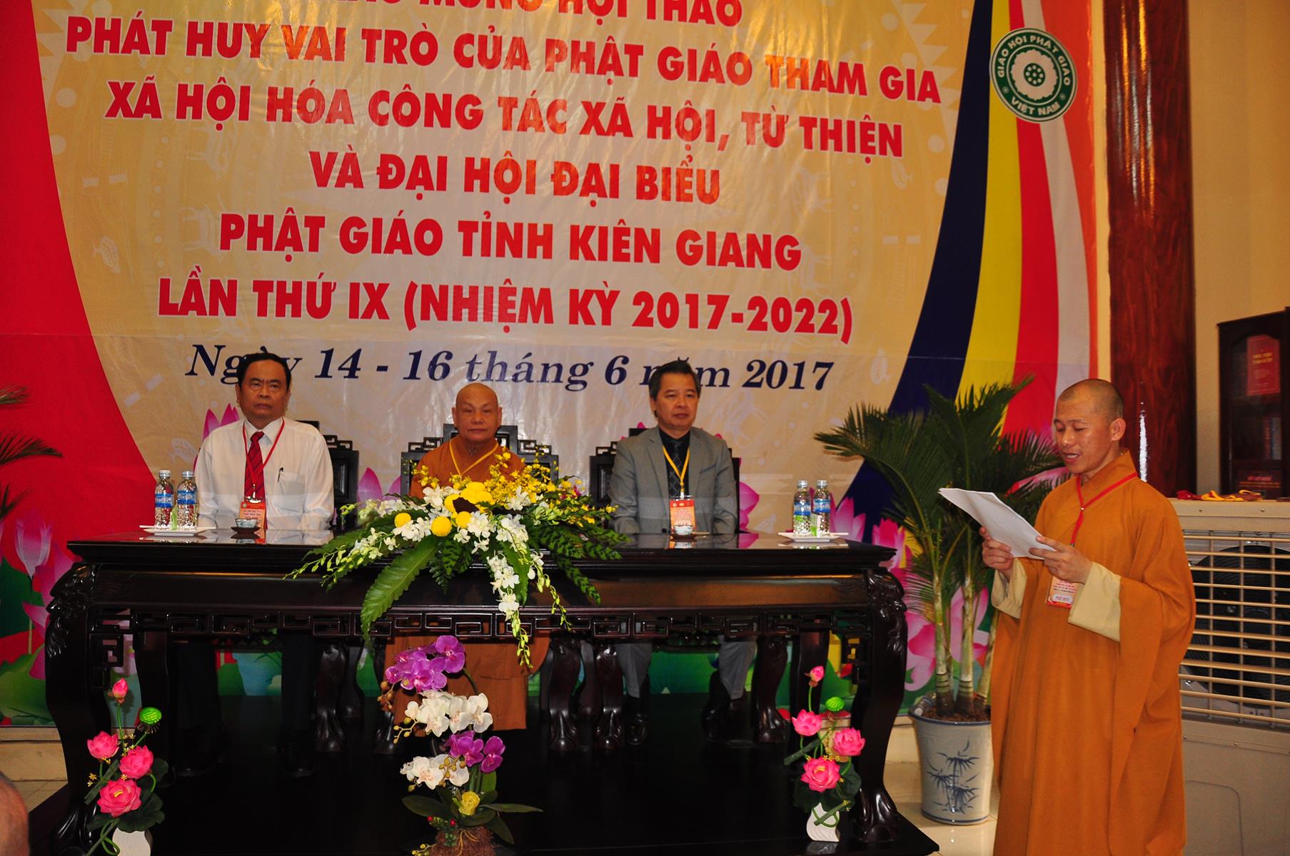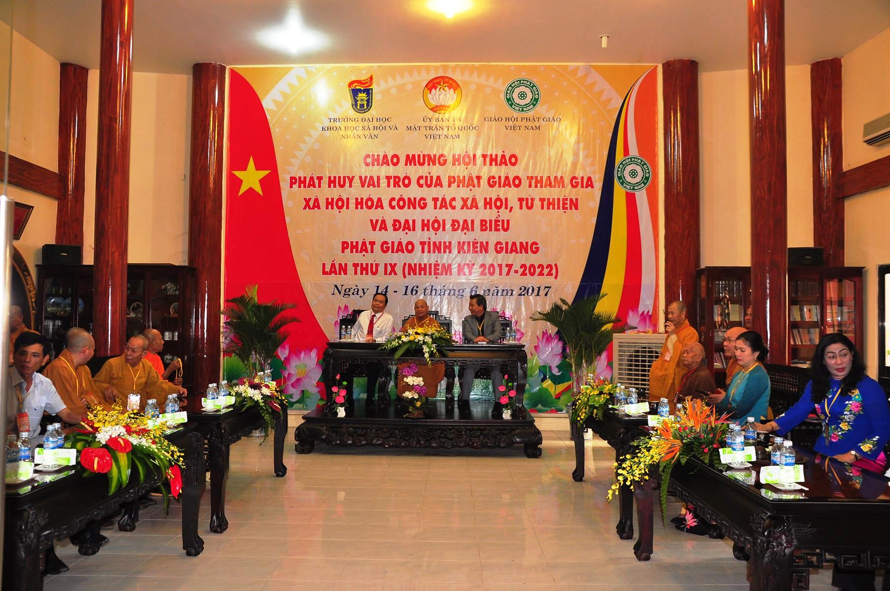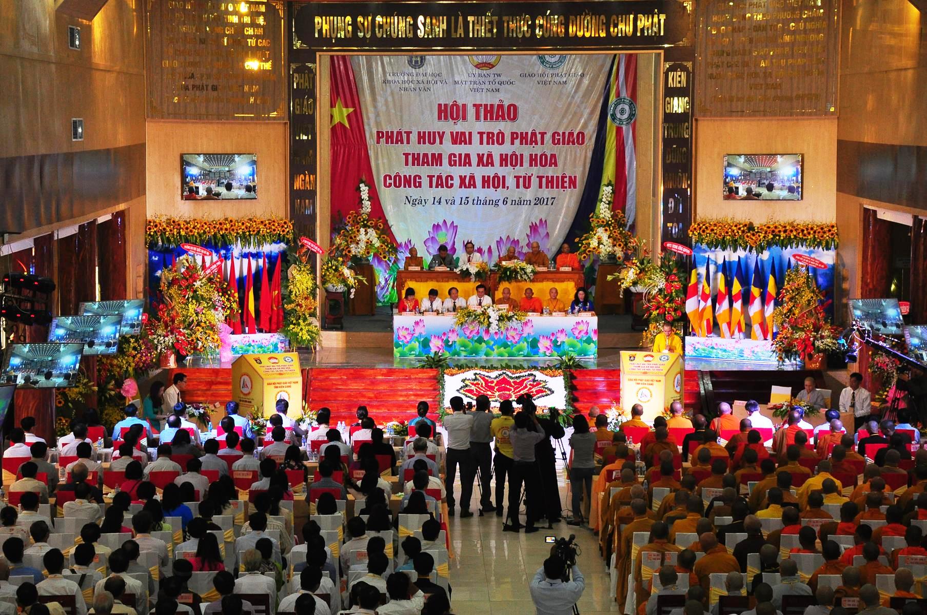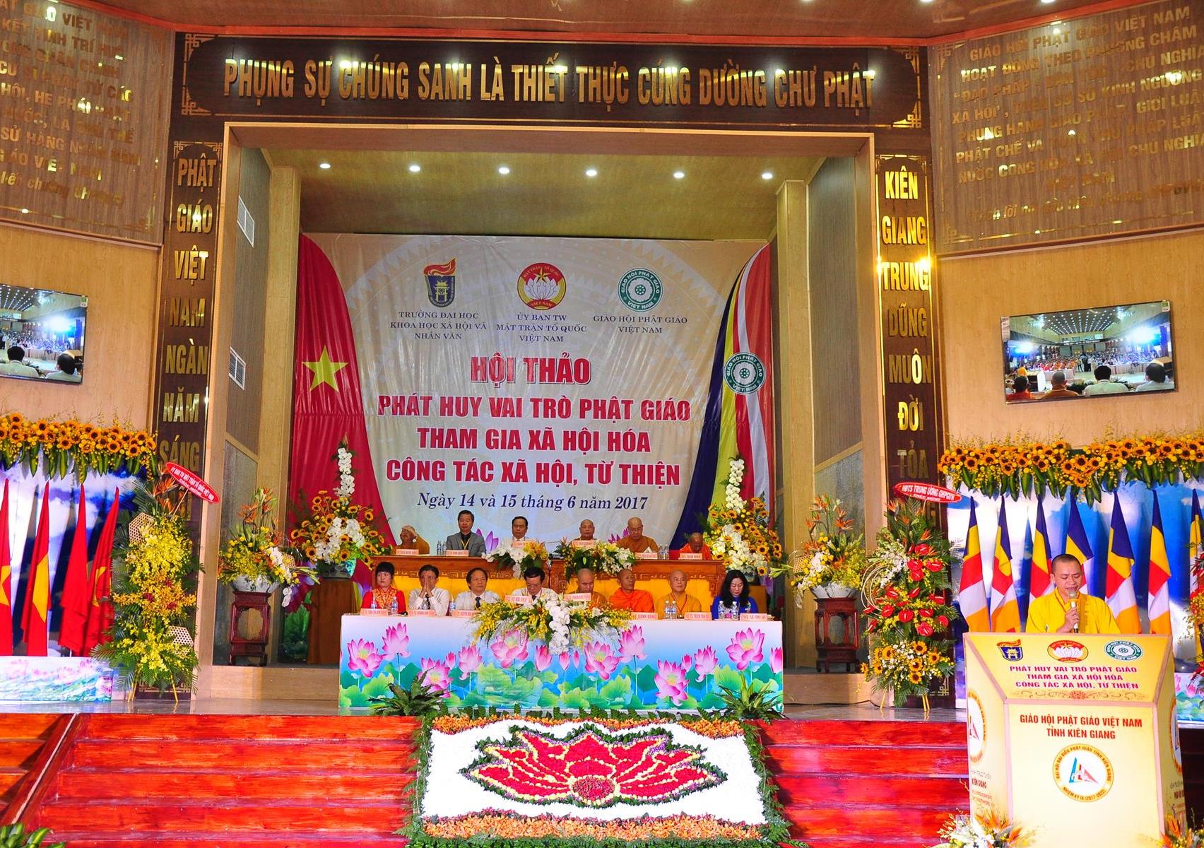 Sáng nay, vào lúc 08 giờ 00 ngày 14 tháng 6 năm 2017 (nhằm 20/5/Đinh Dậu) Giáo hội Phật giáo Việt Nam (Hội đồng Trị sự, Ban Từ thiện Xã hội TƯ, Phật giáo tỉnh Kiên Giang) kết hợp với Ủy ban Trung ương Mặt trận Tổ quốc Việt Nam và Trường Đại học Khoa học Xã hội & Nhân văn Hà Nội khai mạc hội thảo, chủ đề “Phát huy vai trò Phật giáo tham gia xã hội hóa công tác xã hội, từ thiện” tại hội trường Chùa Phật Quang, số 83 Quang Trung, P.Vĩnh Quang, TP. Rạch Giá, tỉnh Kiên Giang.