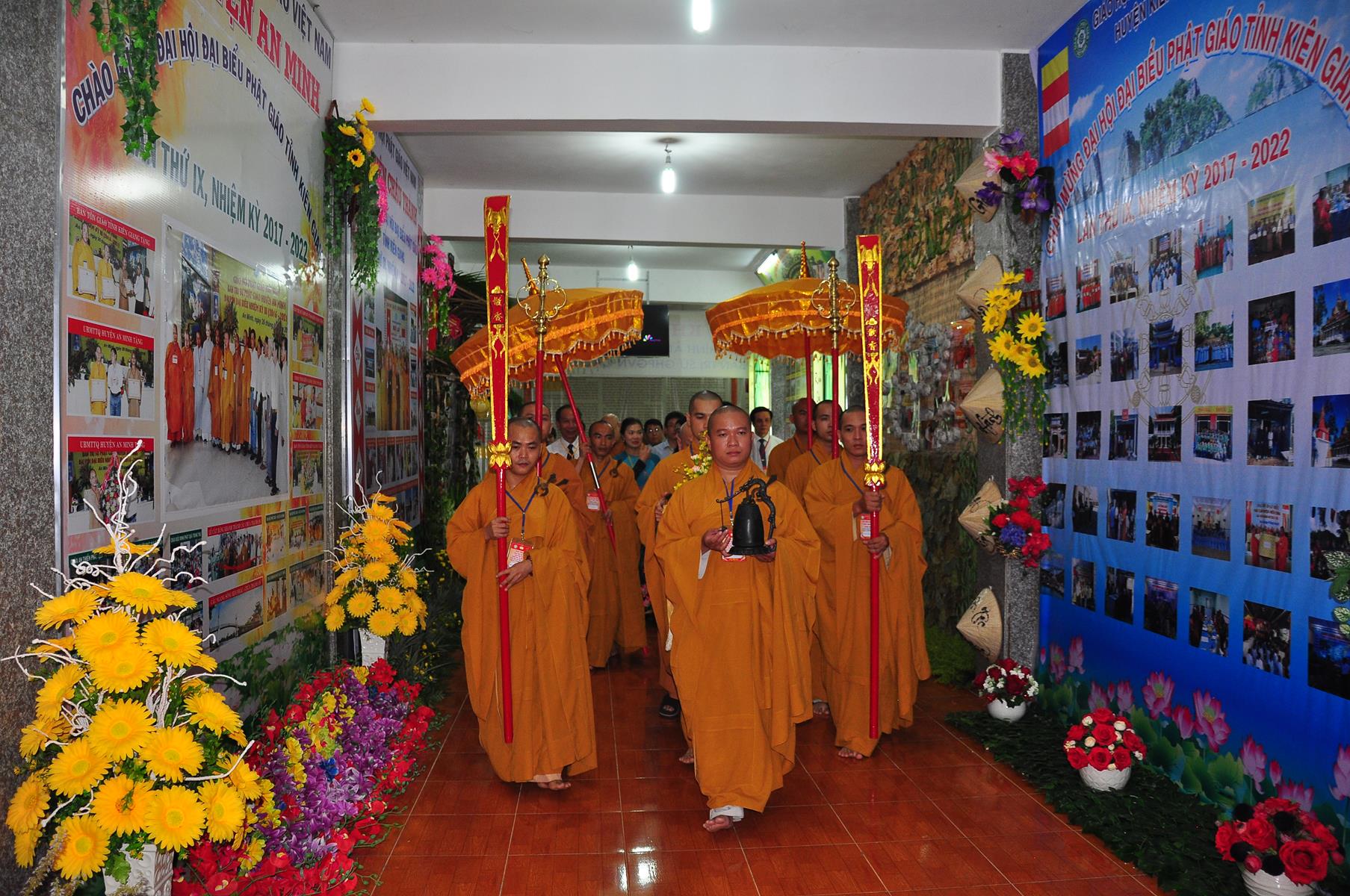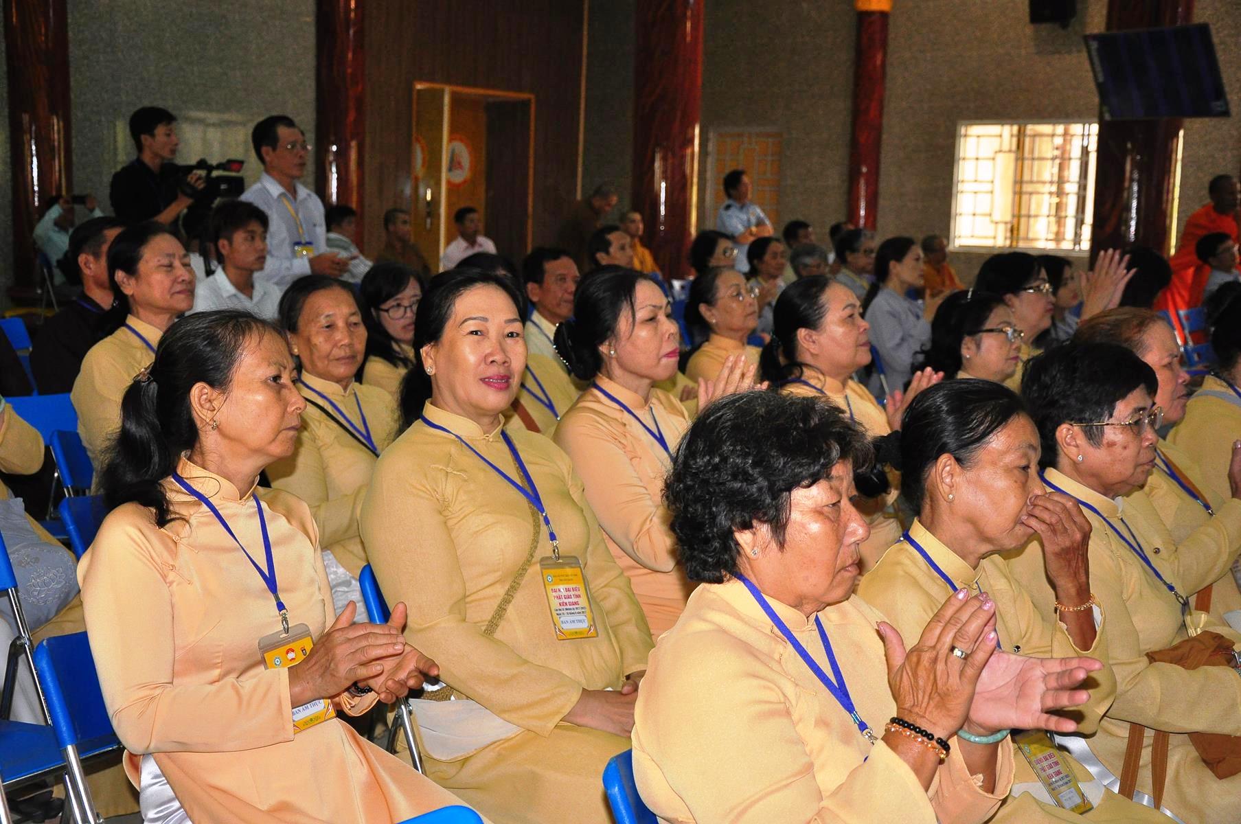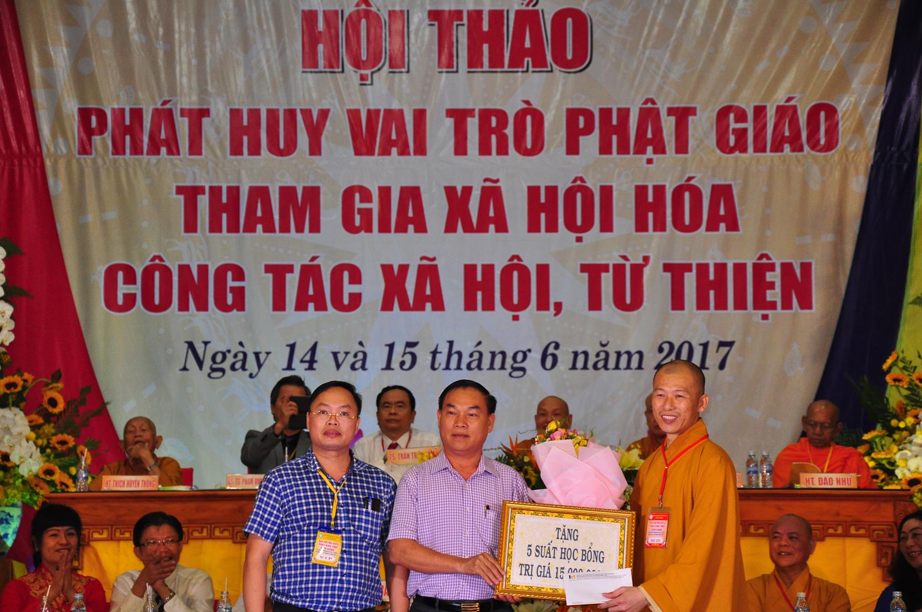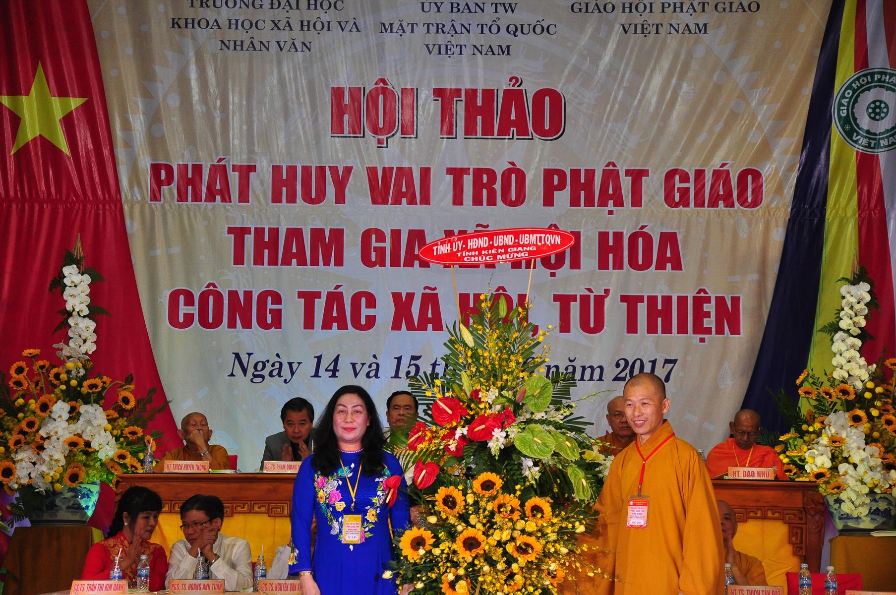 Dịp này, quý đại biểu còn lắng nghe phát biểu chào mừng của lãnh đạo tỉnh Kiên Giang; tập đoàn Mỹ Sơn tặng 5 học bổng trị giá 15 triệu cho lớp cử nhân tôn giáo học chùa Phật Quang, tỉnh Kiên Giang; TT.Thích Minh Nhẫn, Phó ban kiêm Chánh thư ký BTS GHPGVN tỉnh Kiên Giang đón nhận. Nhiều lẵng hoa cũng được gởi đến chúc mừng hội thảo.