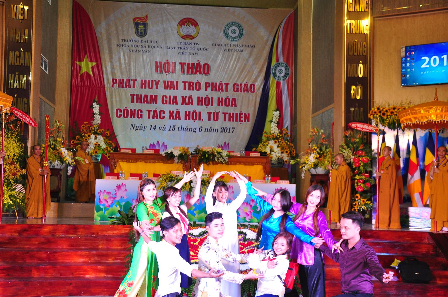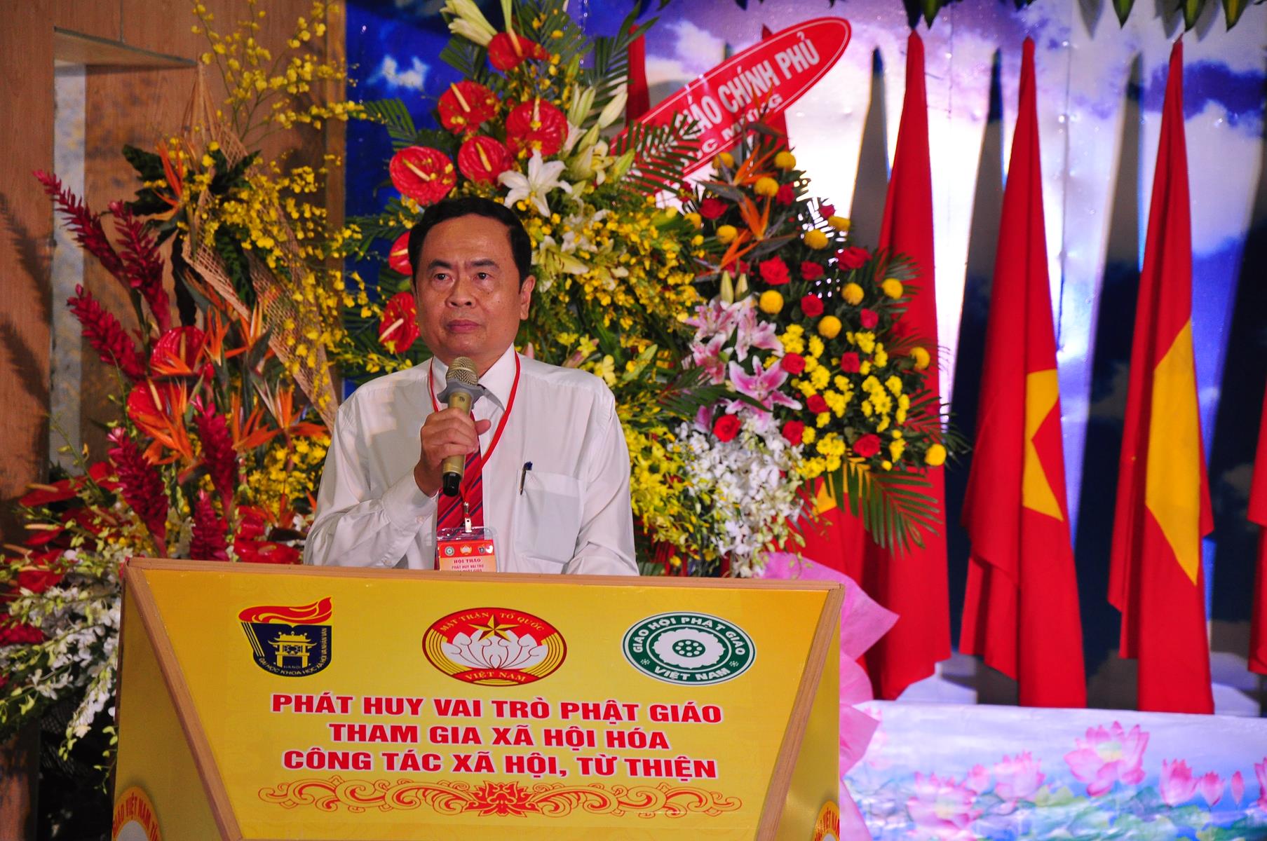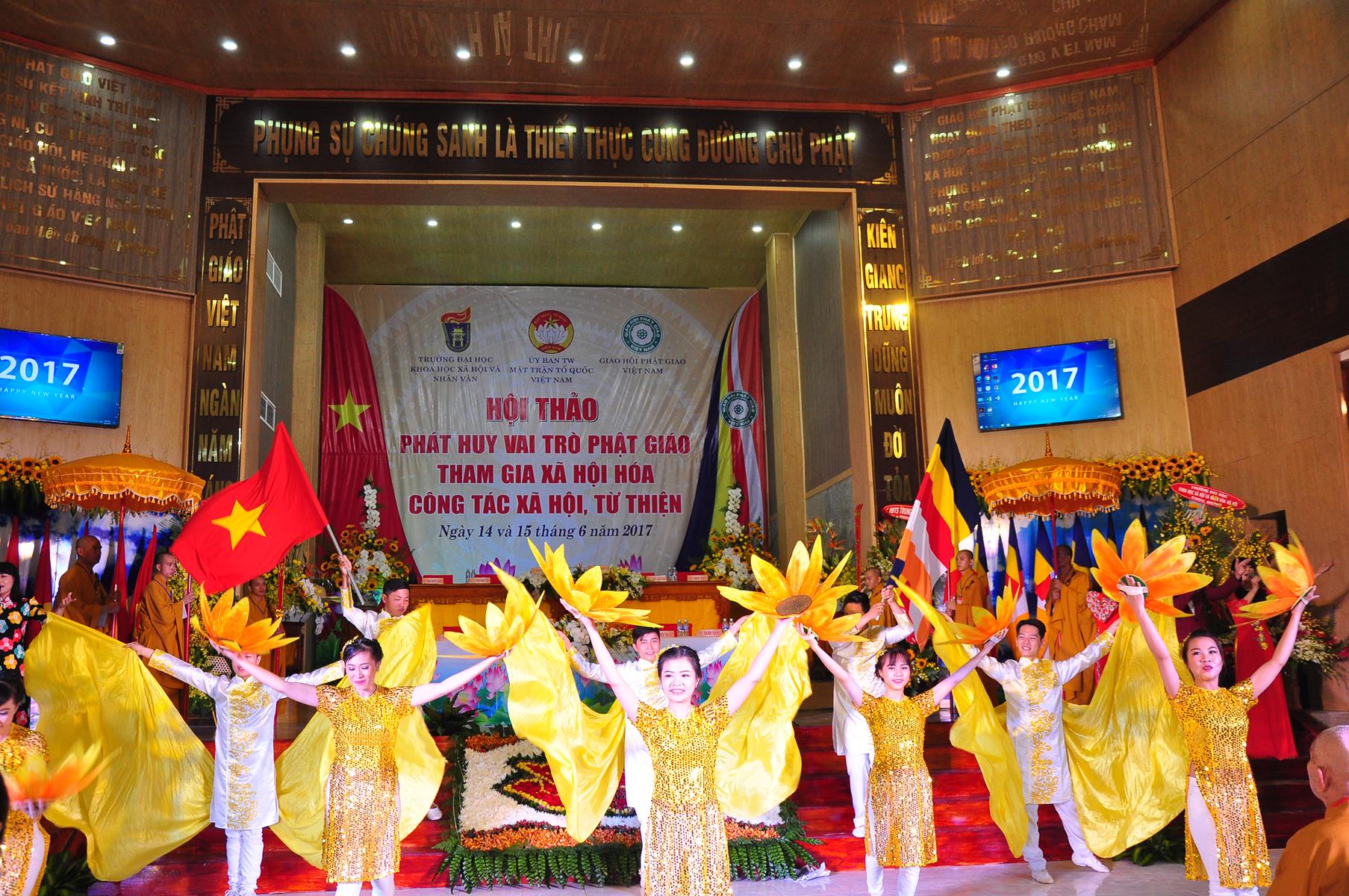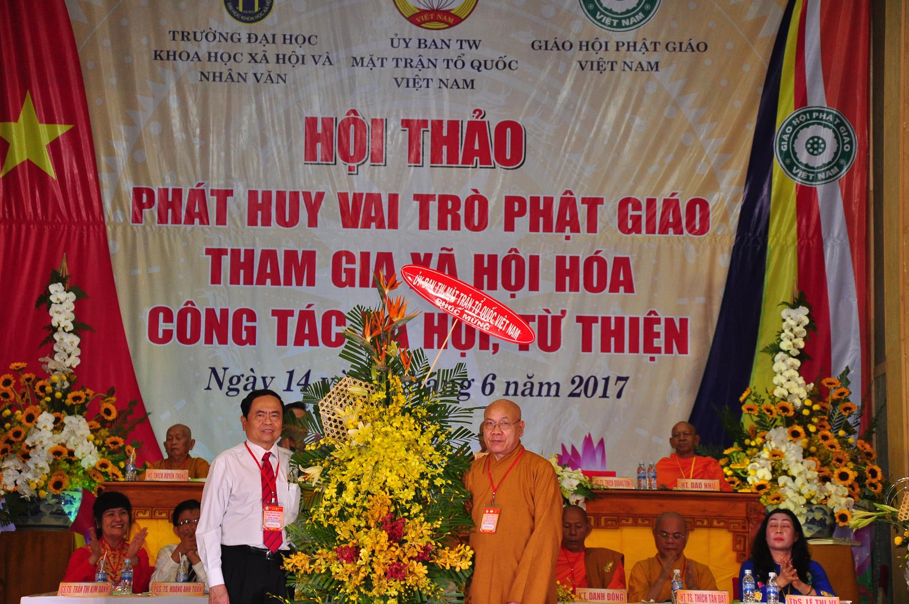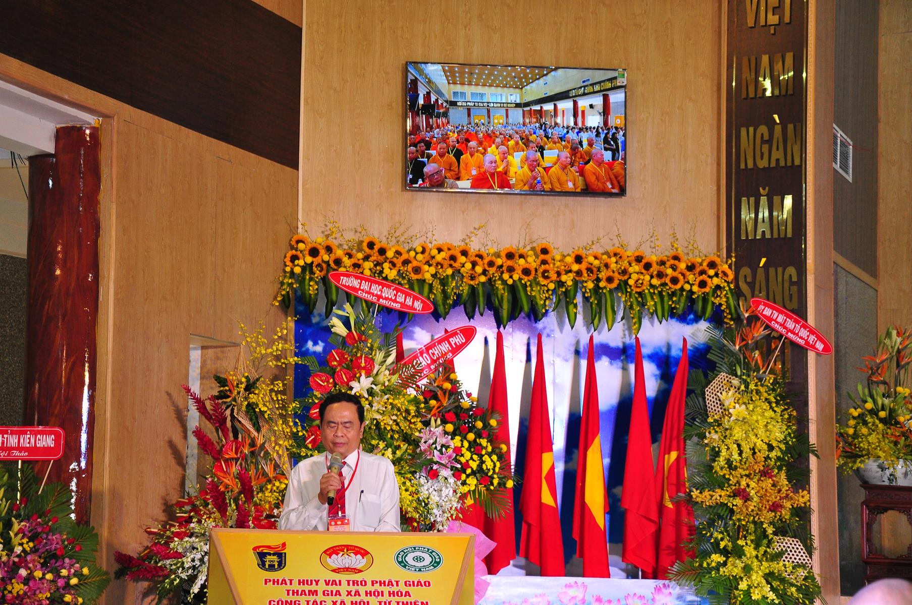Sau chương trình văn nghệ chào mừng hội thảo, nghi thức chào quốc kỳ, đạo kỳ, giới thiệu chương trình và thành phần tham dự, ông TS Trần Thanh Mẫn: Ủy viên Ban Chấp hành TƯ Đảng, Phó Chủ tịch kiêm Tổng Thư ký Ủy ban Trung ương Mặt trận Tổ quốc Việt Nam phát biểu khai mạc. Trên căn bản của những giá trị giáo lý “Lục độ” (Bố thí, Trì giới, Nhẫn nhục, Tinh tấn, Thiền định, Trí huệ) và “Tứ vô lượng tâm” (Từ, bi, hỷ, xả), cùng với truyền thống “Hộ quốc an dân”, đồng hành cùng dân tộc, trong những năm qua, Phật giáo Việt Nam luôn phát huy truyền thống yêu nước, đoàn kết, gắn bó đồng hành cùng dân tộc, sẻ chia trách nhiệm với xã hội và đất nước, tích cực hưởng ứng và tham gia các hoạt động an sinh xã hội, các phong trào thi đua yêu nước, các cuộc vận động do Mặt trận Tổ quốc Việt Nam và các ban, ngành, đoàn thể phát động; góp phần thực hiện tốt chủ trương xã hội hóa các lĩnh vực y tế cơ sở, giáo dục mầm non, hoạt động trợ giúp xã hội, dạy nghề,… của Đảng, Nhà nước.