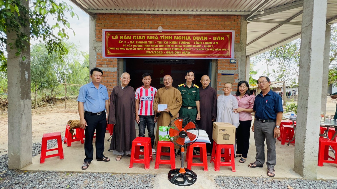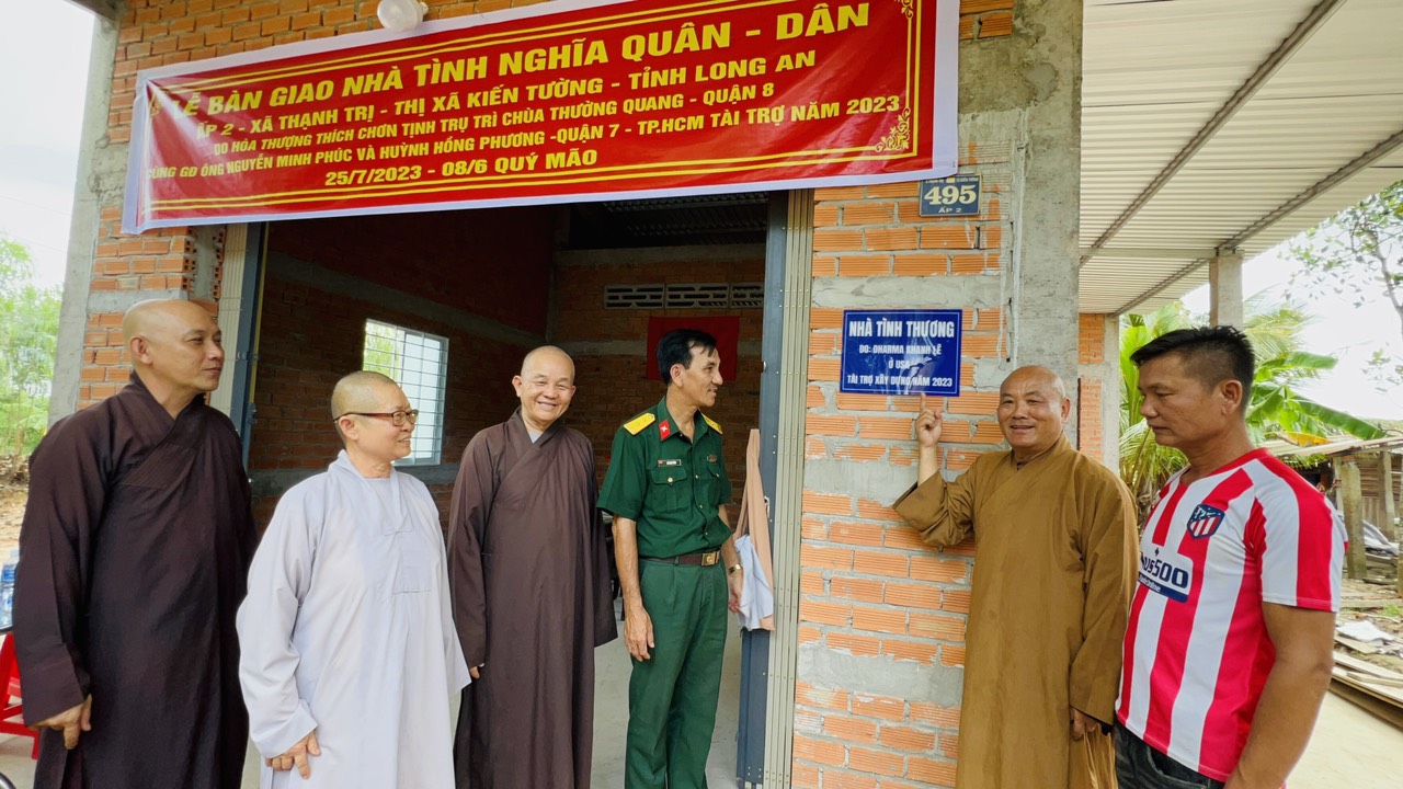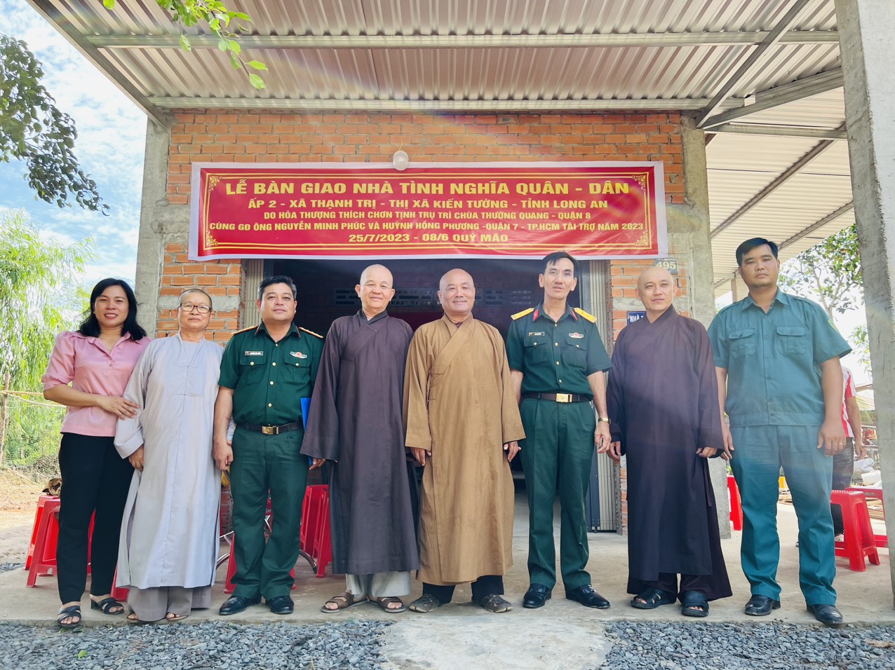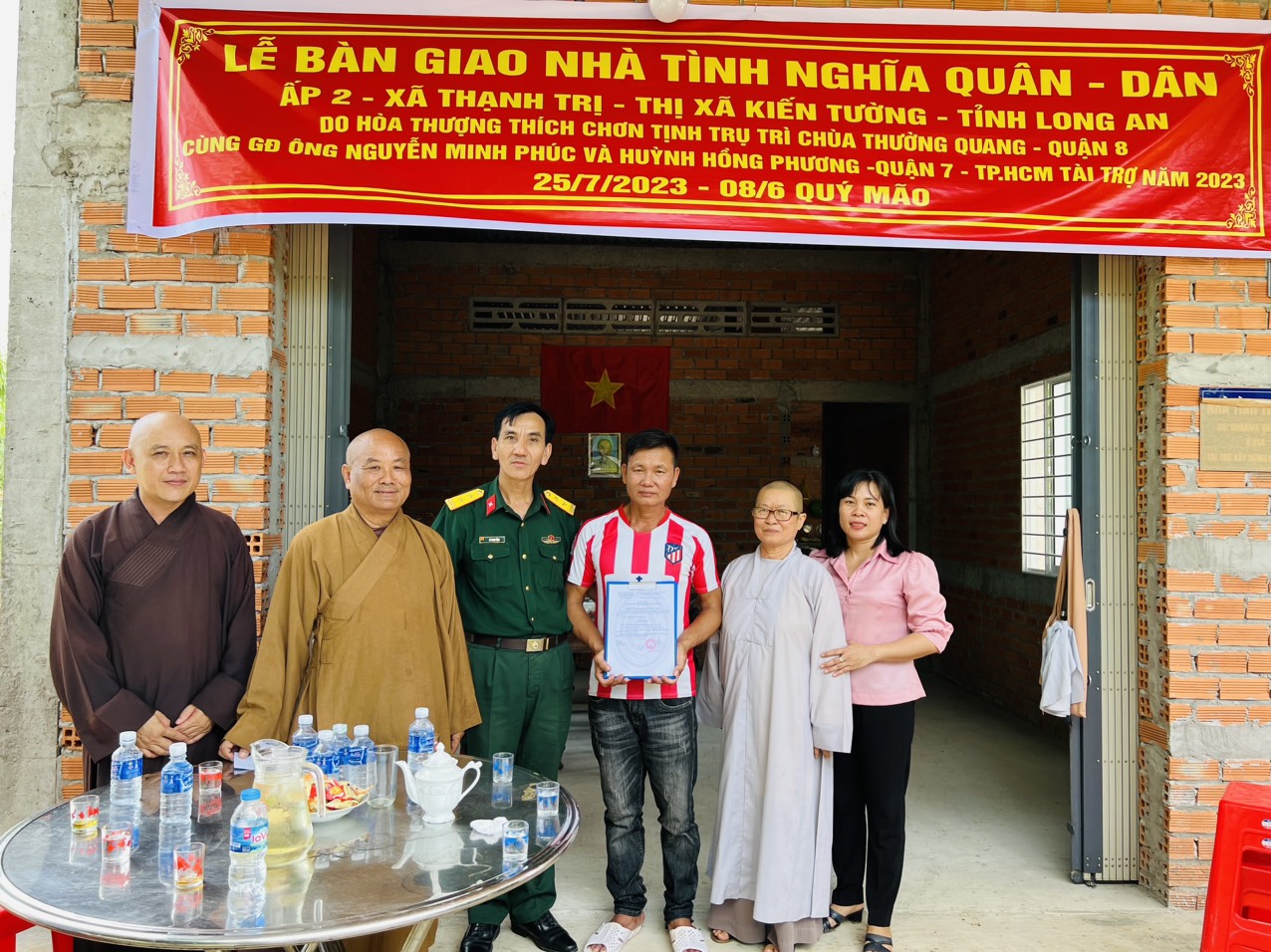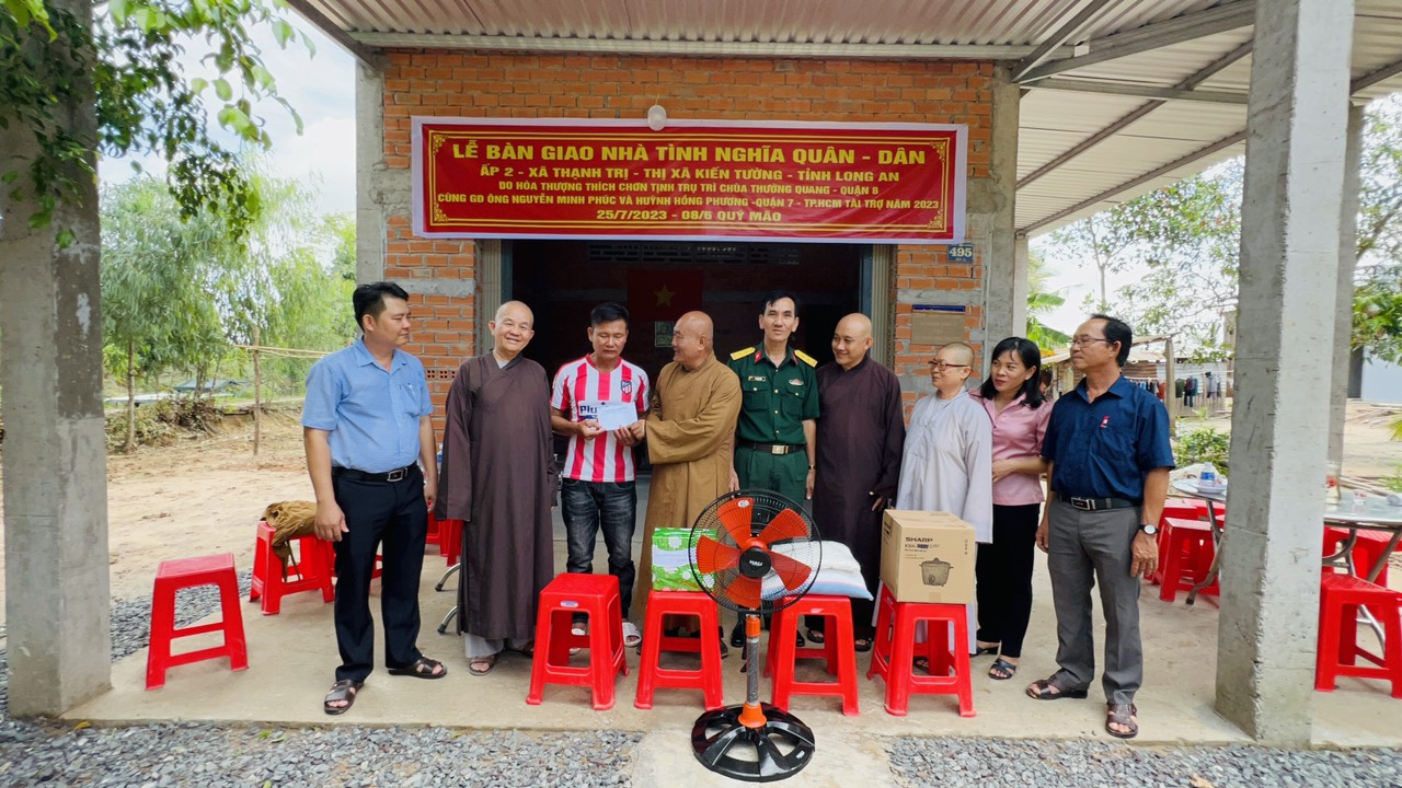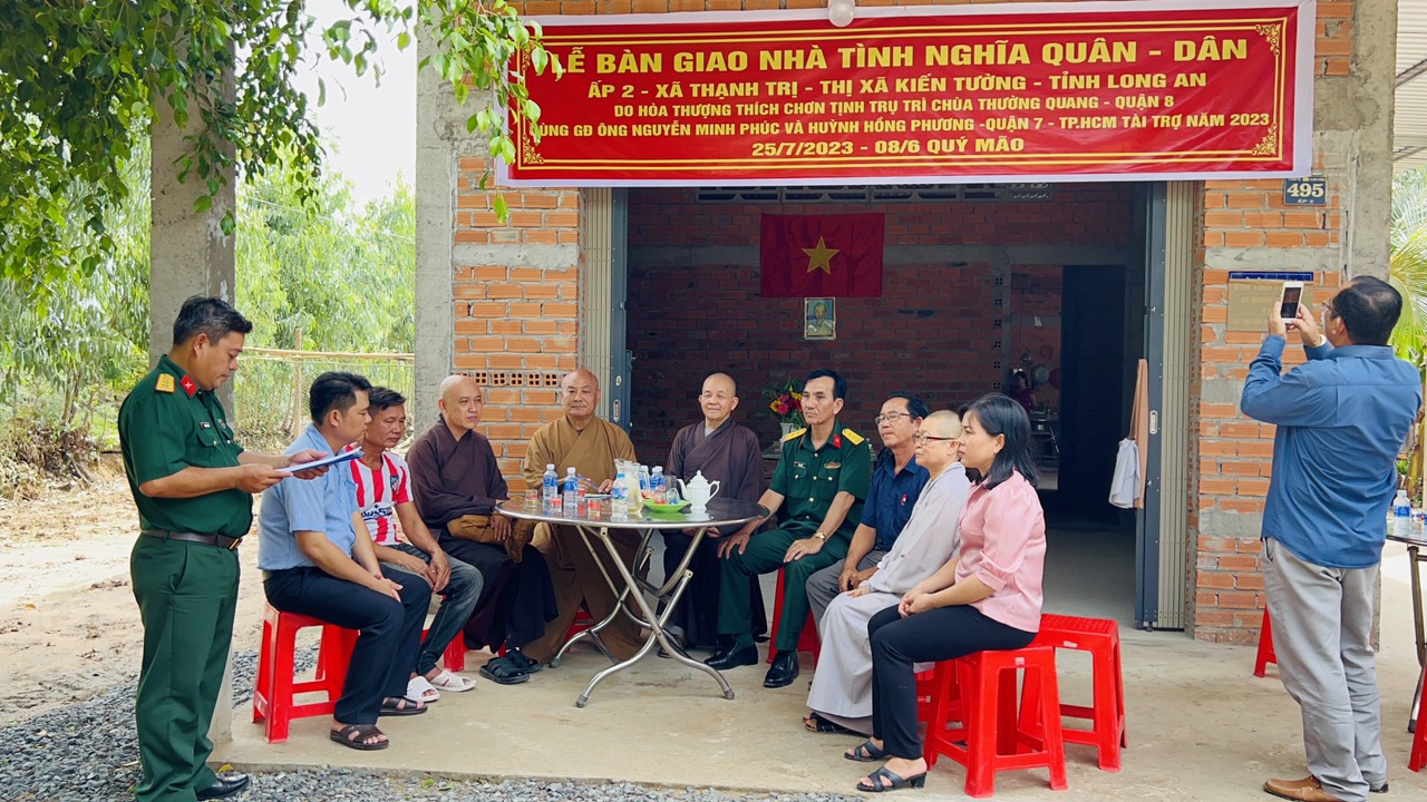 Nhân dịp lễ bàn giao ngôi nhà và cũng là mạnh thường quân cho việc xây dựng ngôi nhà quân dân này, Hoà thượng Thích Chơn Tịnh đã phát biểu: “Chùa Thường Quang, quận 8 TP.HCM có chương trình xây nhà tình thương cho các hộ gia đình gặp khó khăn trong vấn đề nhà ở. Mỗi năm có 40 đến 50 căn nhà được xây dựng. Hôm nay, được sự giới thiệu của Ni sư chùa Tường Vân và Hoà thượng Thích Minh Thiện để xây dựng một căn nhà quân dân tại xã Thạnh trị, thị xã Kiến Tường cho anh Lê Văn Long, một hộ khó khăn về nhà ở và cũng là bộ độ phục viên.
