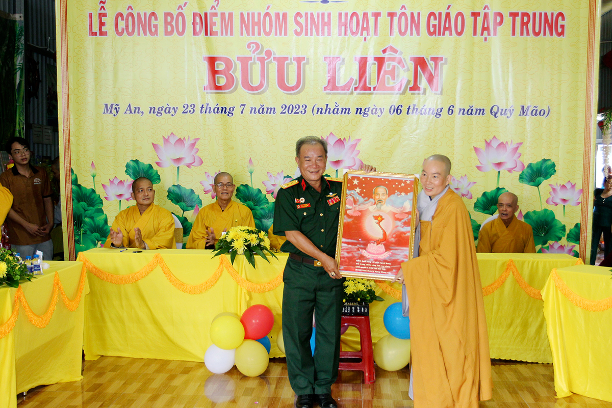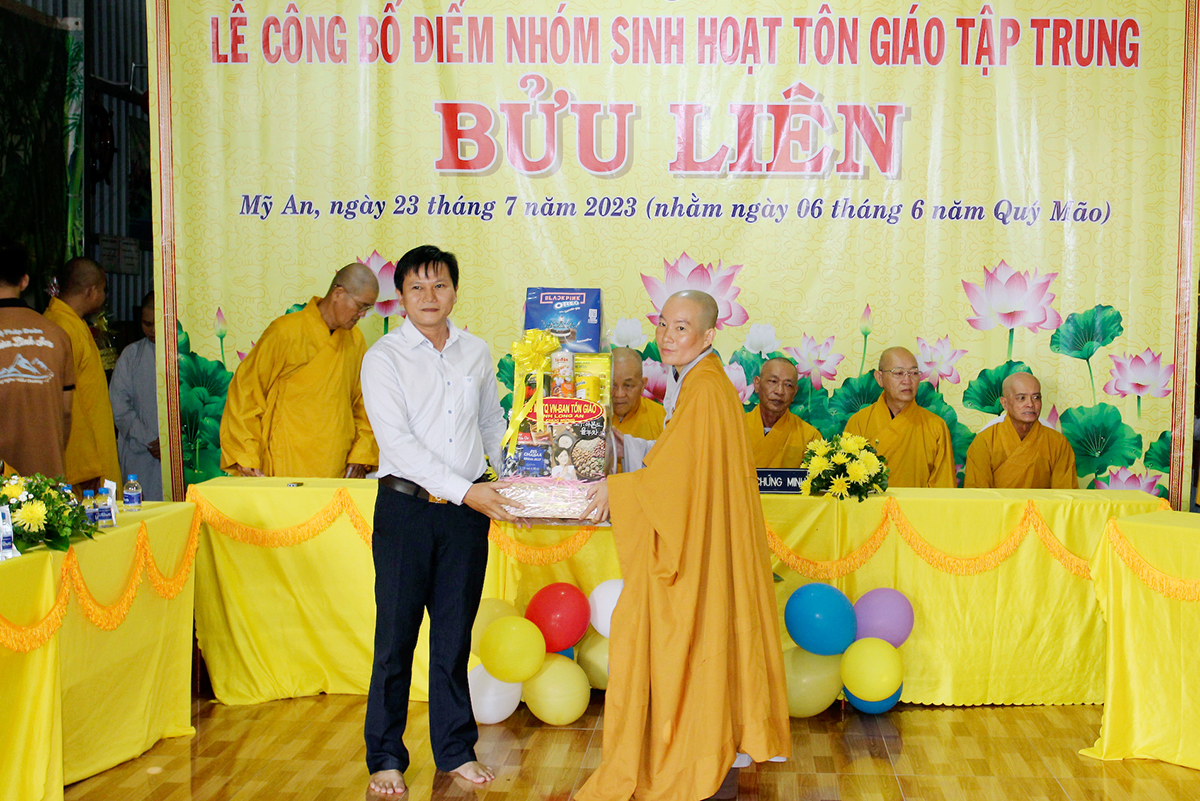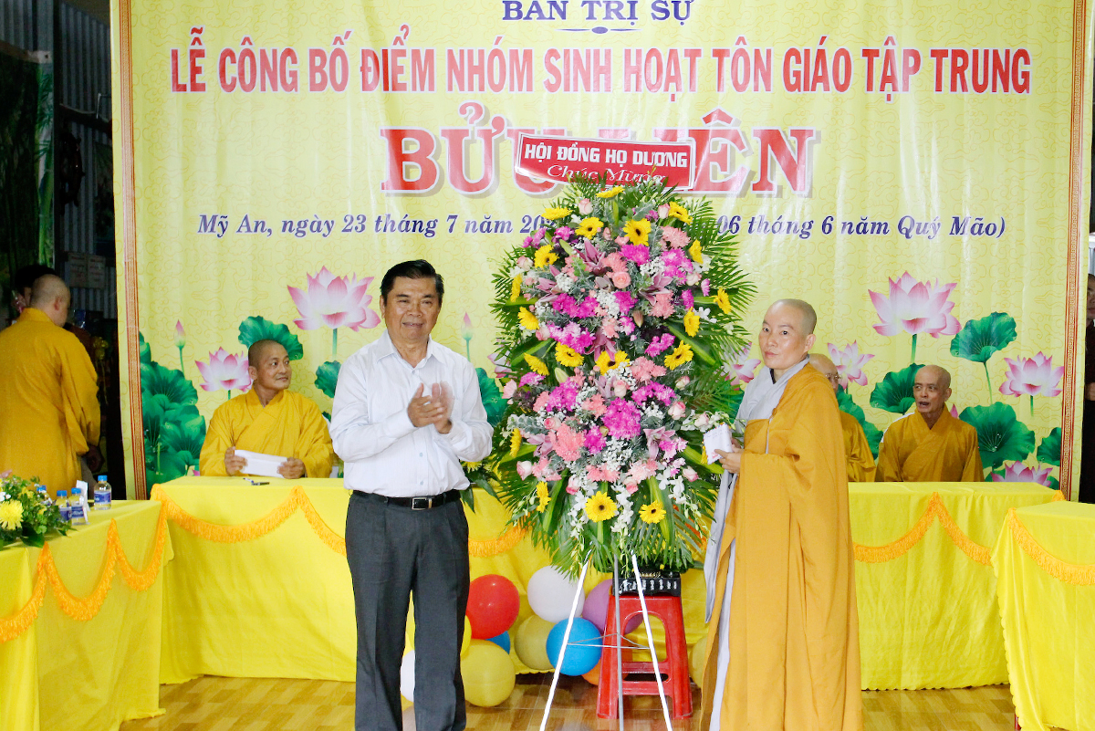 Bà Bùi Thị Trúc Linh – Phó Chủ tịch UBND xã Mỹ An đã thay lời cho lãnh đạo chính quyền địa phương có lời chúc mừng điểm nhóm sinh hoạt tập trung Bửu Liên đã đủ điều kiện thành lập và Bà cũng nêu lên sự đóng góp của Phật giáo tỉnh huyện nhà trong suốt thời gian đồng thời bà mong muốn BTS và quý vị lãnh đạo của điểm nhóm sinh hoạt hãy thực hiện tốt những nội dung, chấp hành những chủ trương, đường lối, quy định về điểm nhóm sinh hoạt Tôn giáo tập trung, cùng chung tay với lãnh đạo xã thực hiện tốt công tác an ninh trật tự về trong công tác tôn giáo trên địa bàn xã. Bà đã khép lại lời phát biểu của mình với những lời chúc tốt đẹp nhất.