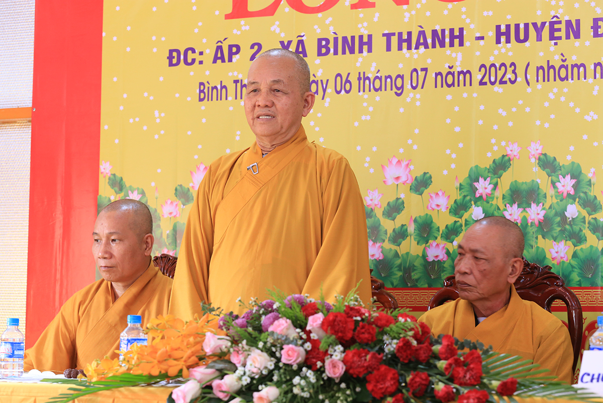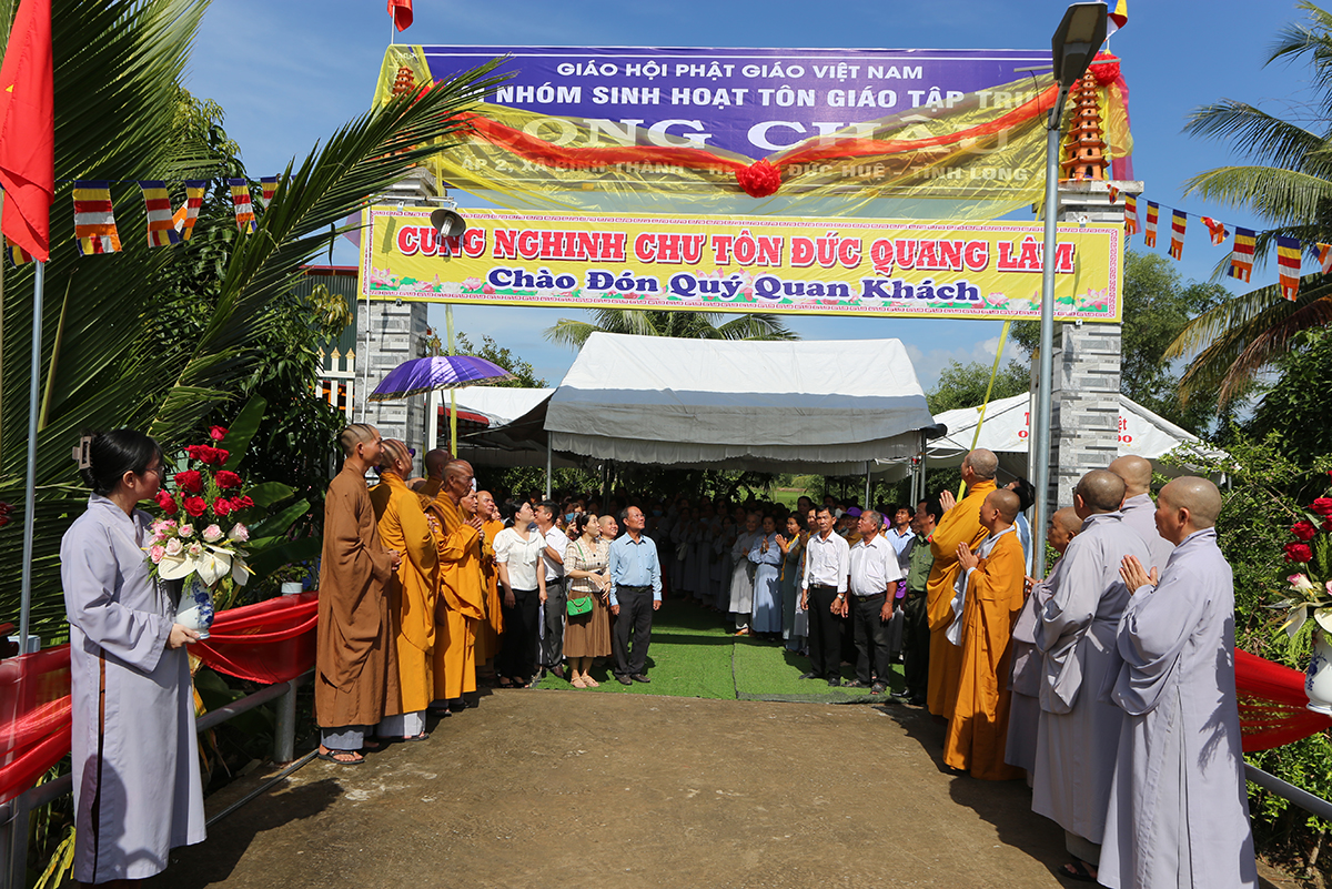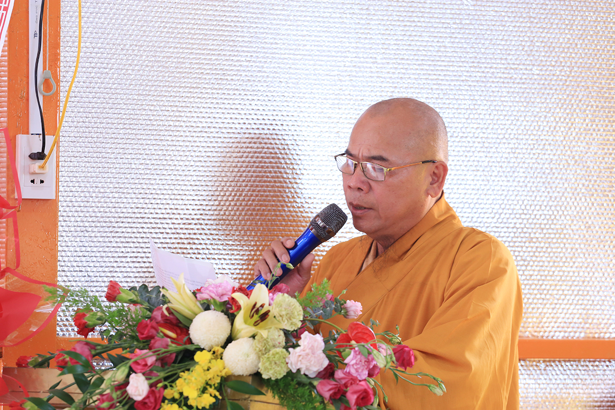 Ban lời đạo từ, Hòa thượng Thích Minh Thiện – Uỷ viên Hội Đồng Trị Sự trung ưng, Trưởng BTS GHPGVN tỉnh Long An gửi lời tri ân sâu sắc đến Mặt Trận tổ quốc, Ban Tôn giáo, Ban Dân vận tỉnh – huyện cùng các cơ quan chức năng hữu quan đã tạo điều kiện cho Phật giáo có được thêm một điểm nhóm sinh hoạt tập trung. Hòa thượng nhắc lại truyền thống văn hóa Phật giáo nước nhà mấy ngàn năm lịch sử luôn đồng hành cùng Dân tộc. Đặc biệt nói về việc Phát triển Phật giáo ở huyện Đức Huệ, vùng đất giáp biên giới chịu nhiều thiệt hại do chiến tranh còn để lại là tích cực đền ơn đồng bào địa phương Đức Huệ.