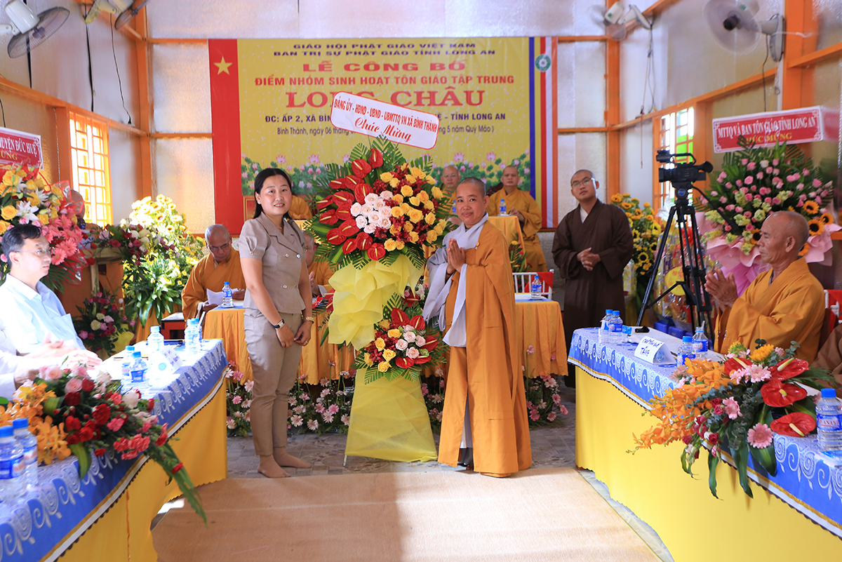 Bà Nguyễn Thị Ngọc Thảo, Phó Chủ tịch UBND xã Bình Thành đã thay lời cho lãnh đạo Chính quyền địa phương có lời chúc mừng tốt đẹp điểm nhóm sinh hoạt tập trung Long Châu đã đủ điều kiện thành lập; Bà mong BTS GHPGVN huyện Đức Huệ và quý vị lãnh đạo của điểm nhóm sinh hoạt Long Châu thực hiện tốt những nội dung được đăng ký, chấp hành những chủ trương, đường lối, quy định về sinh hoạt Tôn giáo, cùng chung tay với lãnh đạo xã thực hiện tốt công tác an ninh trật tự trong công tác Tôn giáo trên địa bàn xã.