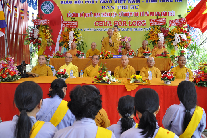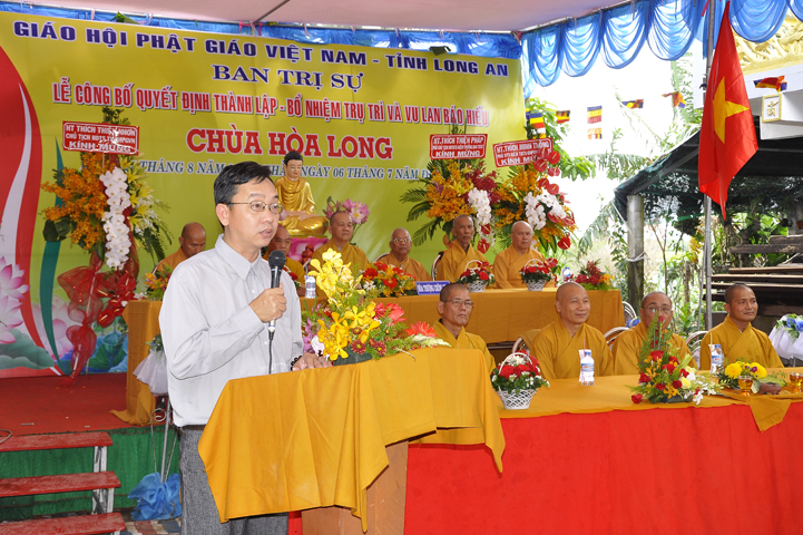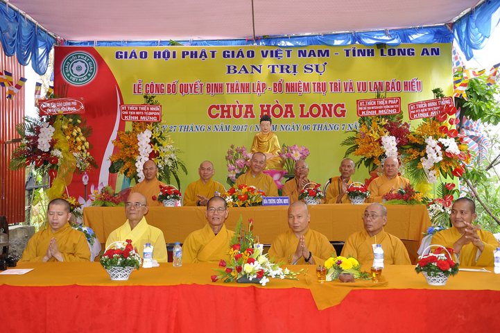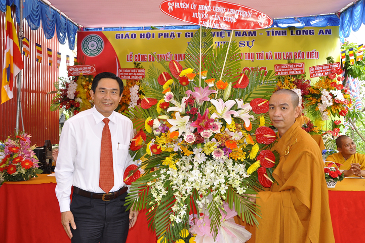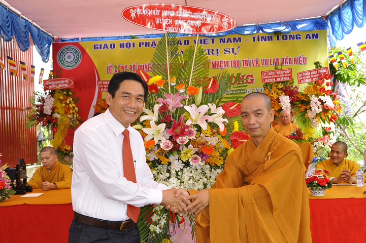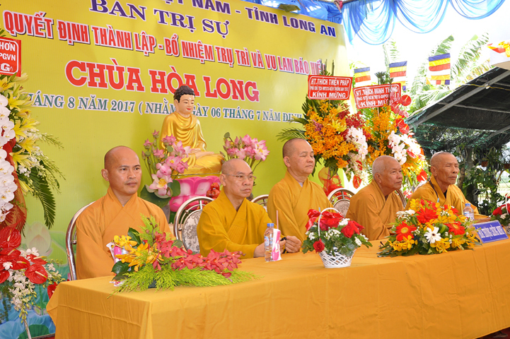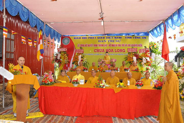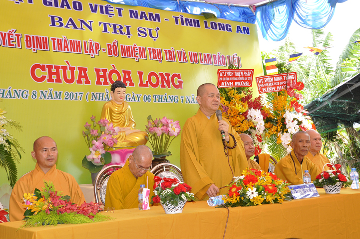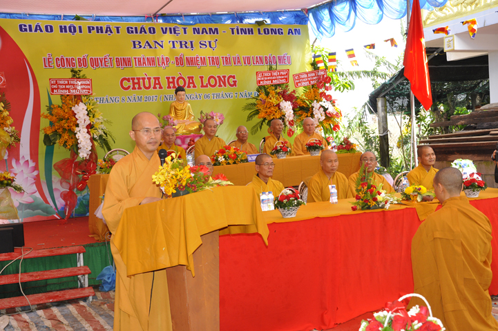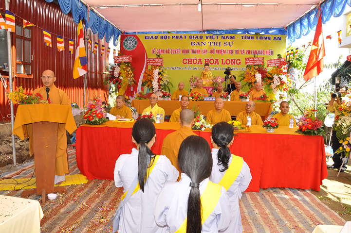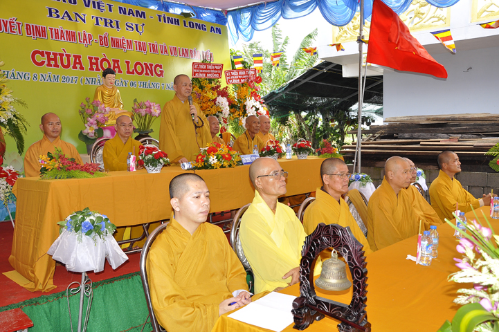 Buổi lễ được Hòa thượng Minh Thiện: Ủy viên Hội đồng Trị sự, Phó ban Hoằng pháp Trung ương Giáo hội Phật giáo Việt Nam, Trưởng ban Trị sự Giáo hội Phật giáo Việt Nam tỉnh Long An từ bi ban đạo từ cho buổi lễ quyết định thành lập cơ sở thờ tự tôn giáo và quyết định bổ nhiệm trụ trì. Trong lời đạo từ, Hòa thượng tán thán và yên tâm hạnh nguyện của Đại đức tân trụ trì. Hòa thượng cũng nhắc nhở tân trụ trì thực hiện đúng Hiến pháp, luật pháp Nhà nước đồng thời cũng tuân thủ nghiêm hiến chương, Nội quy Tăng sự Giáo hội Phật giáo Việt Nam và bản nguyện của đệ tử Phật. Hòa thượng nhấn mạnh truyền thống của một ngôi chùa là sự hòa hợp đoàn kết dân tộc, giữ gìn cơ sở văn hóa tâm linh của toàn xã hội, phát huy con đường tu học Giới Định Tuệ, góp phần xây dựng Chánh tín Phật giáo. Đồng thời Hòa thượng cũng gởi gấm sự trợ duyên của các Phật tử hướng đến thầy tân trụ trì vì đó cũng là sứ mệnh của Phật tử “ Phật Pháp xương minh, doTăng-già hoằng hóa Thiền môn hưng thịnh, nhờ thiện tín phát tâm”.