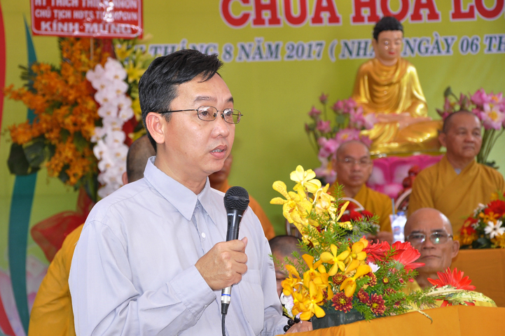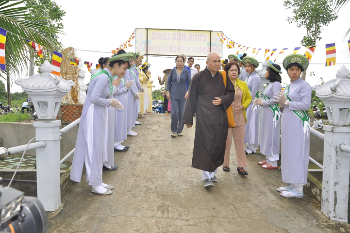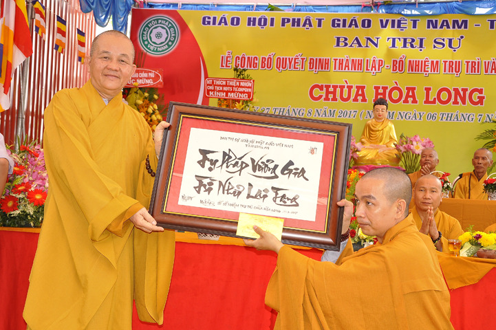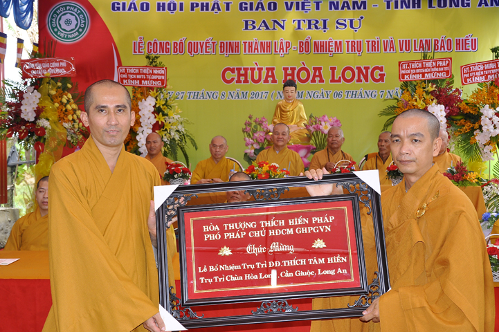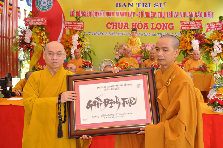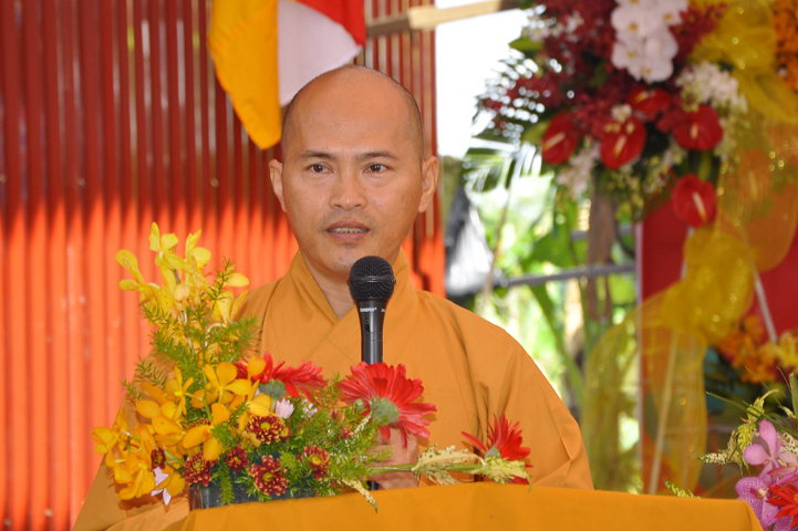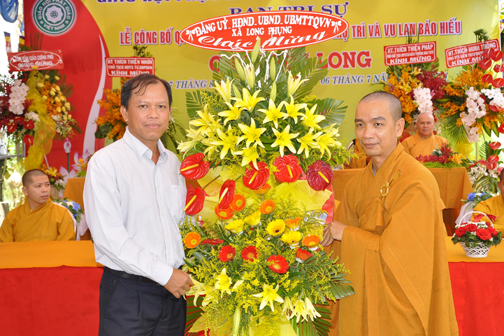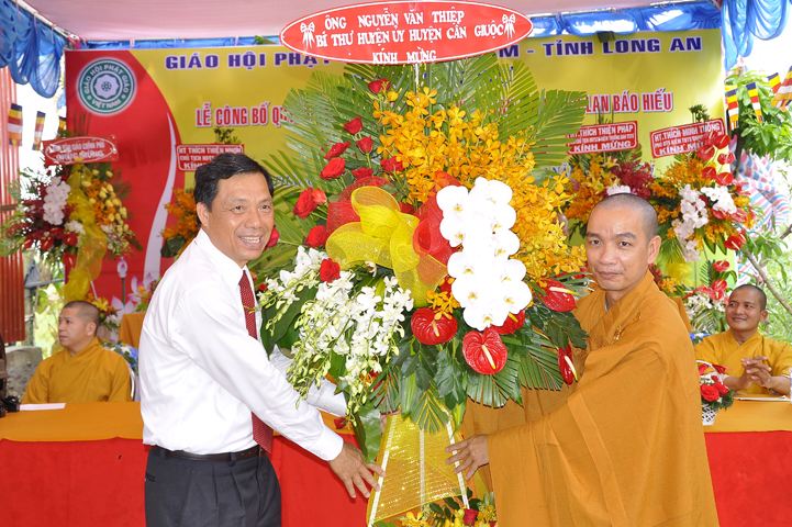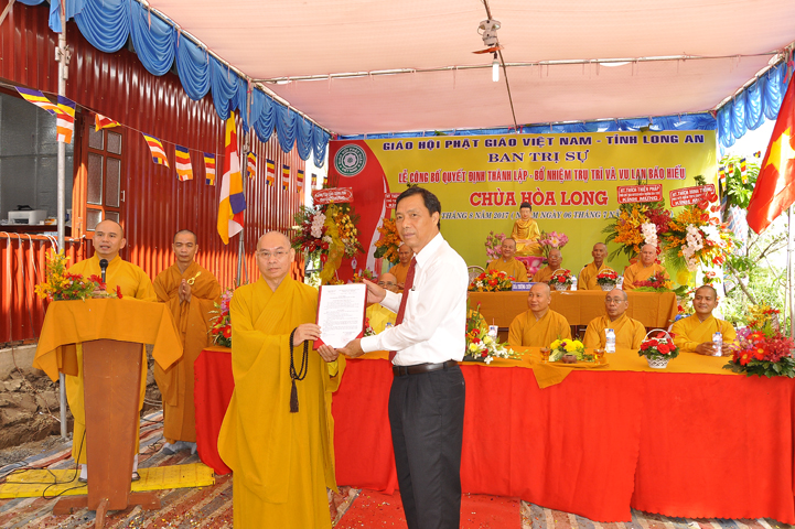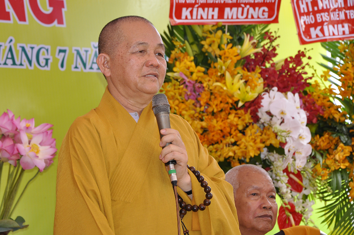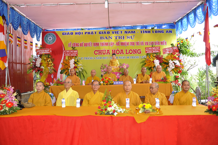 Buổi lễ được Hòa thượng Minh Thiện: Ủy viên Hội đồng Trị sự, Phó ban Hoằng pháp Trung ương Giáo hội Phật giáo Việt Nam, Trưởng ban Trị sự Giáo hội Phật giáo Việt Nam tỉnh Long An từ bi ban đạo từ cho buổi lễ quyết định thành lập cơ sở thờ tự tôn giáo và quyết định bổ nhiệm trụ trì. Trong lời đạo từ, Hòa thượng tán thán và yên tâm hạnh nguyện của Đại đức tân trụ trì. Hòa thượng cũng nhắc nhở tân trụ trì thực hiện đúng Hiến pháp, luật pháp Nhà nước đồng thời cũng tuân thủ nghiêm hiến chương, Nội quy Tăng sự Giáo hội Phật giáo Việt Nam và bản nguyện của đệ tử Phật. Hòa thượng nhấn mạnh truyền thống của một ngôi chùa là sự hòa hợp đoàn kết dân tộc, giữ gìn cơ sở văn hóa tâm linh của toàn xã hội, phát huy con đường tu học Giới Định Tuệ, góp phần xây dựng Chánh tín Phật giáo. Đồng thời Hòa thượng cũng gởi gấm sự trợ duyên của các Phật tử hướng đến thầy tân trụ trì vì đó cũng là sứ mệnh của Phật tử “ Phật Pháp xương minh, doTăng-già hoằng hóa Thiền môn hưng thịnh, nhờ thiện tín phát tâm”.