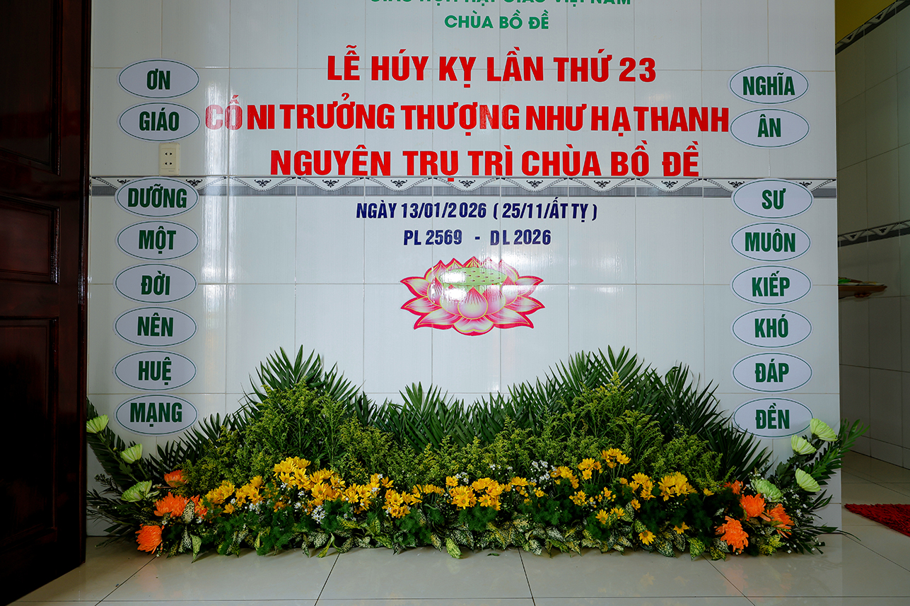 Sáng ngày 13/01/2026 (nhằm ngày 25/11/Ất Tỵ), môn đồ pháp quyến chùa Bồ Đề, phường Long An, tỉnh Tây Ninh đã trang nghiêm tổ chức Lễ Húy kỵ lần thứ 23 Cố Ni Trưởng Thích Nữ Như Thanh – Cố Trụ trì chùa Bồ Đề.
