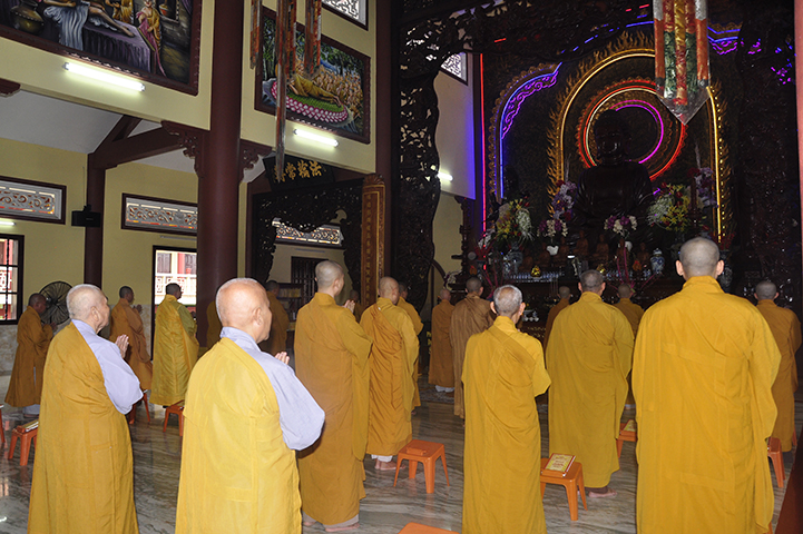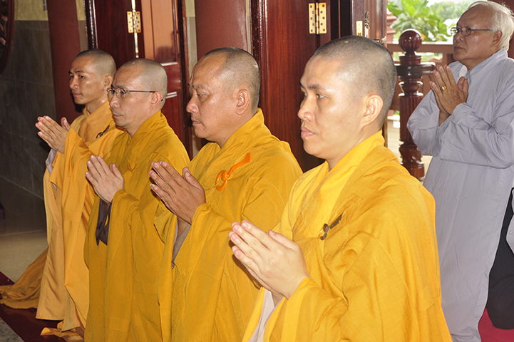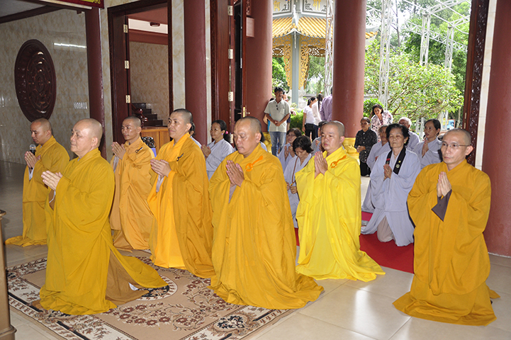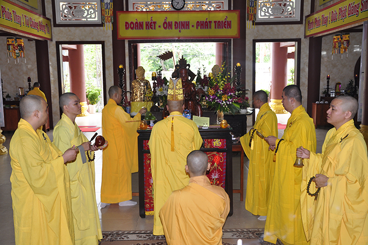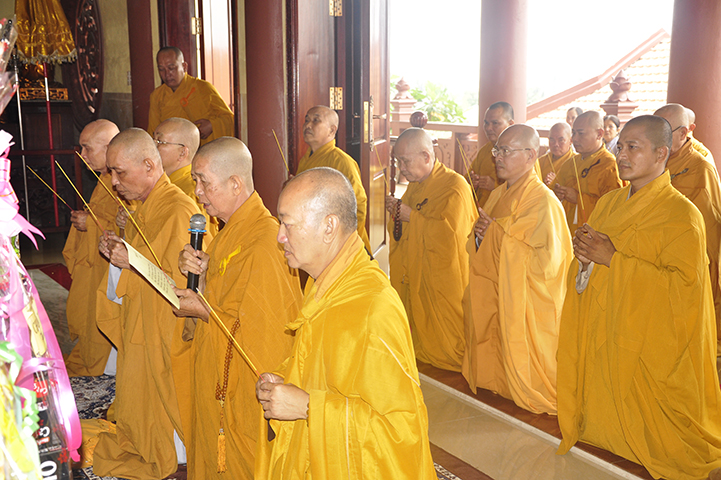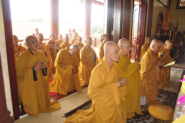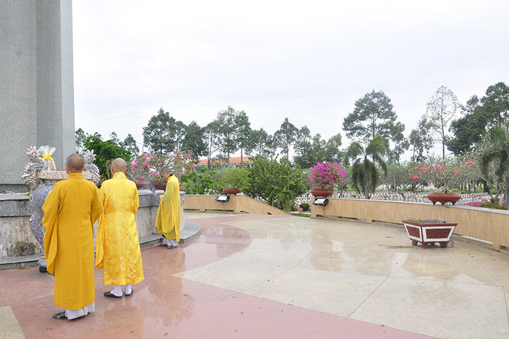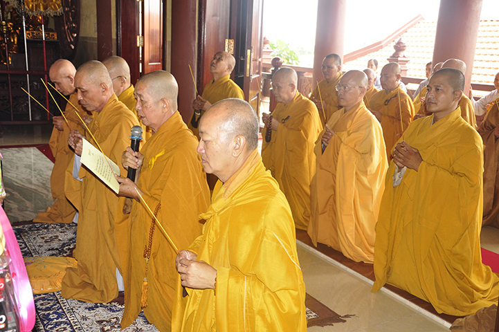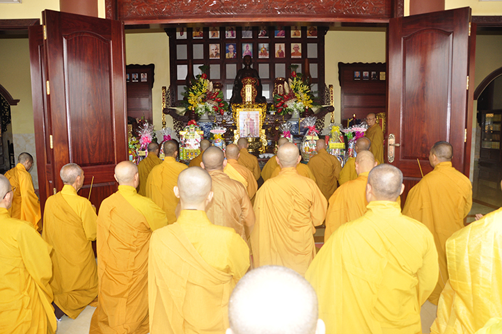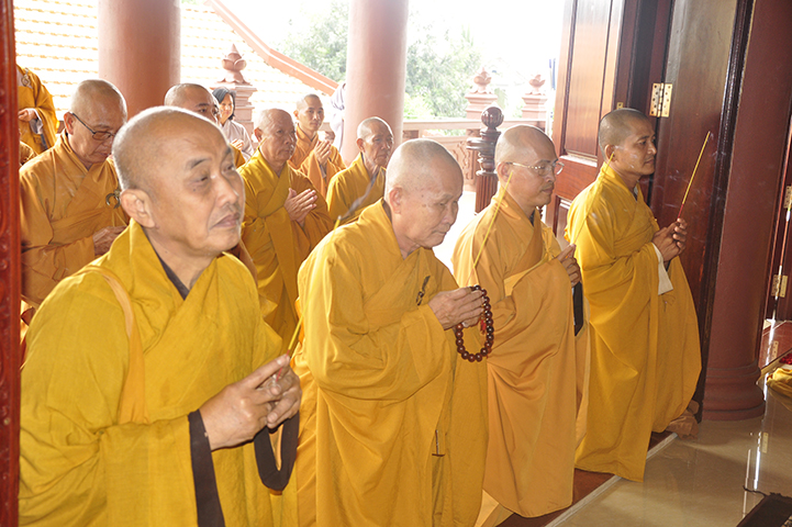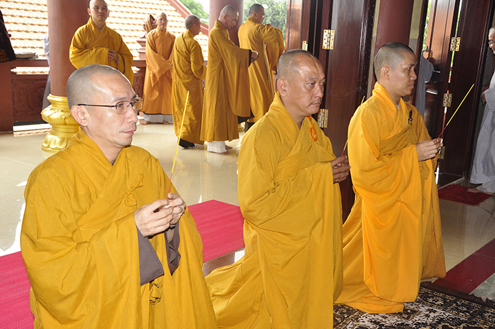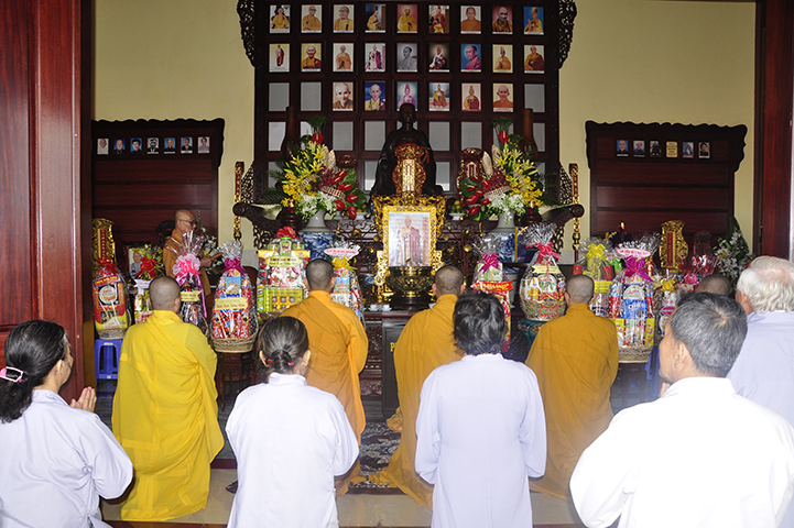 Đúng 8h30′, Ban tổ chức cung thỉnh Chư tôn đức giáo phẩm quang lâm đại hùng bảo điện niêm hương bạch Phật, trì tụng kinh chú, cúng Ngọ, sau đó quang lâm tại tổ đường thắp hương tưởng niệm Cố HT. Thích Pháp Lâm và cúng tiến Giác linh.