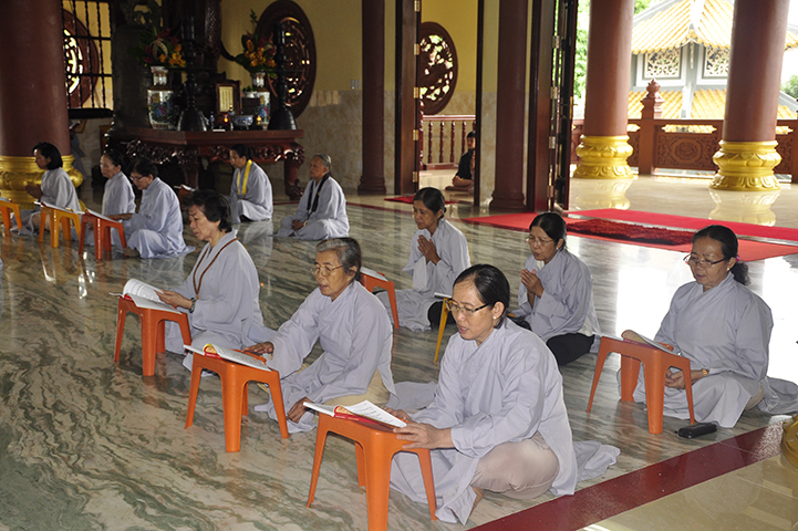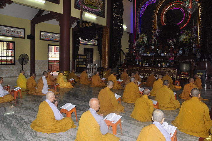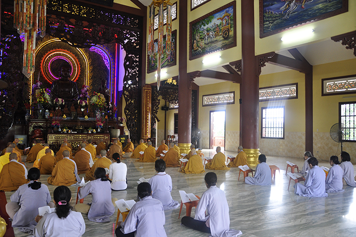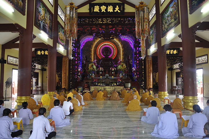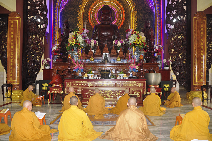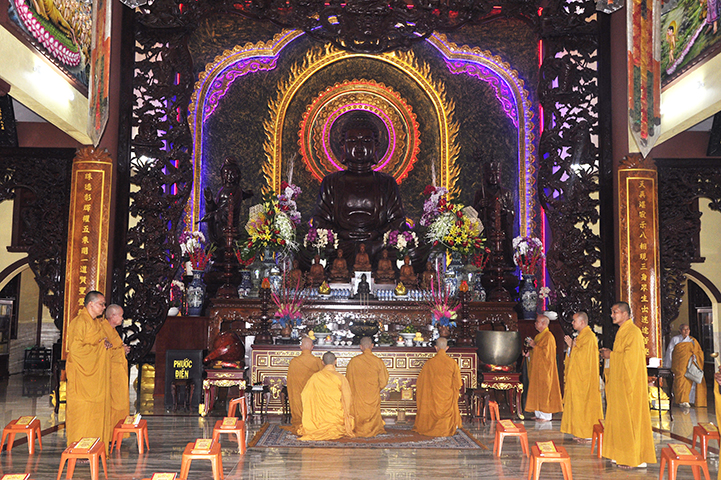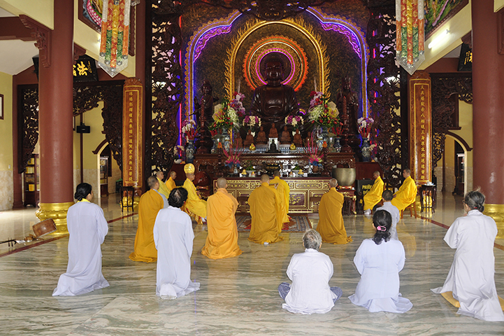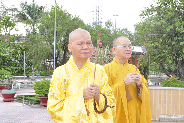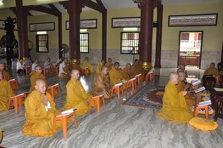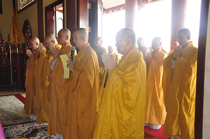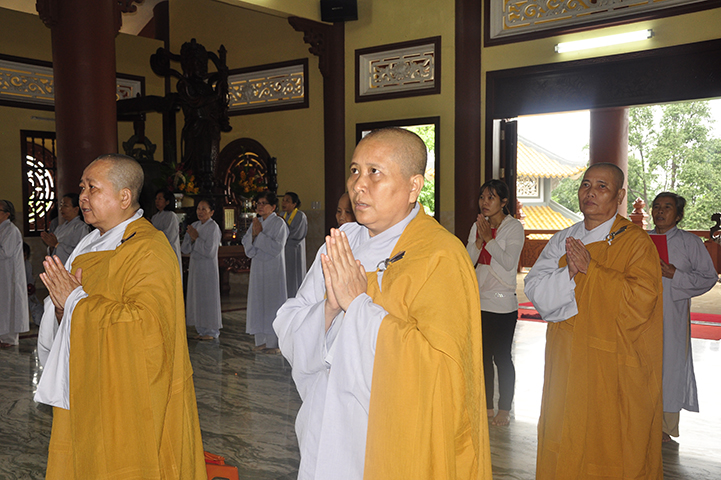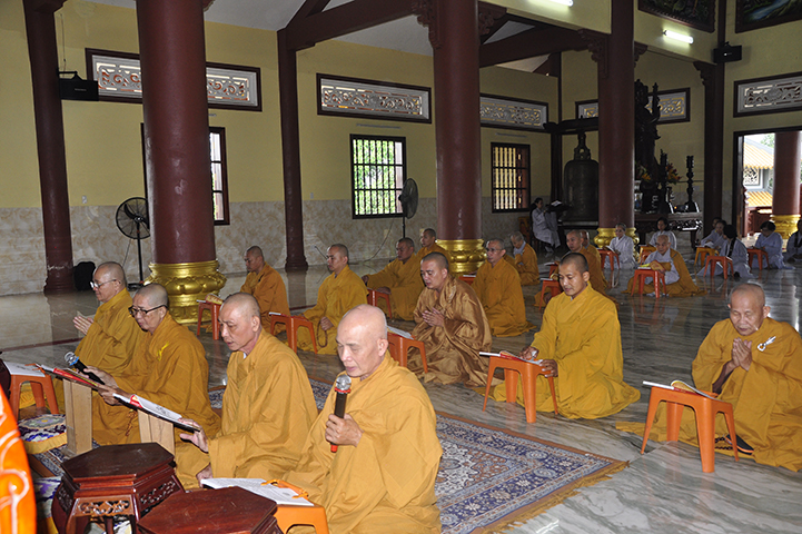 Đúng 8h30′, Ban tổ chức cung thỉnh Chư tôn đức giáo phẩm quang lâm đại hùng bảo điện niêm hương bạch Phật, trì tụng kinh chú, cúng Ngọ, sau đó quang lâm tại tổ đường thắp hương tưởng niệm Cố HT. Thích Pháp Lâm và cúng tiến Giác linh.