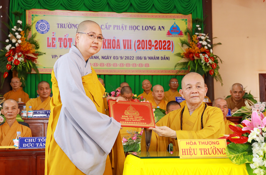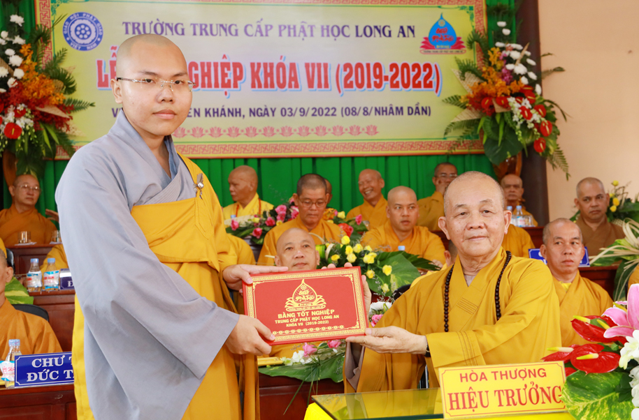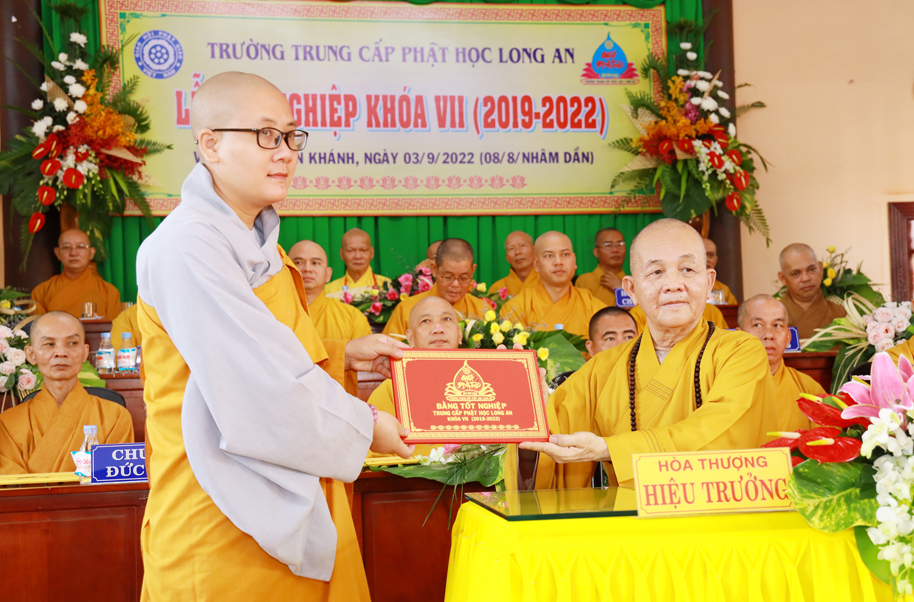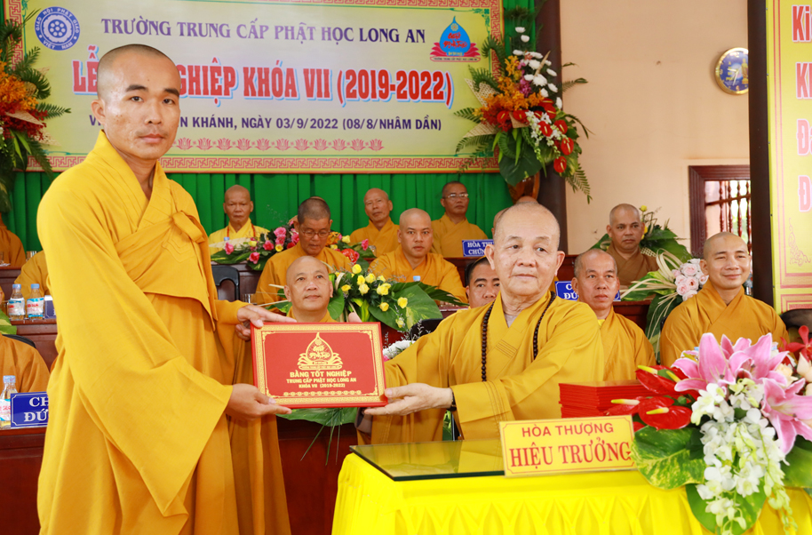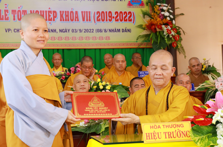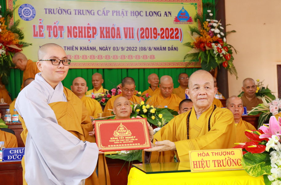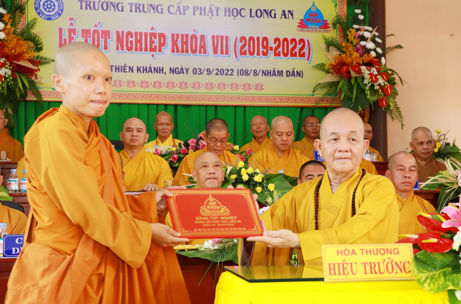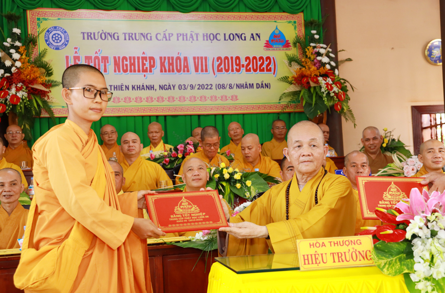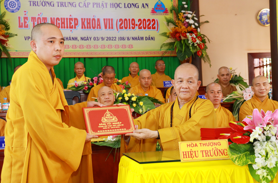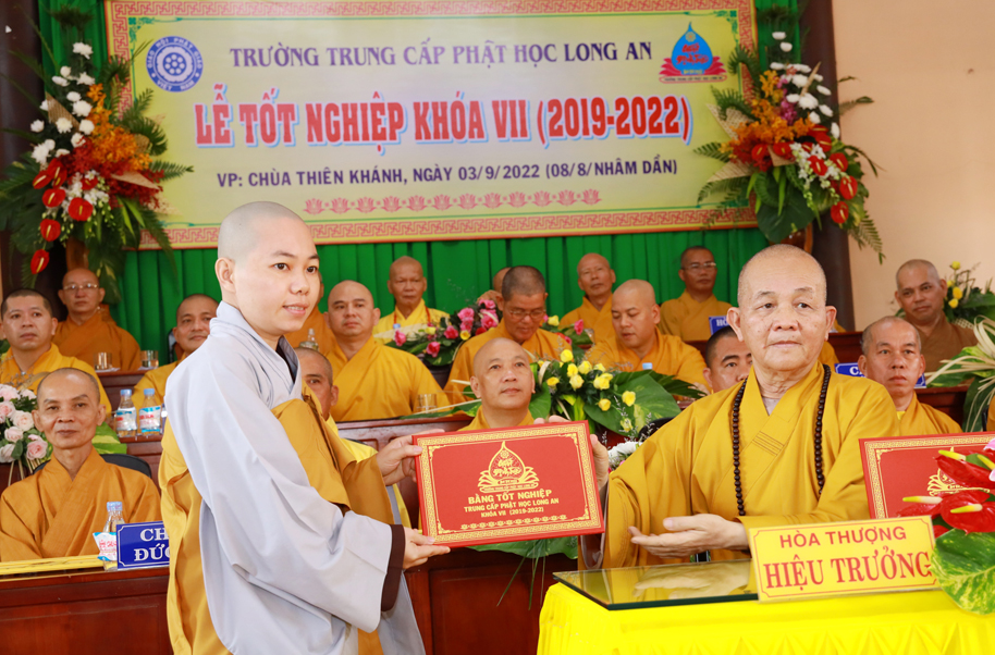 Sáng ngày 03/9/2022 (08/08/Nhâm Dần) tại chùa Thiên Khánh, số 48, đường Lưu Văn Tuế, phường 4, Thành phố Tân An, Ban Giám hiệu Trường Trung cấp Phật học tỉnh Long An trọng thể tổ chức Lễ Tốt nghiệp Trung Cấp Phật Học khóa VII (2019-2022)