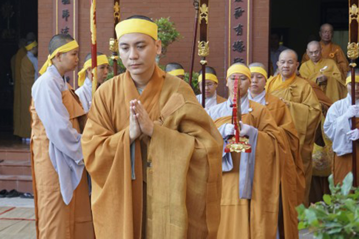 Đúng 8g30, Nghi thức phụng thỉnh Kim quan, Ban nghi lễ trang nghiêm tràng phan, nghi trượng dẫn đường. HT. Thích Thiện Tài điển lễ cùng Ban Kinh sư chính thức khởi sự Di quan. Chư Tôn đức Tăng Ni đồng kính tiễn Kim quan Nhập Bảo tháp.