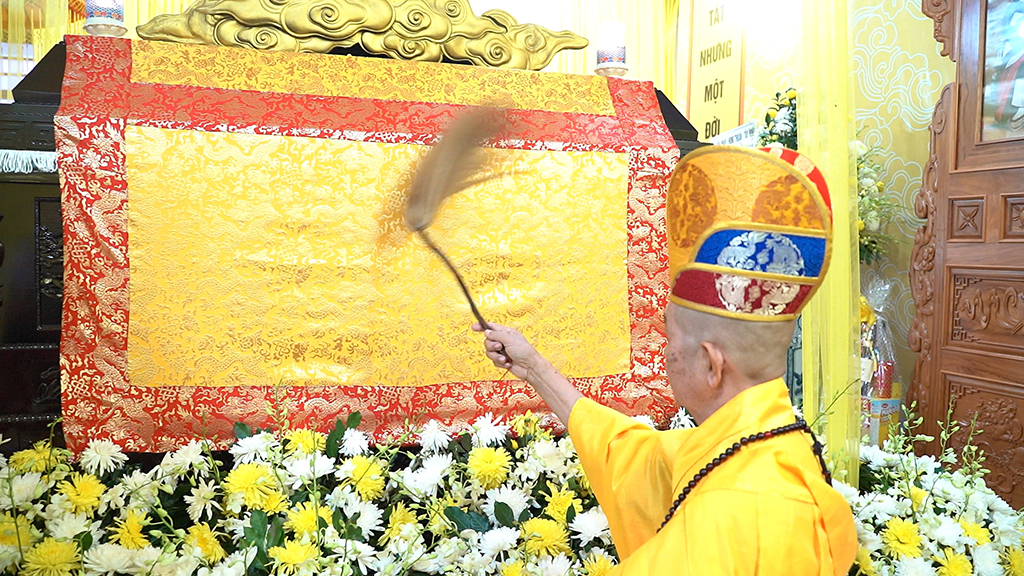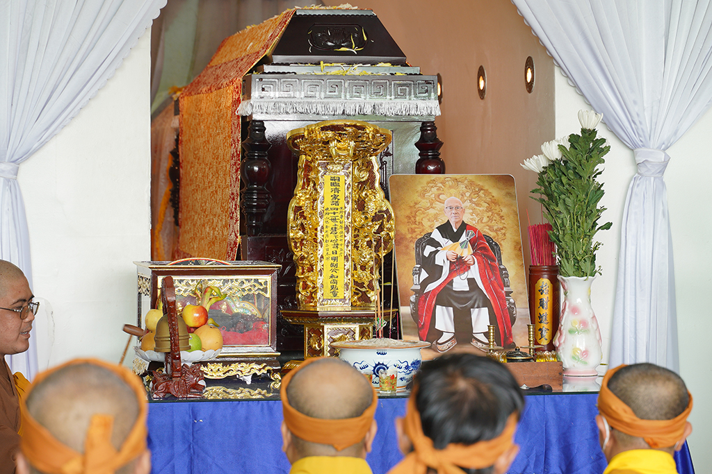Sau lễ truy niệm, HT. Thích Thiện Tài đương vi sám chủ đã tuyên pháp ngữ, thực hiện nghi thức phất trần. Cuối cùng môn đồ pháp quyến với sự hướng dẫn của chư Tôn đức đã cung thỉnh lư hương, long vị, y bát và di ảnh, phụng thỉnh kim quan Hòa thượng di quan đến nơi trà-tỳ tại Sơn Trang Tiên Cảnh, trong tiếng niệm Phật của Tăng Ni, Phật tử và âm vang trầm hùng của chuông trống Bát-nhã liên hồi hòa cùng nhạc lễ.