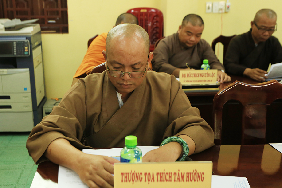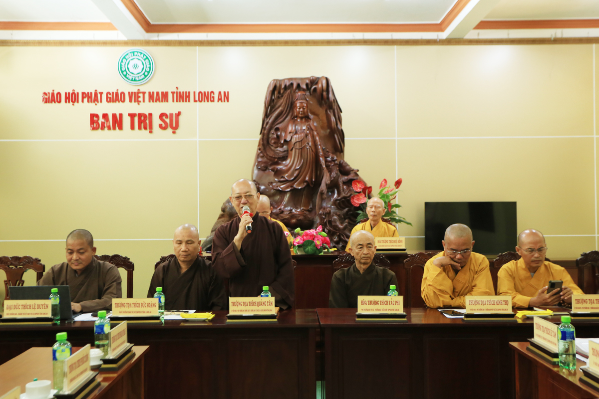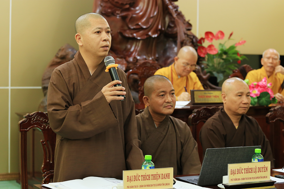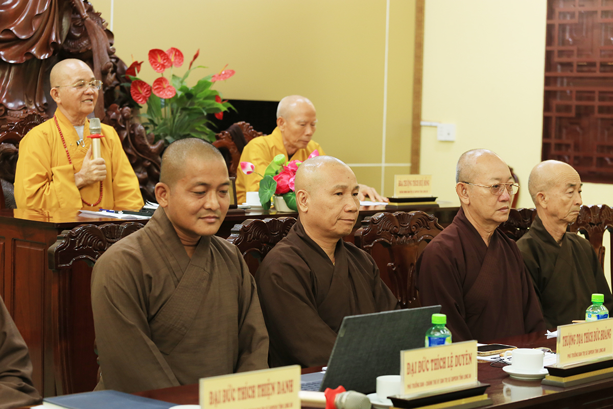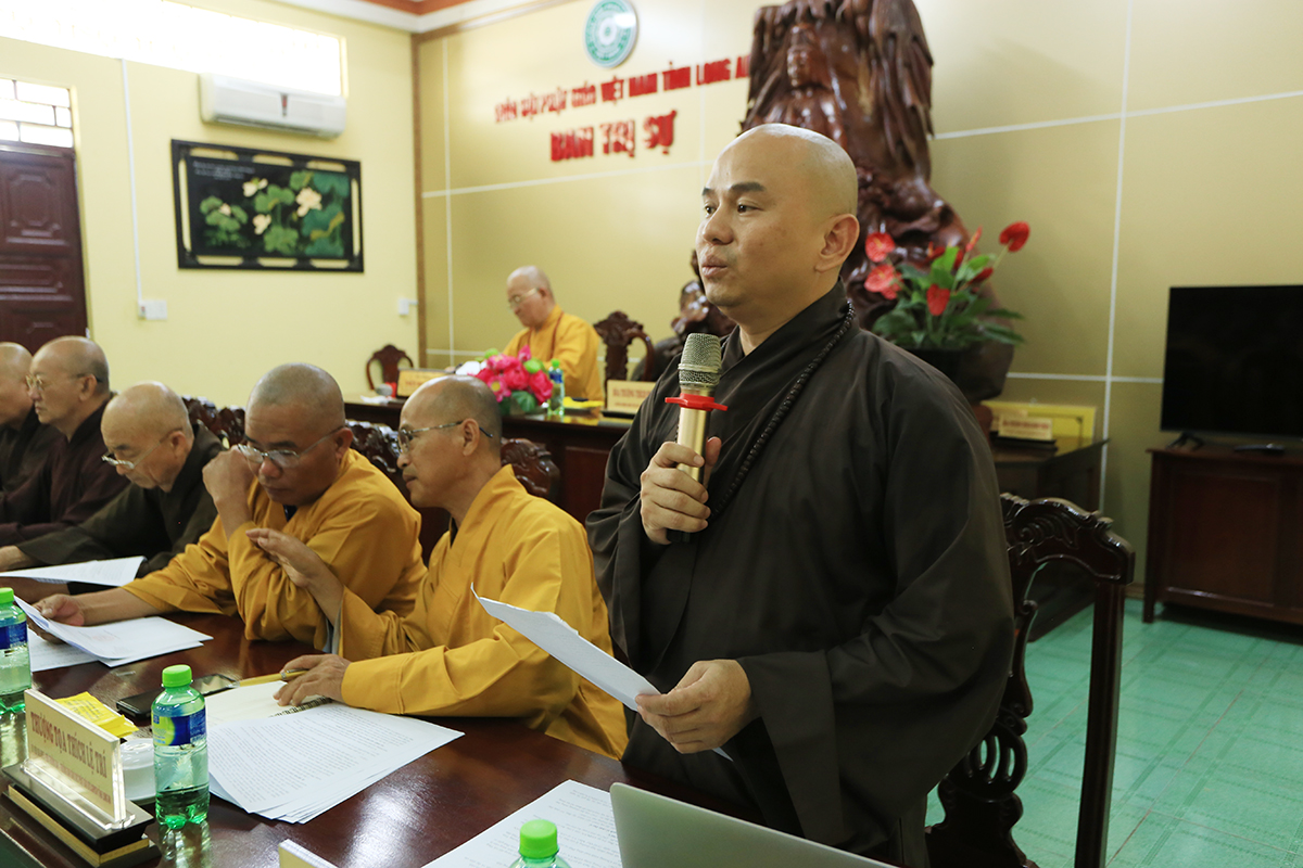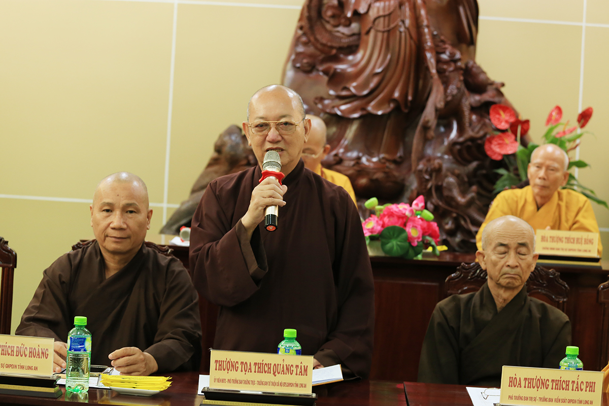 Phiên họp được đón nhận nhiều ý kiến đóng góp từ Chư tôn đức tham dự, Thượng tọa Thích Quảng Tâm – Uỷ viên HĐTS – Phó Trưởng Ban Thường trực BTS GHPGVN tỉnh Long An đã tóm tắt và thống nhất toàn bộ ý kiến, kính trình Hòa thượng Trưởng Ban trị sự cho ý kiến chỉ đạo.