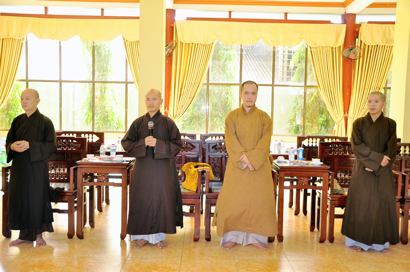 Tiếp lời, Hoà thượng Thích Minh Thiện thân chúc sức khoẻ, cát tường đến các thành viên trong phái đoàn về chức nghiệp và người thân trong gia đình. Hoà thượng đã có sự trao đổi với phái đoàn Ban Tôn giáo Chính phủ: Phật giáo tỉnh Long An, trong nhiệm kỳ này sẽ tiếp nối thành công và phương hướng hoạt động của Đại hội Phật giáo toàn quốc lần thứ Tám đã được diễn ra từ ngày 19 đến 22 tháng 11 năm 2017, tại Thủ đô Hà Nội. Đặc biệt, trọng tâm điều thứ tám trong nghị quyết của Đại hội “ Truyền thông như một kênh hoằng pháp”, theo quan điểm “ Tâm trong – Trí sáng – Ngòi bút thép” của Hoà thượng Chủ tịch HĐTS Trung ương GHPGVN. Nhằm, chuyển tải lời Phật dạy, thông tin công tác Phật sự và phổ biến hình ảnh đẹp của Phật giáo đến mọi người. Phát triển truyền thông đúng theo chủ trương Đạo pháp – Dân tộc – Chủ nghĩa xã hội để tiếp tục phát huy truyền thống “ Hộ quộc – An dân”, đem tinh thần từ bi và trí tuệ của đạo Phật để xây dựng khối đại đoàn kết toàn dân tộc. Qua đây Hoà thượng cũng báo cáo những hoạt động tuần lễ Phật Đản của toàn thể Phật giáo trong tỉnh đang diễn ra như: tại văn phòng Ban trị sự GHPGVN các huyện thị, thành phố và tỉnh Long An đều có thiết lập lễ đài và tổ chức tuần lễ thuyết giảng chánh pháp, diễu hành xe hoa, treo cờ phướng ở một số nẽo đường và tỉnh Long An tham gia chương trinh cầu truyền hình trực tiếp về Phật Đản với Trung ương GHPGVN. Đặc biệt Tăng Ni, phật tử tiếp tục tổ chức nhiều chương trình từ thiện “ đền ơn đáp nghĩa, xây dựng cầu đường giao thông nông thôn…lập thành công đức dâng lên cúng dường Tam Bảo”. Mục đích tạo nên một lễ hội truyền thống Phật Đản cho đồng bào nhân dân hôm nay và mai sau.