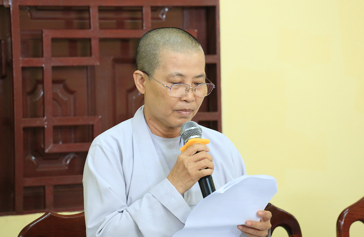 Đại đức Thích Lệ Duyên – Phó ban kiêm Chánh Thư ký BTS GHPGVN tỉnh đã thay mặt bộ phận Thư ký – Văn phòng thông qua báo cáo của BTS GHPGVN các huyện, thị xã, thành phố. Theo đó tất cả công tác Phật sự đều sinh hoạt ổn định, phát triển. Đặc biệt Đại lễ Phật đản PL.2568 – DL.2024 tại các huyện thị đã diễn ra thành tựu với nhiều hoạt động như tổ chức các khóa lễ thuyết pháp, diễu hành xe hoa, tiệc buffet chay,… Nổi bật nhất trong tháng qua, đó chính là hoạt động từ thiện: Phật giáo toàn tỉnh đã trao tặng 9 cây cầu giao thông nông thôn, 1 căn nhà tình nghĩa quân nhân, 1 căn nhà tình thương và nhiều công tác an sinh xã hội khác. Tổng công tác từ thiện xã hội đạt 10.321.224.000 đồng (Mười tỷ ba trăm hai mươi mốt triệu hai trăm hai mươi bốn nghìn đồng)