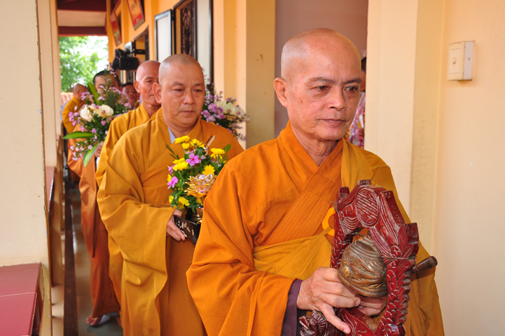 Đúng 8h, buổi lễ Tổng khai giảng được bắt đầu. HT. Thích Minh Thiện- Trưởng ban tổ chức Khóa an cư kiết hạ cung thỉnh chư Tôn giáo phẩm quang lâm hội trường chứng minh.