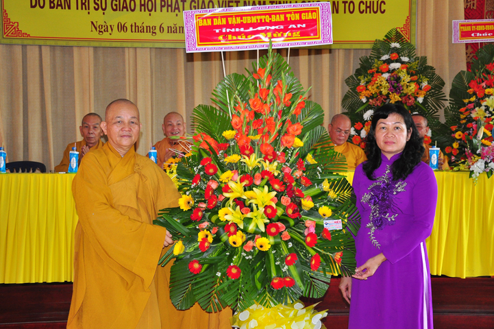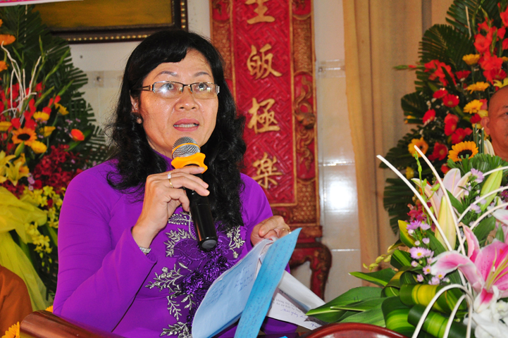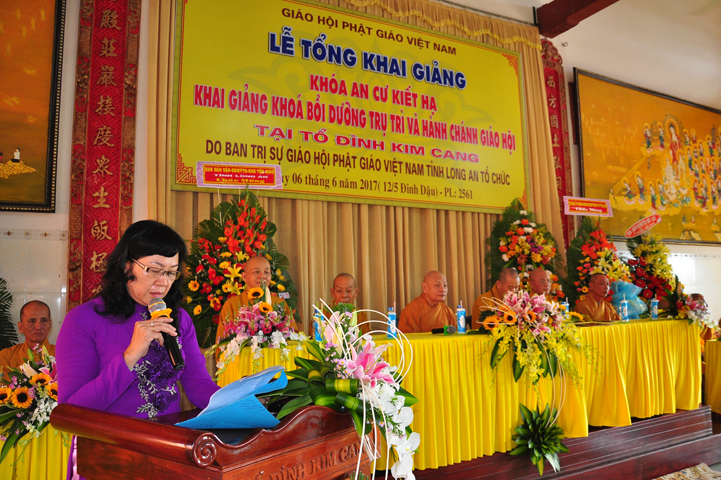 Đại diện chính quyền, bà Phạm Thị Ngọc Tiệp- Phó chủ tịch UBMTTQVN tỉnh Long An phát biểu chúc mừng buổi lễ. Trong lời phát biểu, Bà đã dành nhiều mỹ từ ca ngợi tinh thần tu học, sự đóng góp tích cực của chư Tăng Ni tỉnh Long An trong nhiều phương diện, ảnh hưởng tốt đẹp đến vấn đề Giáo dục và Văn hóa tỉnh nhà. Vị đại diện hy vọng chư Tăng Ni sau mỗi khóa An cư, đạo hạnh ngày càng thăng hoa, tích cực đem ‘ánh sáng đạo vào đời’ giúp người bớt khổ thêm vui, sống đúng với tinh thần Phật pháp, đúng với Hiến chương của Giáo hội đề ra, để Phật giáo Thủ Thừa, Long An ngày càng phát triển. Nhân đó, Bà cũng gởi lời chia sẻ và chúc mừng công tác Đại hội Đại biểu Phật giáo tỉnh nhiệm kỳ 2017-2022.