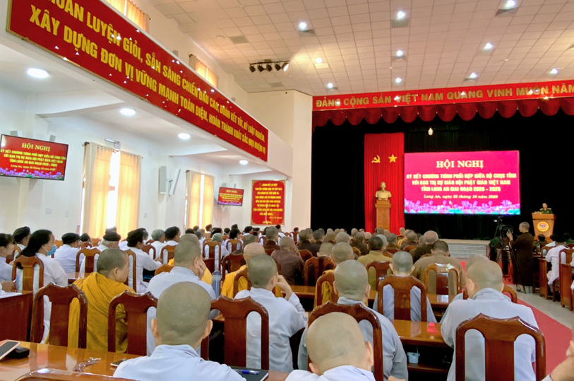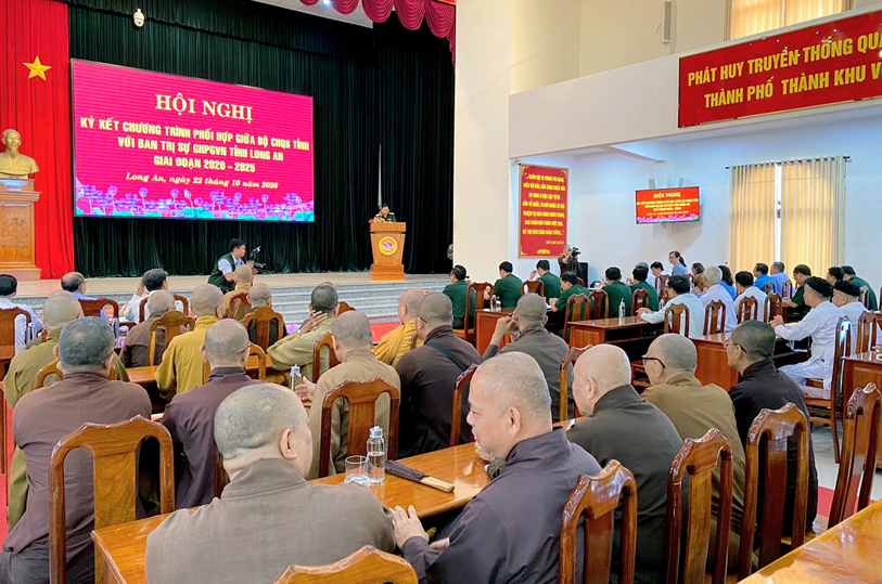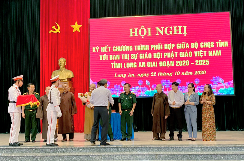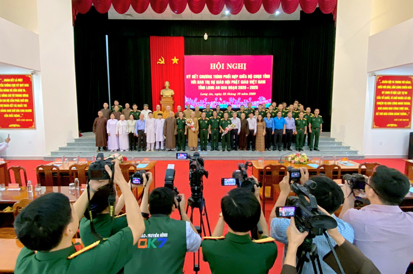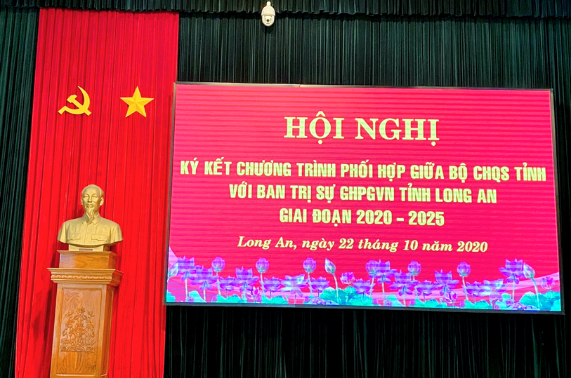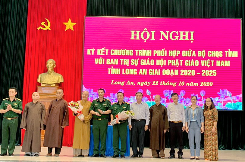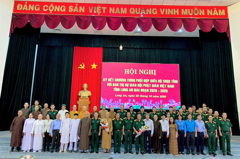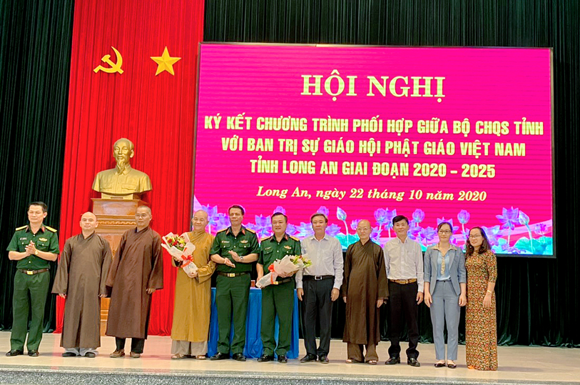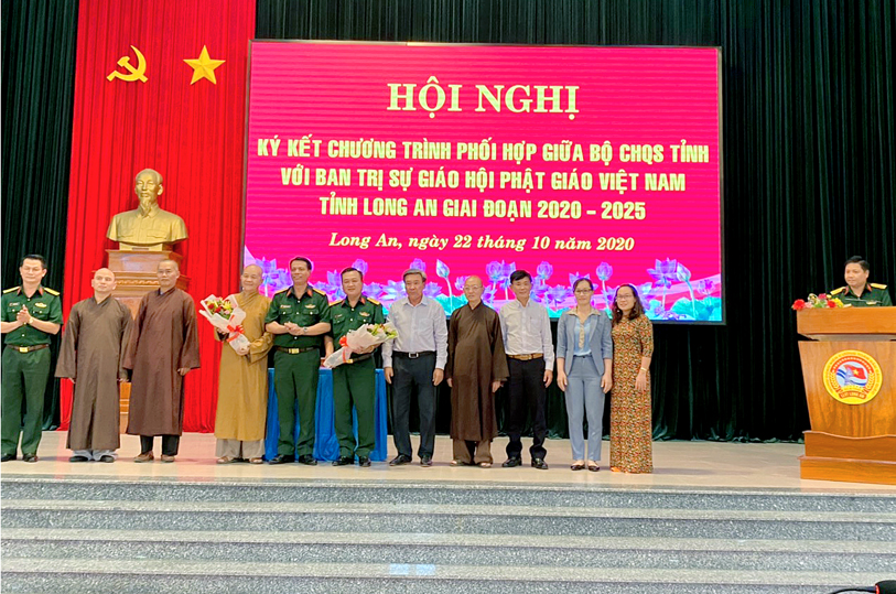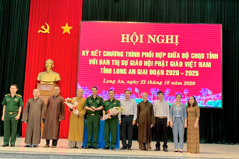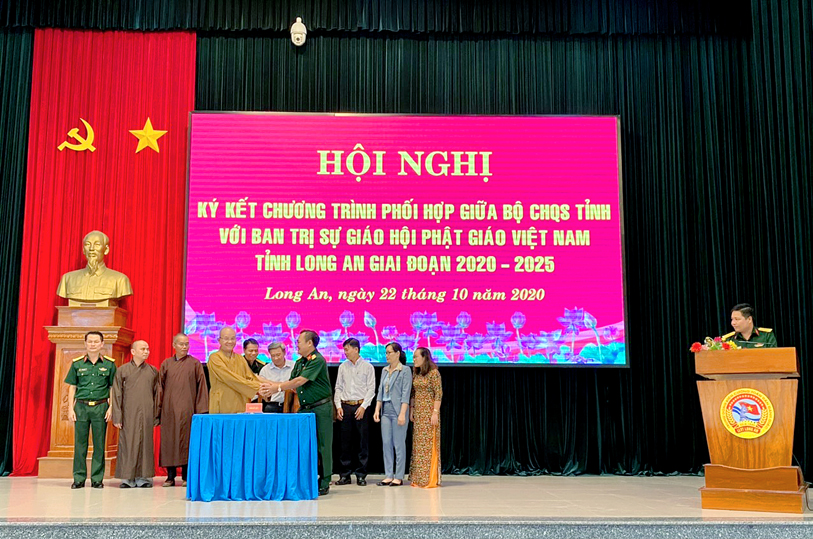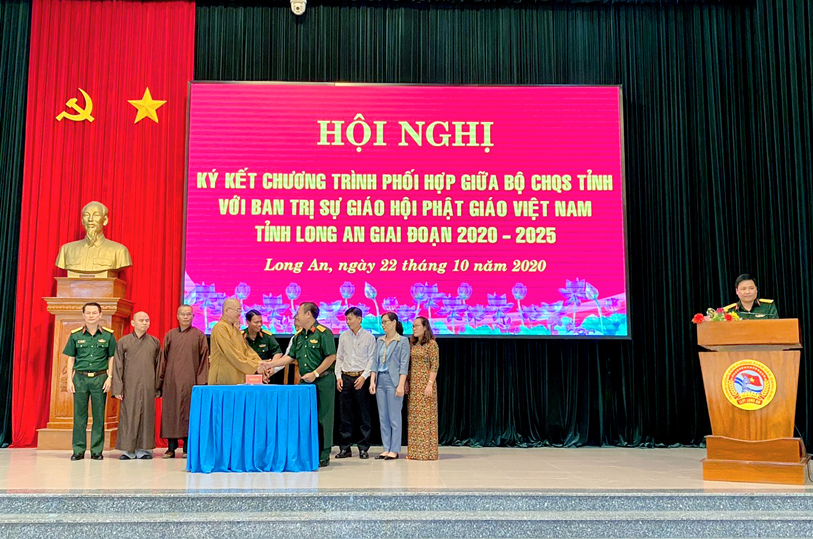Thực hiện chủ trương của Đảng ủy, Bộ Tư lệnh Quân khu và Thường trực Tỉnh ủy về tăng cường các hoạt động gắn kết, thân thiện với đồng bào dân tộc, tôn giáo, sáng ngày 22/10/2020 (nhằm ngày 6/9 năm Canh Tý), tại Bộ Chỉ huy Quân sự tỉnh Long An (số 175- Quốc lộ 62, phường 6, tp. Tân An, tỉnh Long An, Bộ CHQS tỉnh đã tổ chức hội nghị ký kết phối hợp hoạt động với Ban Trị sự GHPGVN tỉnh giai đoạn (2020 – 2025).