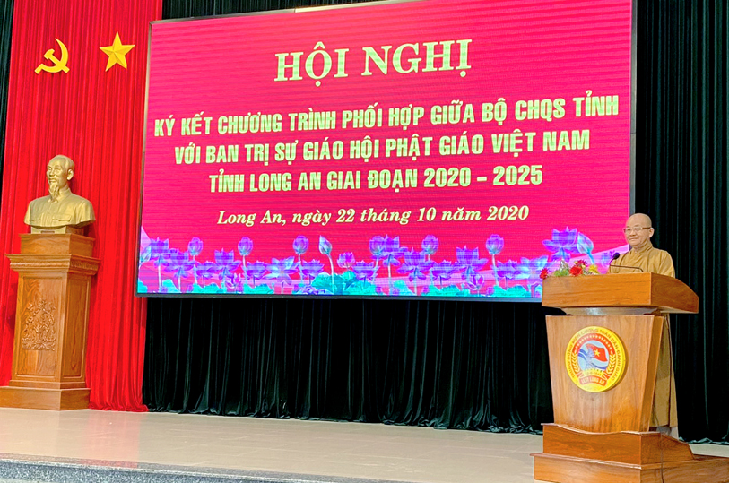 Tham dự buổi lễ ký kết, HT. Thích Minh Thiện- Ủy viên HĐTS, Phó Trưởng ban Hoằng pháp TƯ, Trưởng Ban Trị sự GHPGVN tỉnh Long An thay mặt Thường trực GHPGVN tỉnh Long An có lời phát biểu: Đọc qua văn kiện ký kết và lắng nghe ý kiến, Phật giáo Long An rất vui mừng về sự ký kết phối hợp hoạt động giữa Bộ CHQS tỉnh với BTS GHPGVN tỉnh Long An. Hòa thượng cũng đánh giá lời phát biểu sâu sắc của đại diện Bộ CHQS tỉnh đối với truyền thống đồng hành cùng dân tộc của Phật giáo qua những giai đoạn thăng, trầm lịch sử dựng nước và giữ nước giữa Dân tộc và Phật giáo. Hòa thượng cũng nhấn mạnh truyền thống đoàn kết của các tôn giáo dân tộc tại tỉnh Long An, cụ thể đã cùng nhau góp phần lợi ích cho dân tộc, cho nhân dân trong thời gian qua. Sự kiện thành lập GHPGVN tháng 11 năm 1981 được cố Thủ tướng Phạm Văn Đồng xác ký đã nói lên truyền thống đồng hành cùng dân tộc của Phật giáo Việt Nam, cụ thể hóa bằng phương châm “Đạo pháp – Dân tộc – Chủ nghĩa Xã hội”; Tăng Ni Phật giáo Việt Nam trong và ngoài nước thực hiện phương châm “Phụng sự chúng sanh là cúng dường chư Phật”; ý thức trách nhiệm với quê hương đất nước của mình và xây dựng quê hương đất nước của mình theo tinh thần truyền thống Phật giáo. Tăng Ni tham gia các khóa học An ninh Quốc phòng cũng là thể hiện trách nhiệm và tình yêu đất nước, dân tộc trong bối cảnh hiện nay. Do vậy, việc ký kết hôm nay là một vinh dự, là một hệ thộng cụ thể hóa hơn sự gắn kết keo sơn giữa Phật giáo và Dân tộc đã có truyền thống từ sơ khai đến hôm nay và mãi về sau.