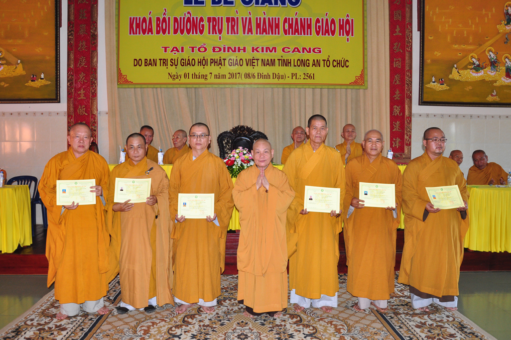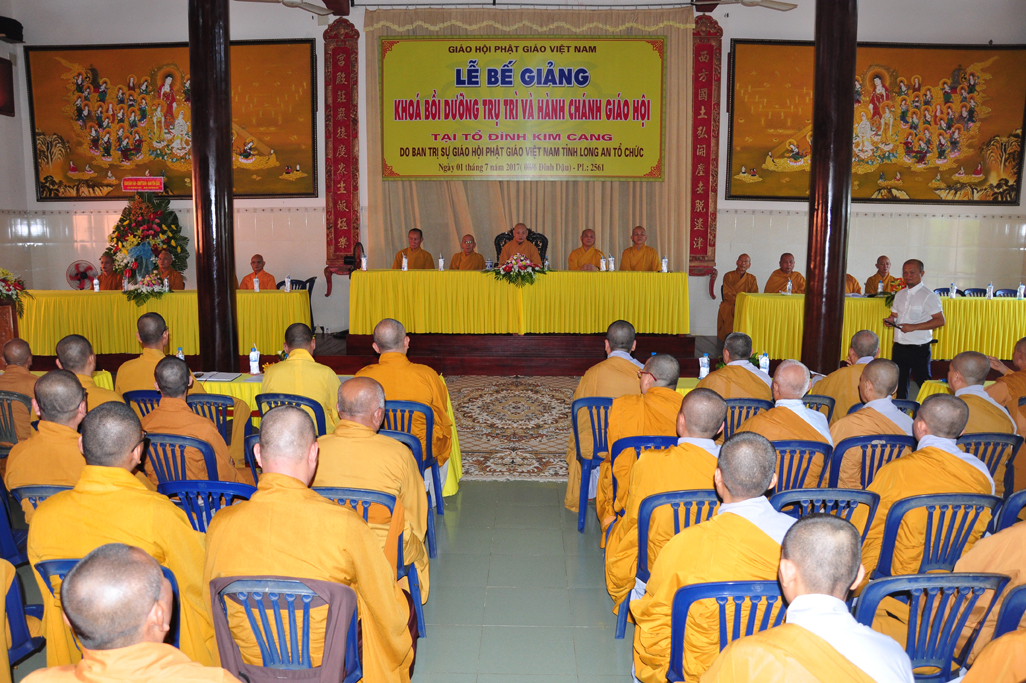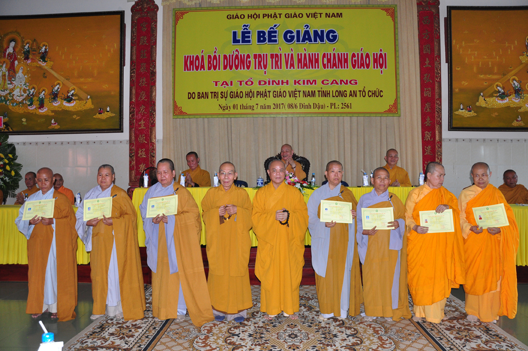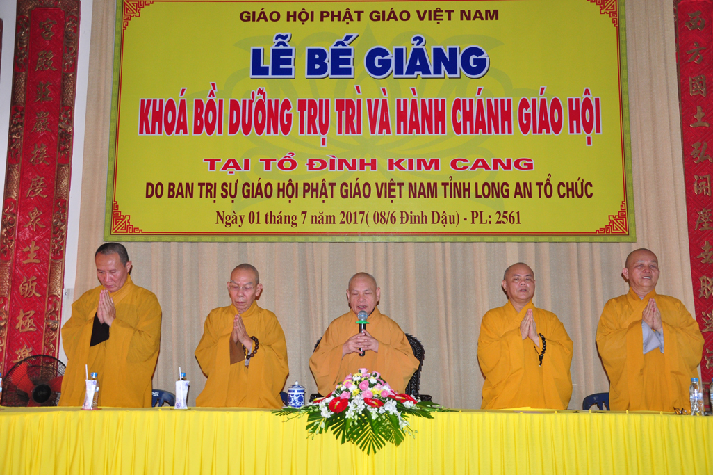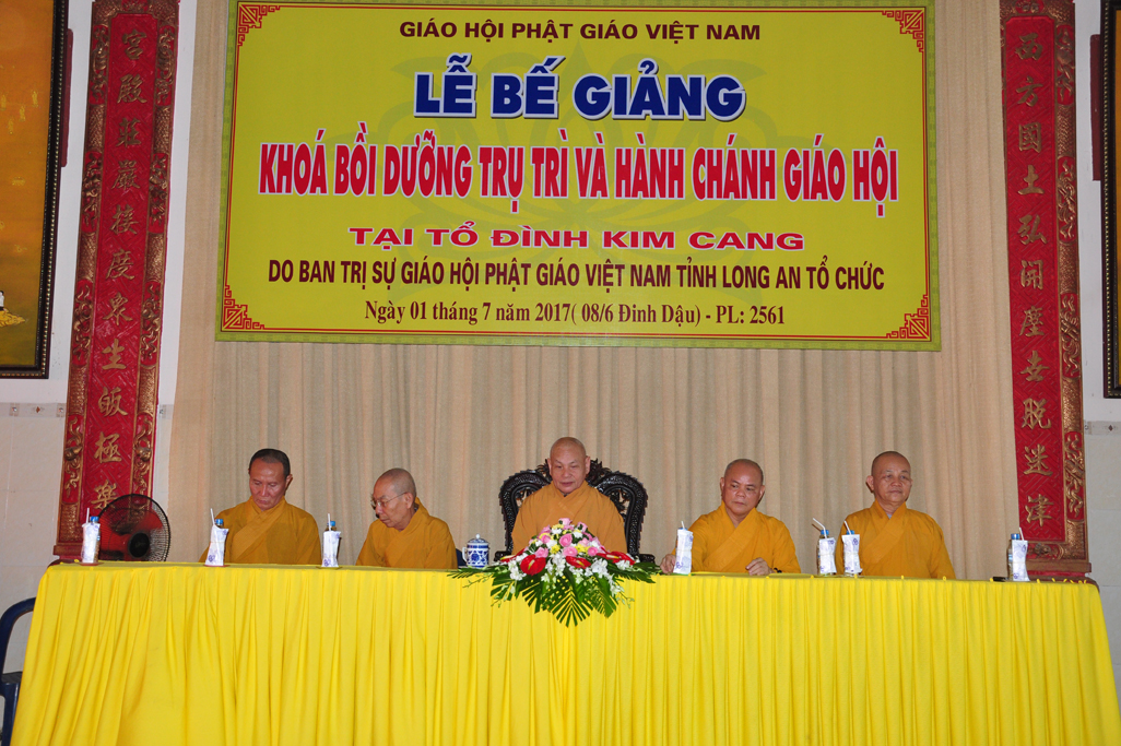 Sáng nay, vào lúc 09 giờ 30, ngày 01 tháng 7 năm 2017 (nhằm 08/6/Đinh Dậu) tại tổ đình Kim Cang, huyện Thủ Thừa, tỉnh Long An diễn ra lễ bế giảng khóa Bồi dưỡng Trụ trì và hành chánh Giáo hội năm 2017 do Ban Trị sự GHPGVN tỉnh Long An tổ chức.