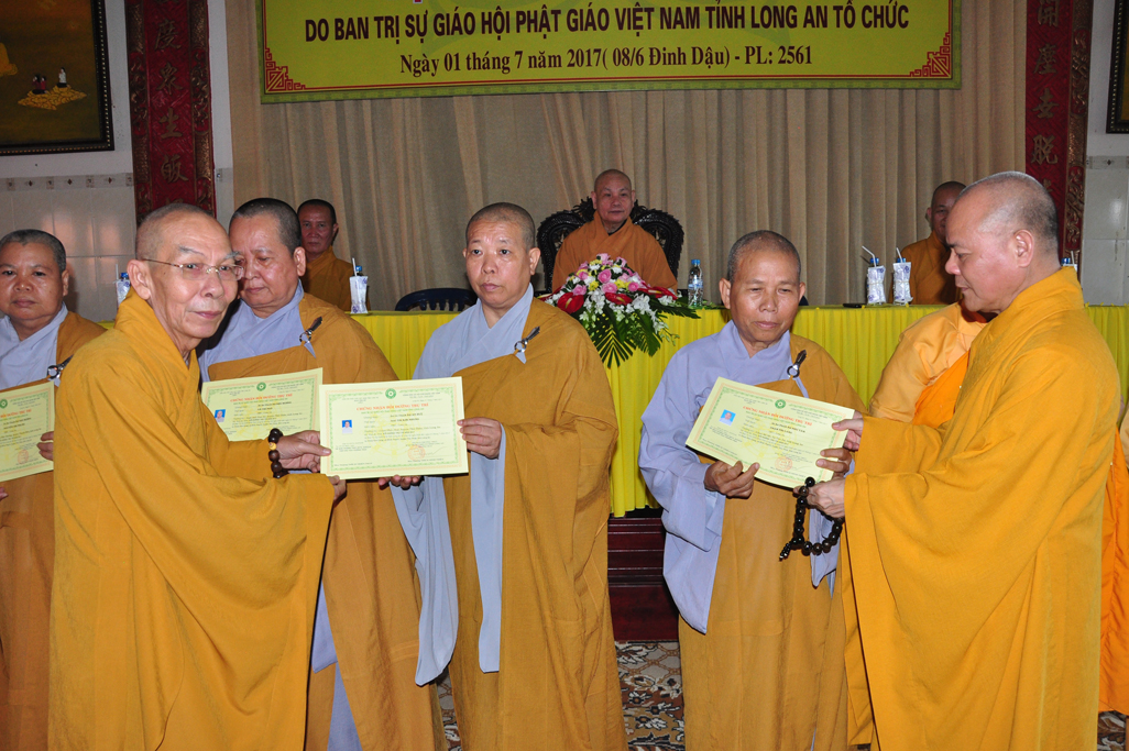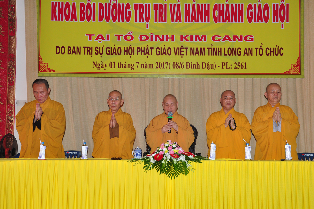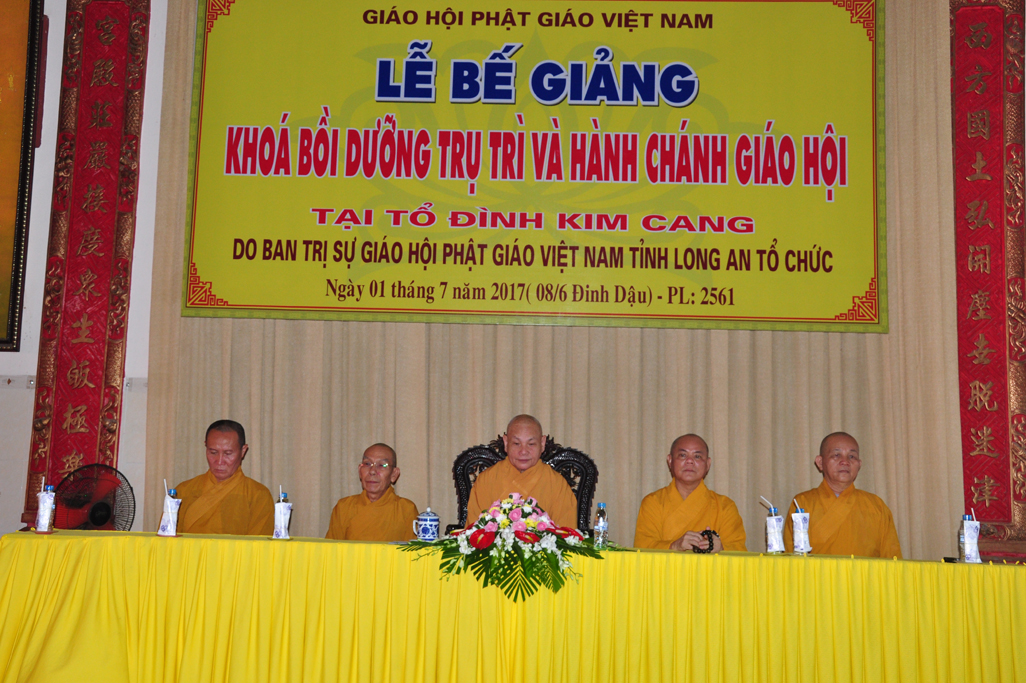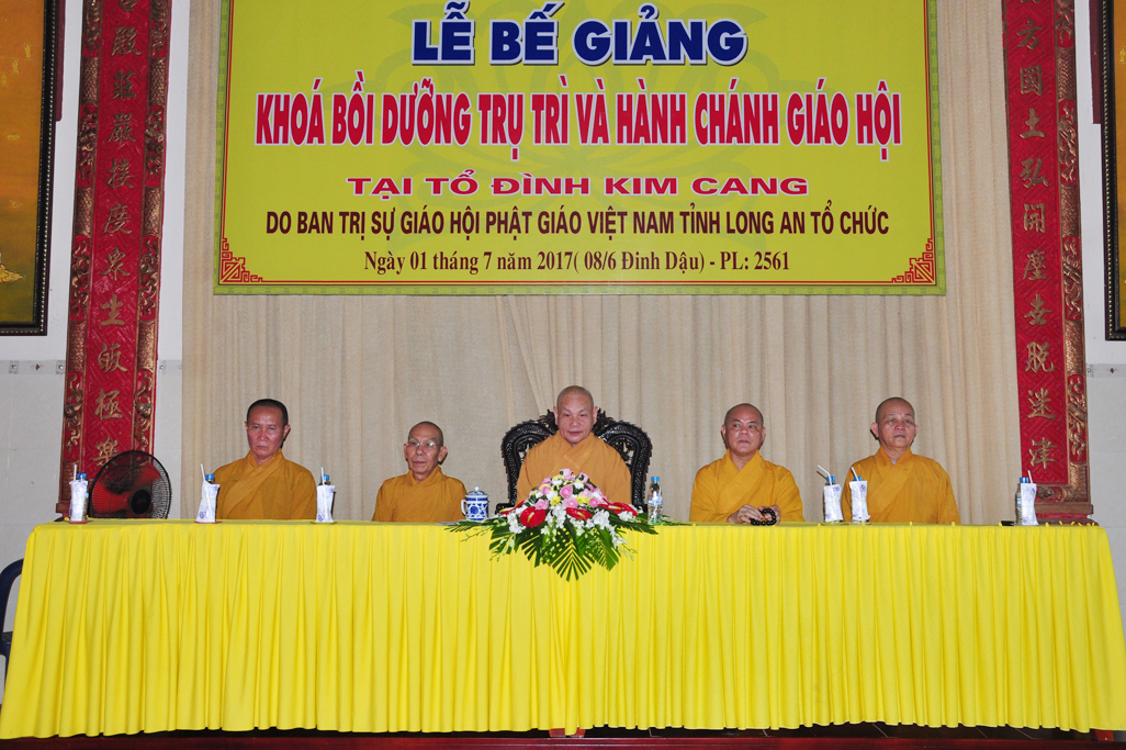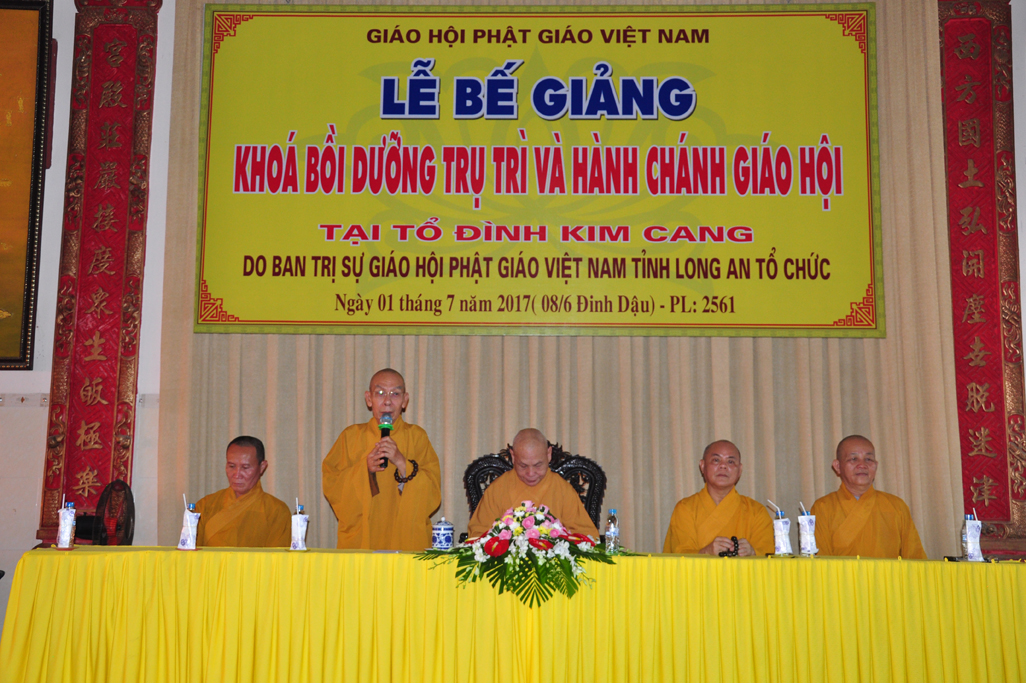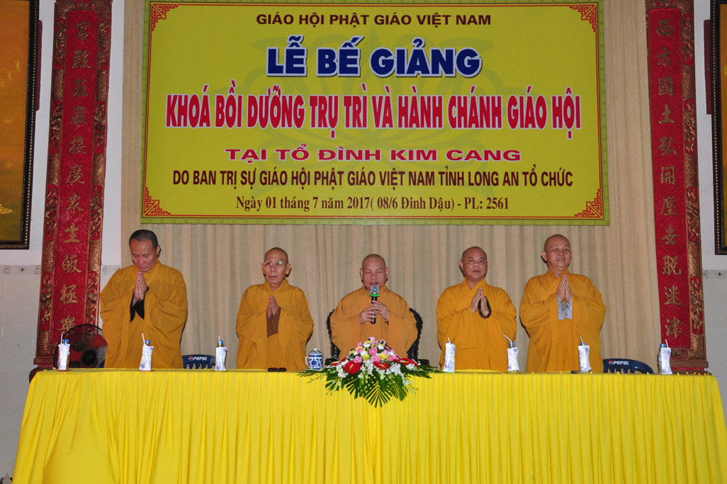 Sáng nay, vào lúc 09 giờ 30, ngày 01 tháng 7 năm 2017 (nhằm 08/6/Đinh Dậu) tại tổ đình Kim Cang, huyện Thủ Thừa, tỉnh Long An diễn ra lễ bế giảng khóa Bồi dưỡng Trụ trì và hành chánh Giáo hội năm 2017 do Ban Trị sự GHPGVN tỉnh Long An tổ chức.
