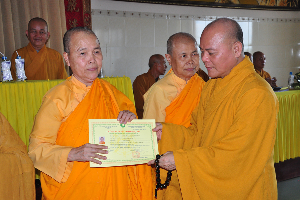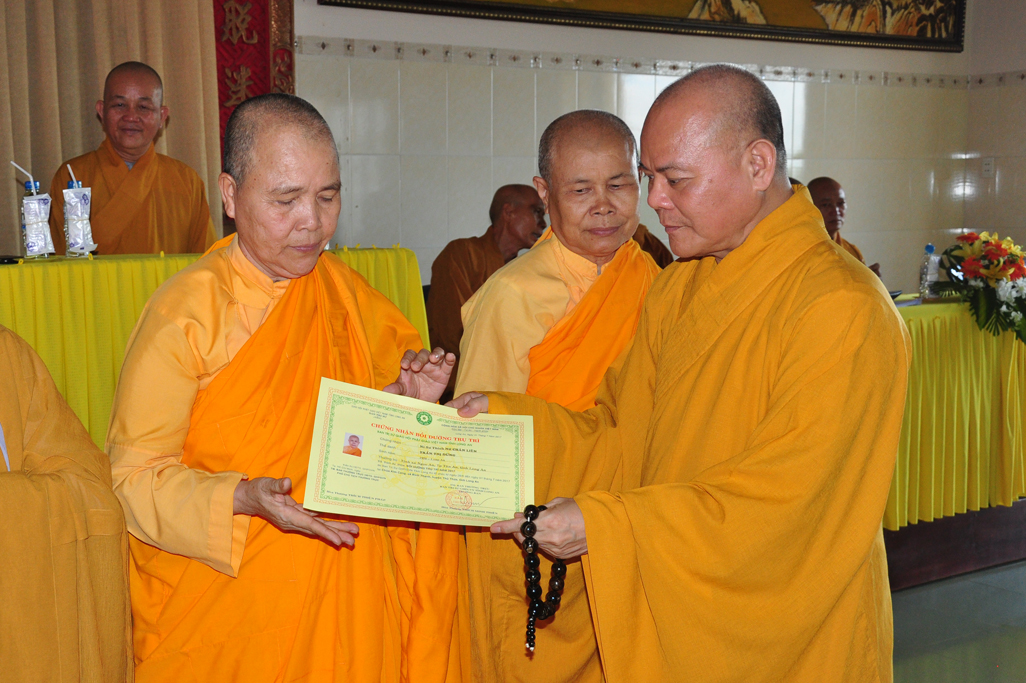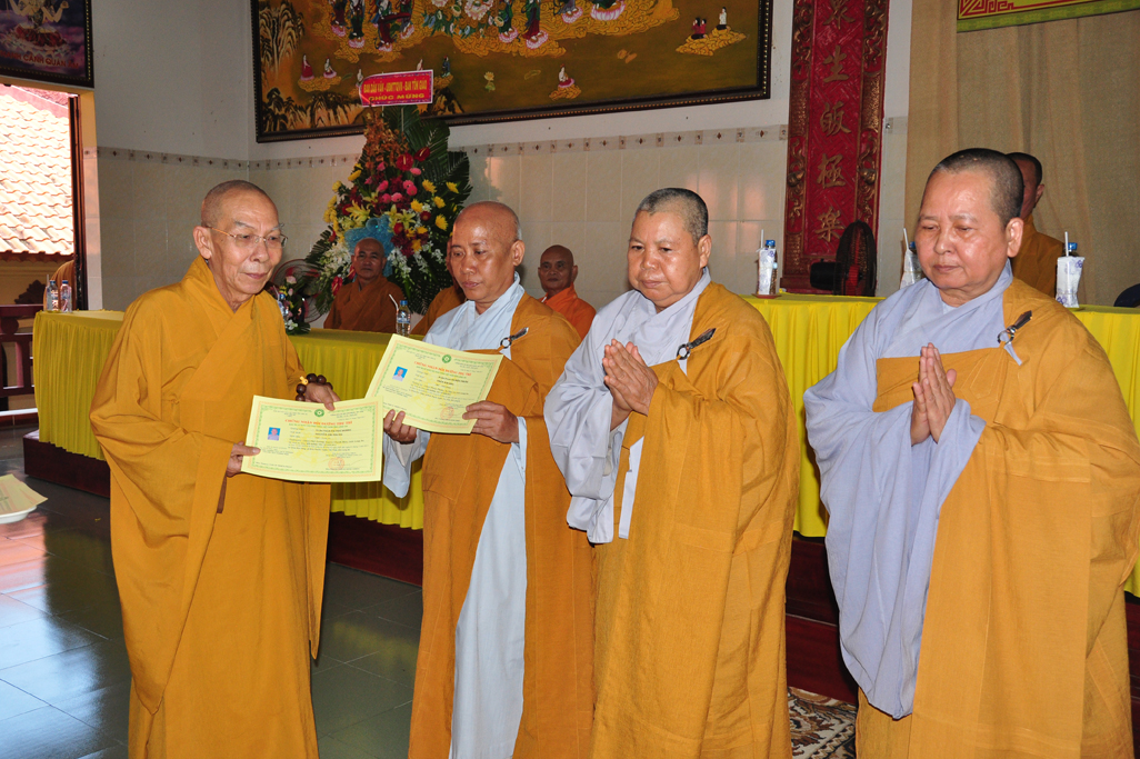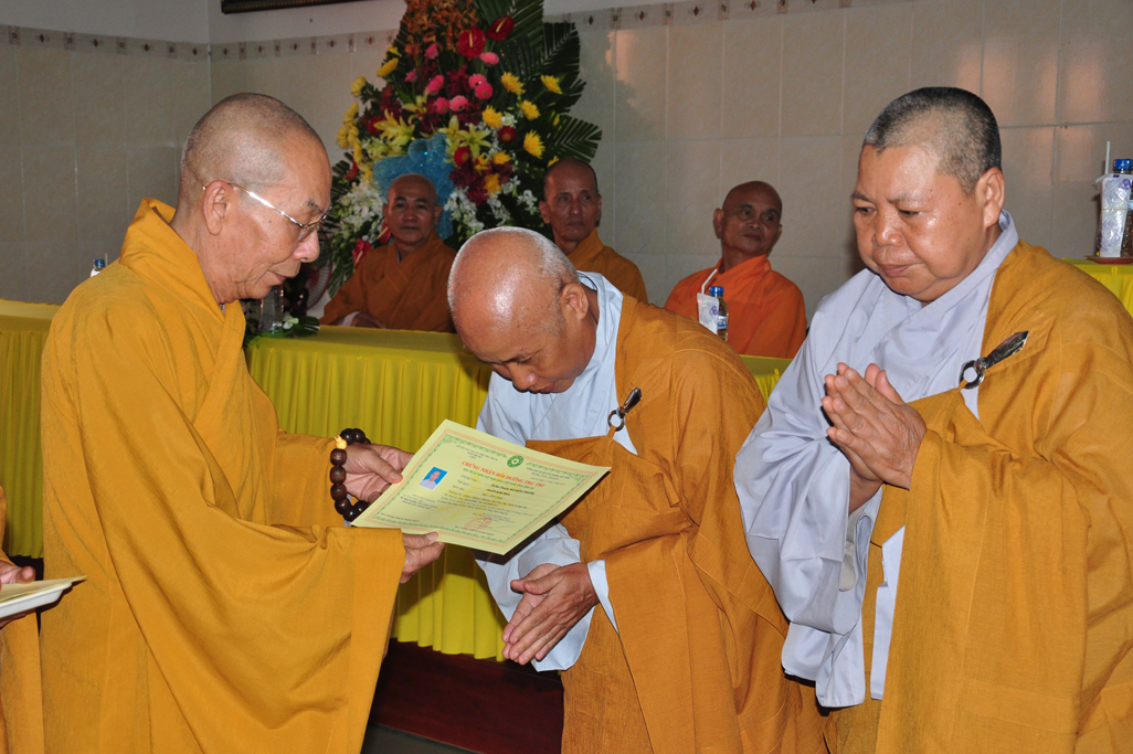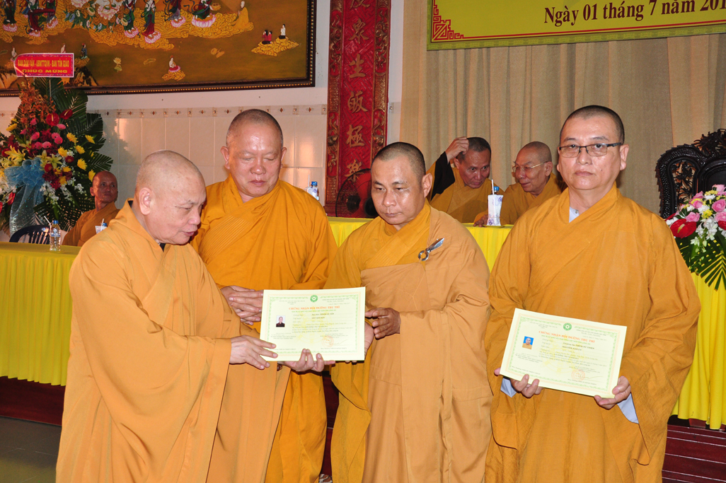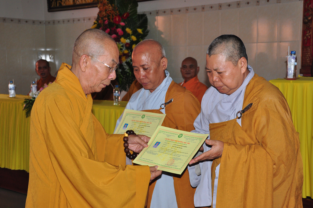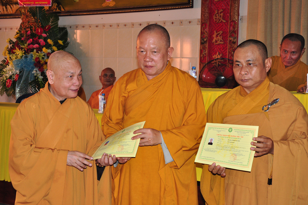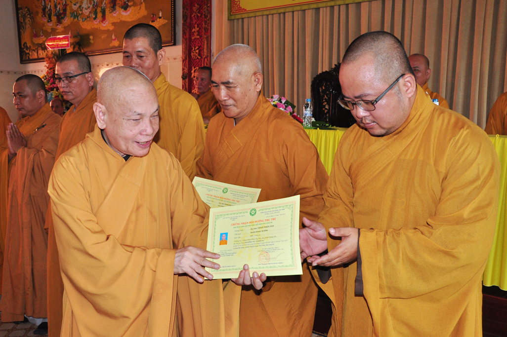 HT Thiện Thiện Nhơn: Chủ tịch HĐTS và Chư Tôn đức lãnh đạo TƯGH trao tiêu biểu giấy chứng nhận khóa bồi dưỡng Trụ trì và hành chánh Giáo hội.