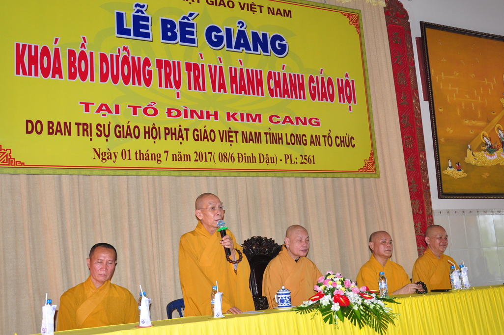 Tại buổi lễ, Chư Tôn đức Tăng Ni vinh dự được lắng nghe lời đạo từ của HT Thích Thiện Đức: UVTT HĐTS, Phó Trưởng ban Kiểm soát TƯ. Trước tiên, Hòa thượng ghi nhận công đức đóng góp của 3 vị tiền nhiệm Trưởng ban Trị GHGPVN tỉnh Long An, đó là: HT Thích Từ Tâm, HT Thích Đạt Pháp, HT Thích Thiện Thanh và hiện nay là HT Thích Minh Thiện. Hòa thượng cũng tán dương BTS GHPGVN tỉnh Long An đã tổ chức liên tiếp 22 mùa an cư kiết hạ và 16 khóa Bồi dưỡng Trụ trì và hành chánh Giáo hội tại tổ đình Kim Cang. Hòa thượng đề nghị Chư tôn đức Tăng Ni khóa hãy vận dụng kiến thức, kinh nghiệm học được do Chư Tôn đức giáo phẩm lãnh đạo giáo hội truyền đạt vào việc quản lý cơ sở tự viện tại địa phương và trong sự nghiệp hoằng dương Phật pháp, lợi lạc quần sinh, hộ quốc an dân. Đồng thời, hòa thượng khuyến khích vị trụ trì hãy trang bị và hoàn thiện ba yếu tố: “tâm”, “tài” và “tầm”.