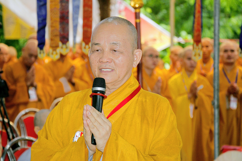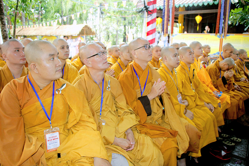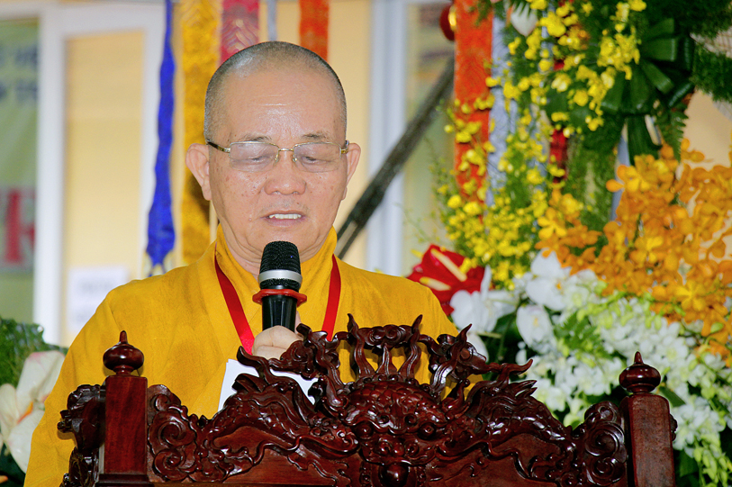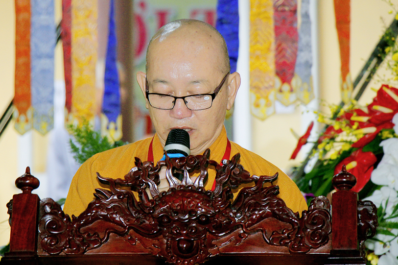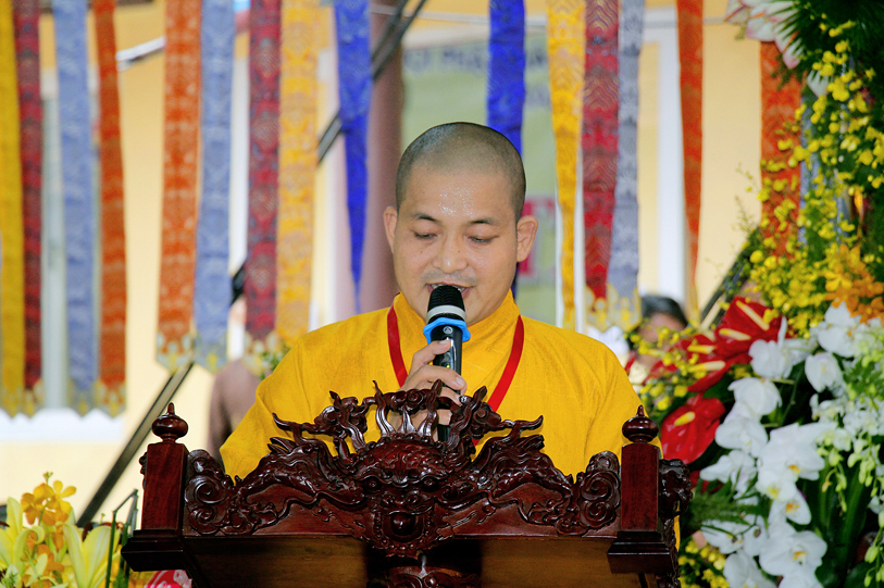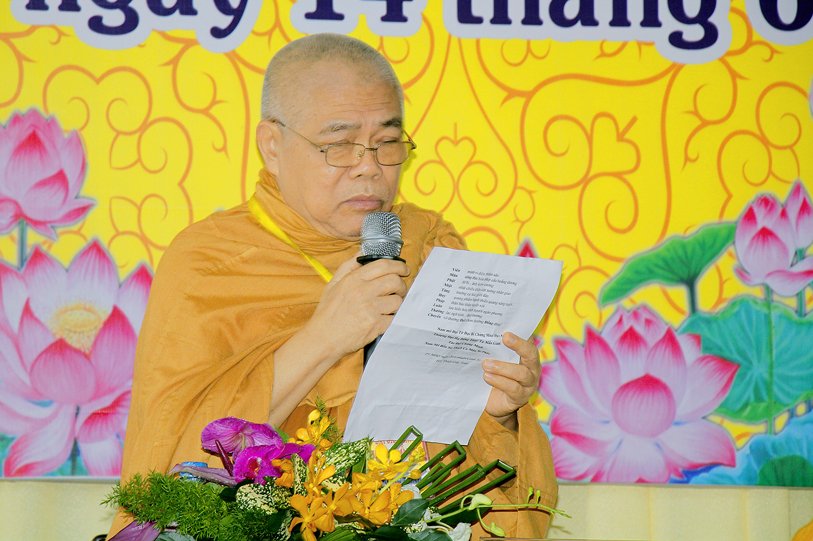 Sau phần nghi thức, TT. Thích Quảng Tâm – Uỷ Viên HĐTS TW; Phó Thường trực Ban Trị Sự GHPGVN Tỉnh Long An báo cáo kết quả tổ chức Đại giới đàn Đạt Đồng.