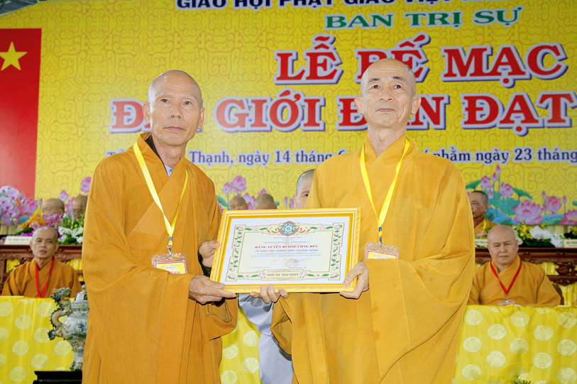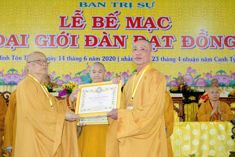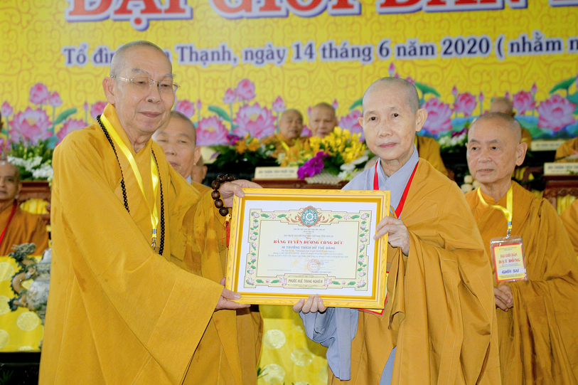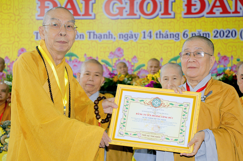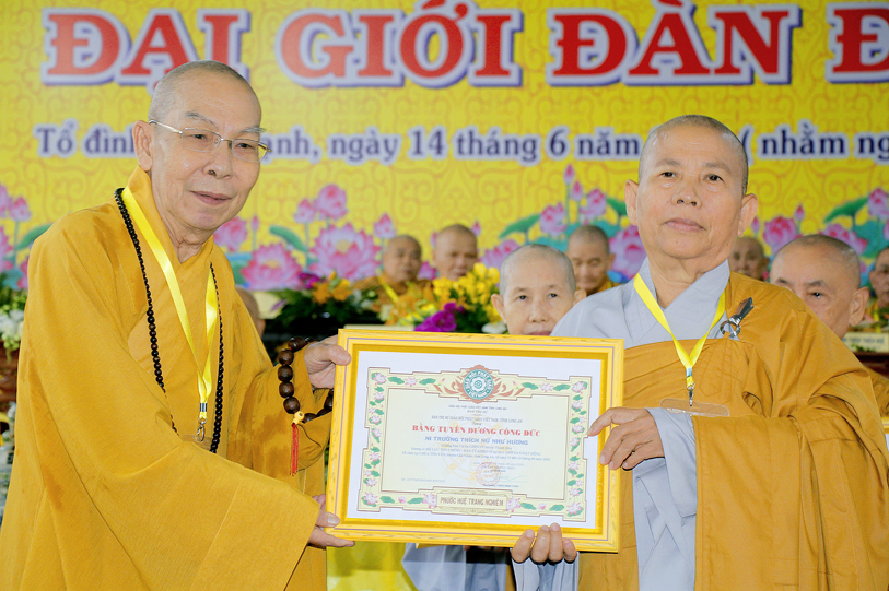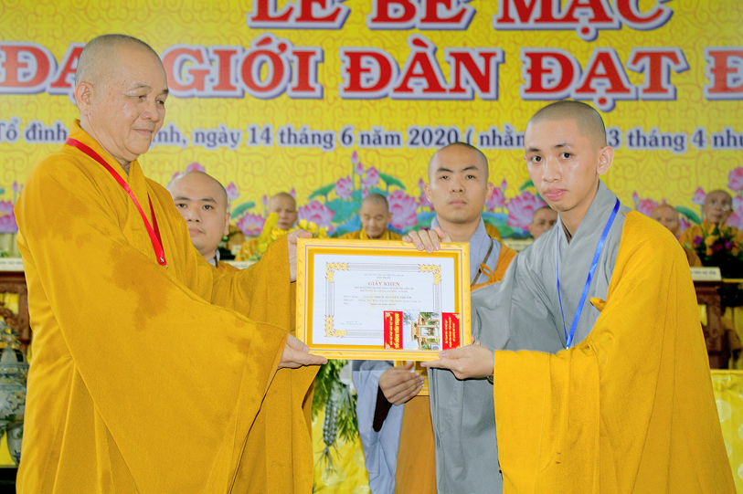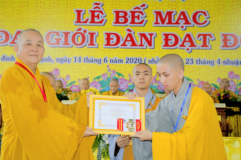 Sau báo cáo kết quả tổ chức Đại giới đàn, Ban tổ chức đã trao bằng tuyên dương công đức đến Hội đồng Thập sư Nhị bộ, chư giới tử đạt kết quả cao trong kỳ khảo thí giới đàn, các tổ chức, cá nhân đã phát tâm hộ đàn những ngày qua bằng tịnh tài, tịnh vật, bằng sự công quả thầm lặng v.v.