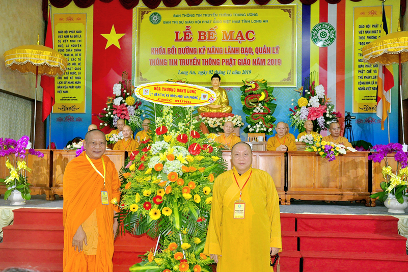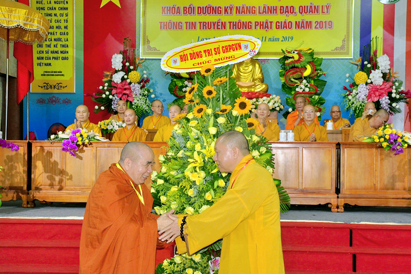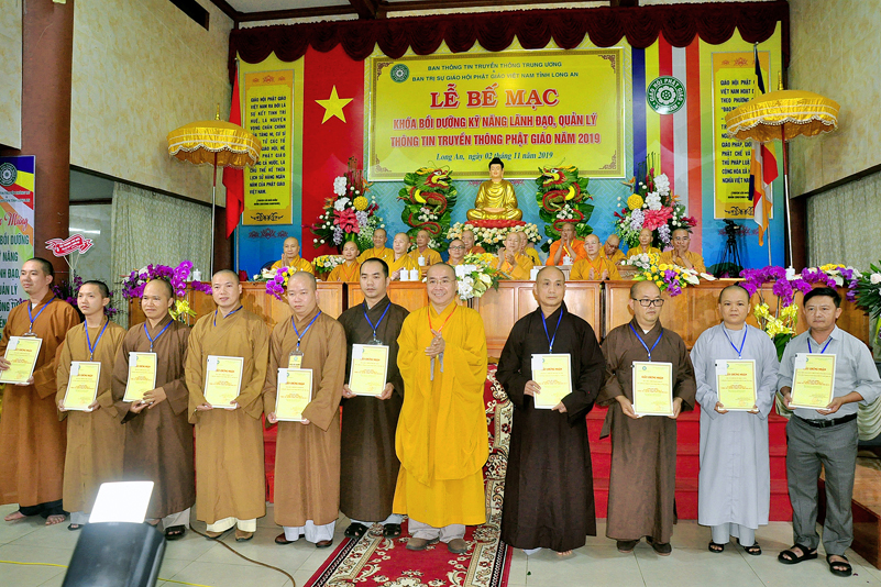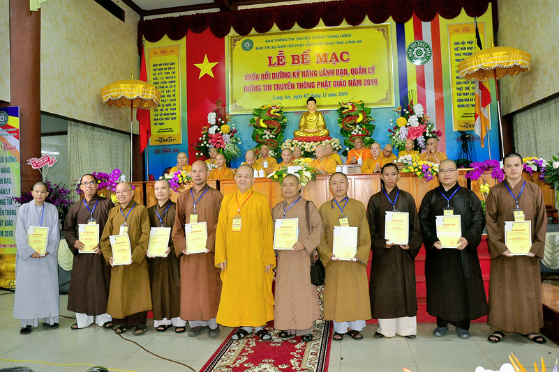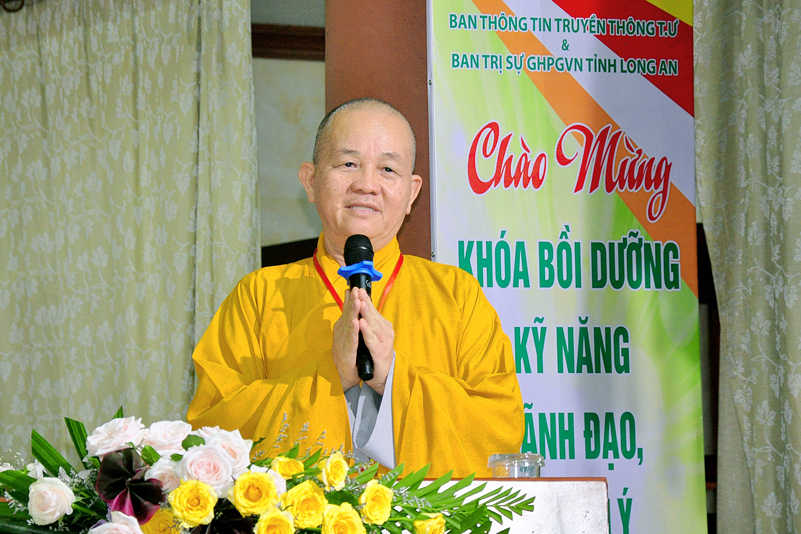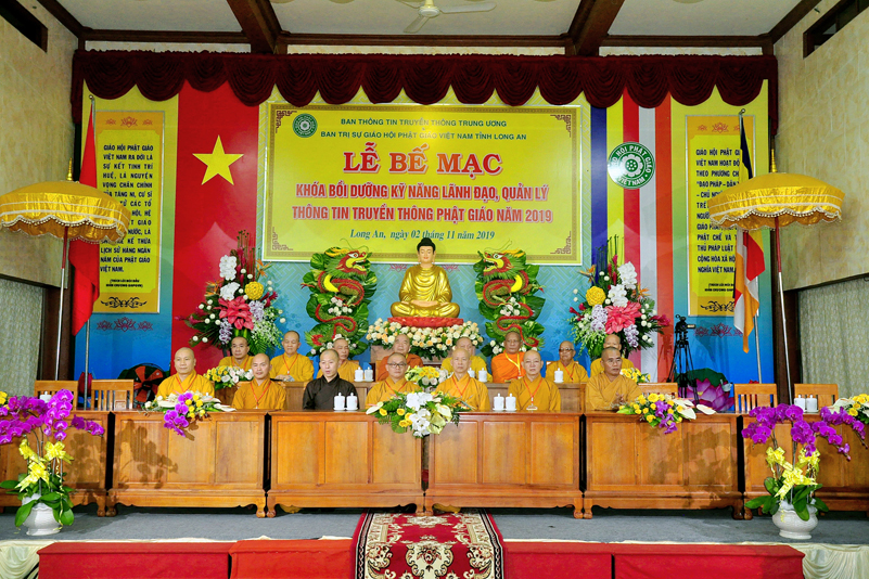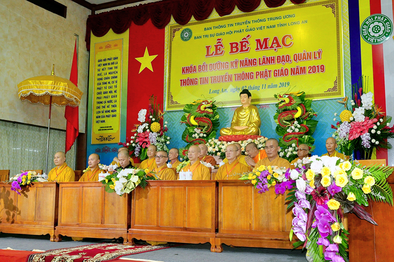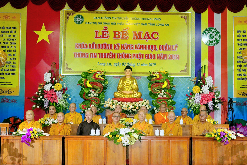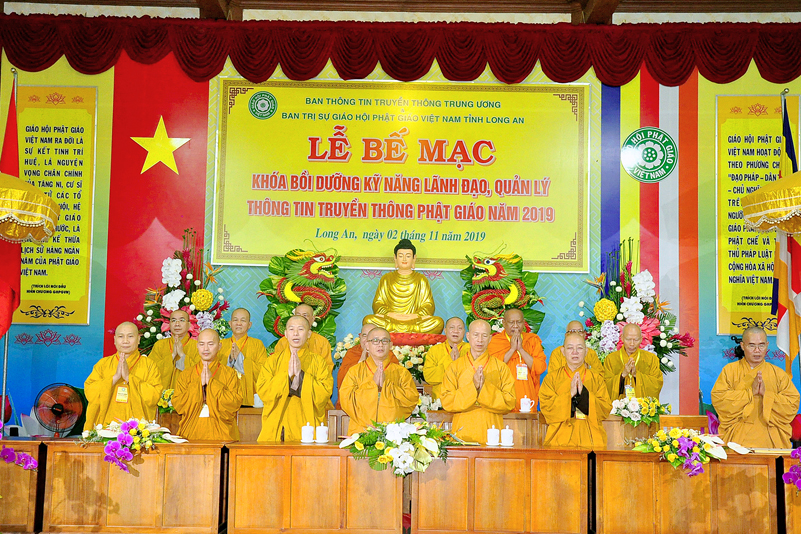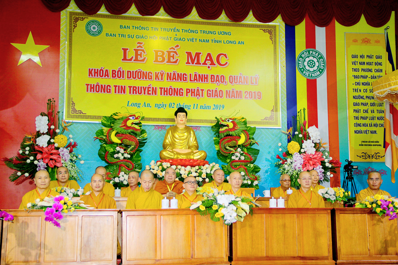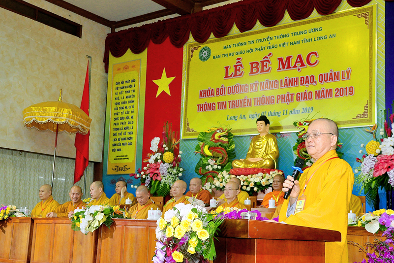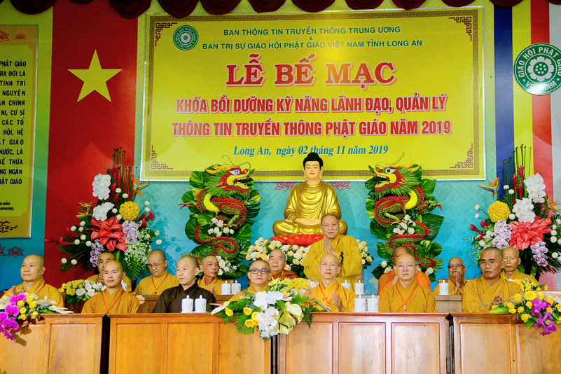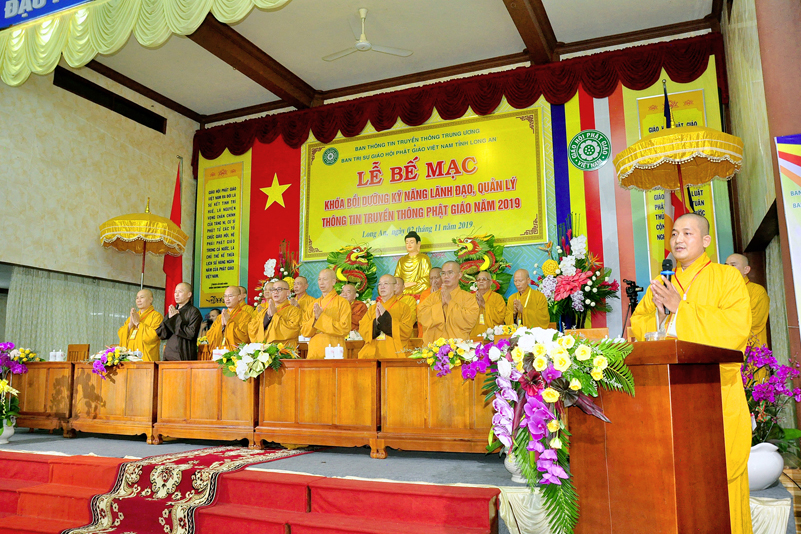 Cuối chương trình là lời cảm tạ. HT. Thích Minh Thiện – Ủy viên HĐTS, Trưởng ban Trị sự Giáo hội Phật giáo Việt Nam (BTS GHPGVN) tỉnh Long An, Phó Thường trực BTC đã tri ân sâu sắc đến HT. Thích Thiện Nhơn – Chủ tịch Hội đồng Trị sự GHPGVN đã thân lâm chứng minh, quan tâm chỉ đạo để Ban tổ chức thực hiện thành công tốt đẹp. Hòa thượng đã tri ân HT. Thích Gia Quang đã tạo điều kiện cho Phật giáo Long An được phối hợp tổ chức. Hòa thượng cảm ơn đến các cấp chính quyền tỉnh Long An đã tạo điều kiện thuận lợi cho BTC. Hòa thượng tri ân đến sự đồng tâm hiệp lực của toàn thể Tăng Ni, Phật tử trong toàn tỉnh để chung tay phối hợp để tổ chức Khóa Bồi dưỡng kỹ năng lãnh đạo, quản lý thông tin truyền thông Phật giáo toàn quốc năm 2019, do Ban Thông tin – Truyền thông Trung ương GHPGVN phối hợp cùng BTS GHPG tỉnh Long An tổ chức.