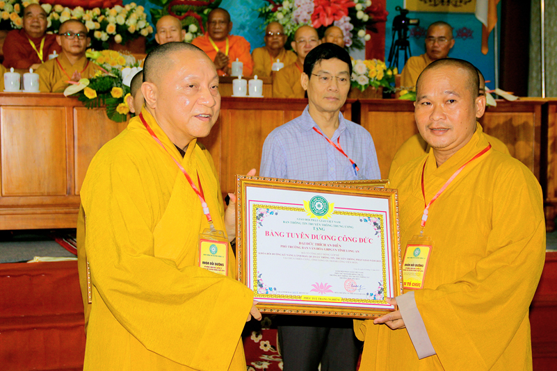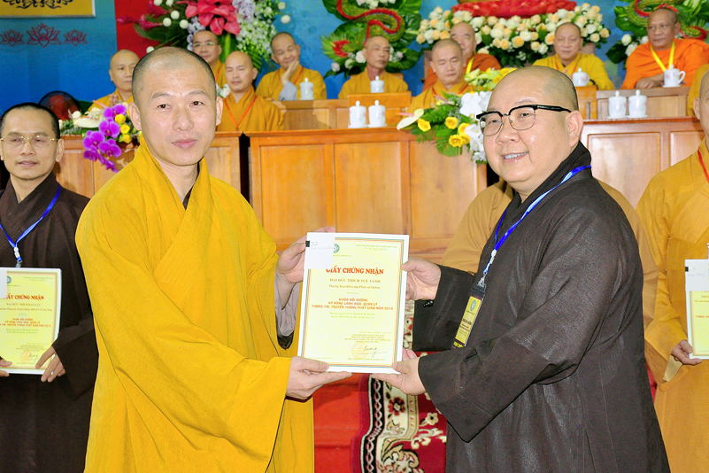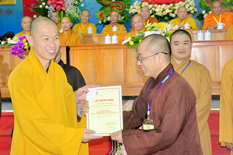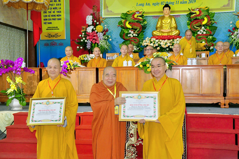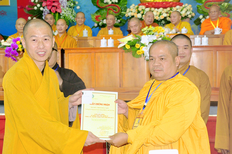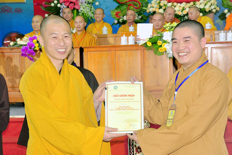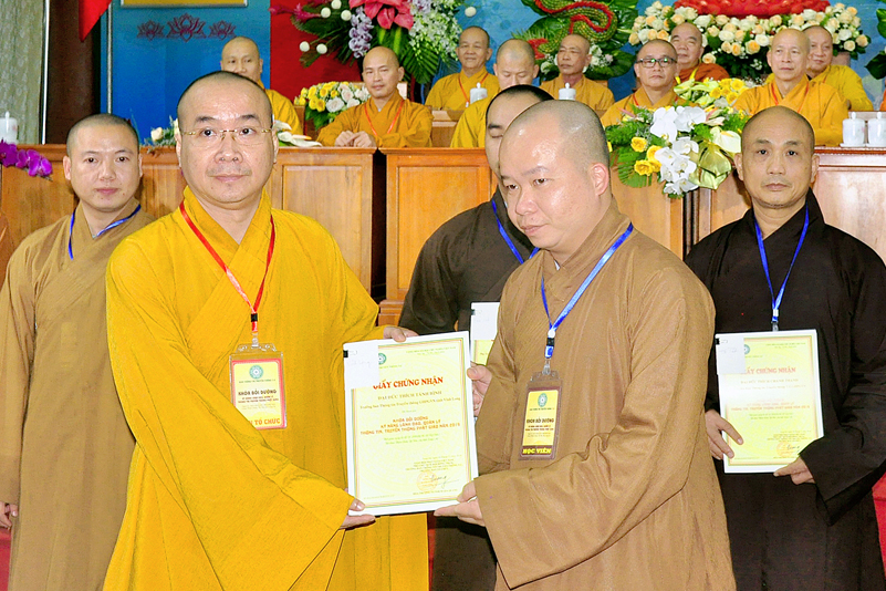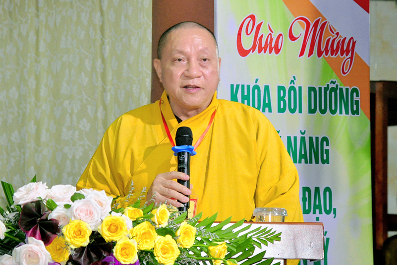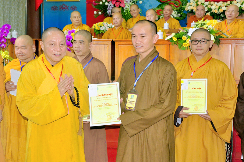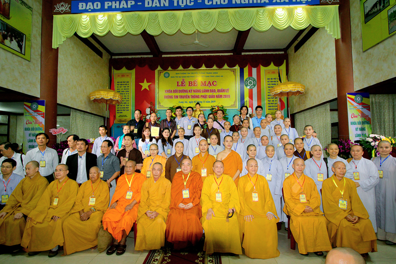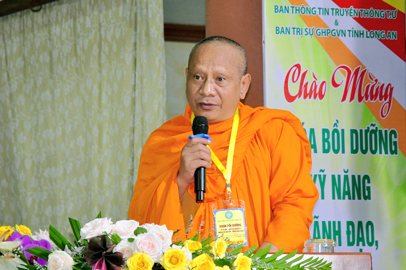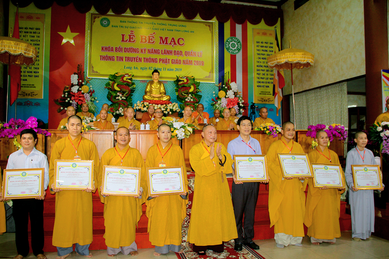 Cuối chương trình là lời cảm tạ. HT. Thích Minh Thiện – Ủy viên HĐTS, Trưởng ban Trị sự Giáo hội Phật giáo Việt Nam (BTS GHPGVN) tỉnh Long An, Phó Thường trực BTC đã tri ân sâu sắc đến HT. Thích Thiện Nhơn – Chủ tịch Hội đồng Trị sự GHPGVN đã thân lâm chứng minh, quan tâm chỉ đạo để Ban tổ chức thực hiện thành công tốt đẹp. Hòa thượng đã tri ân HT. Thích Gia Quang đã tạo điều kiện cho Phật giáo Long An được phối hợp tổ chức. Hòa thượng cảm ơn đến các cấp chính quyền tỉnh Long An đã tạo điều kiện thuận lợi cho BTC. Hòa thượng tri ân đến sự đồng tâm hiệp lực của toàn thể Tăng Ni, Phật tử trong toàn tỉnh để chung tay phối hợp để tổ chức Khóa Bồi dưỡng kỹ năng lãnh đạo, quản lý thông tin truyền thông Phật giáo toàn quốc năm 2019, do Ban Thông tin – Truyền thông Trung ương GHPGVN phối hợp cùng BTS GHPG tỉnh Long An tổ chức.
