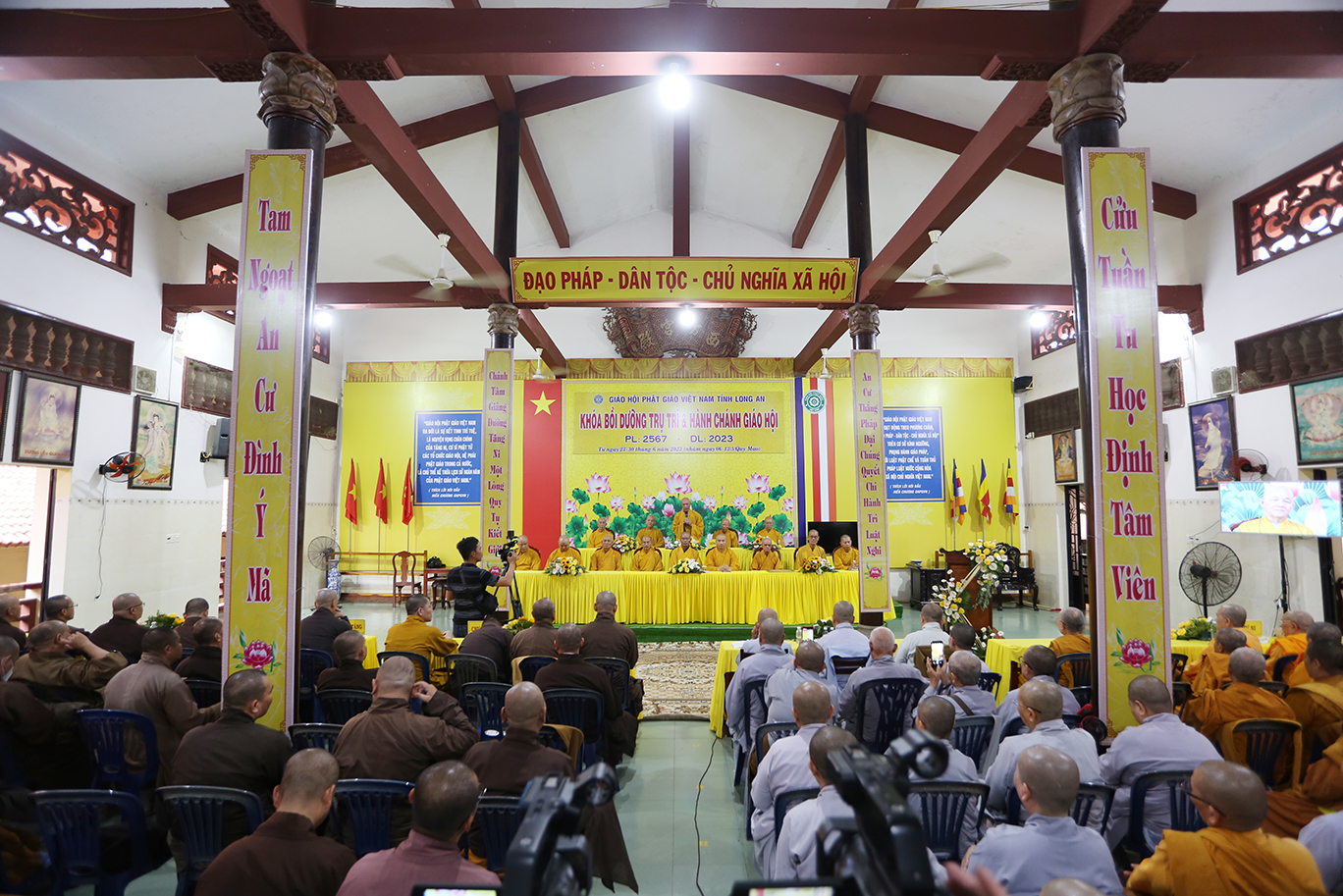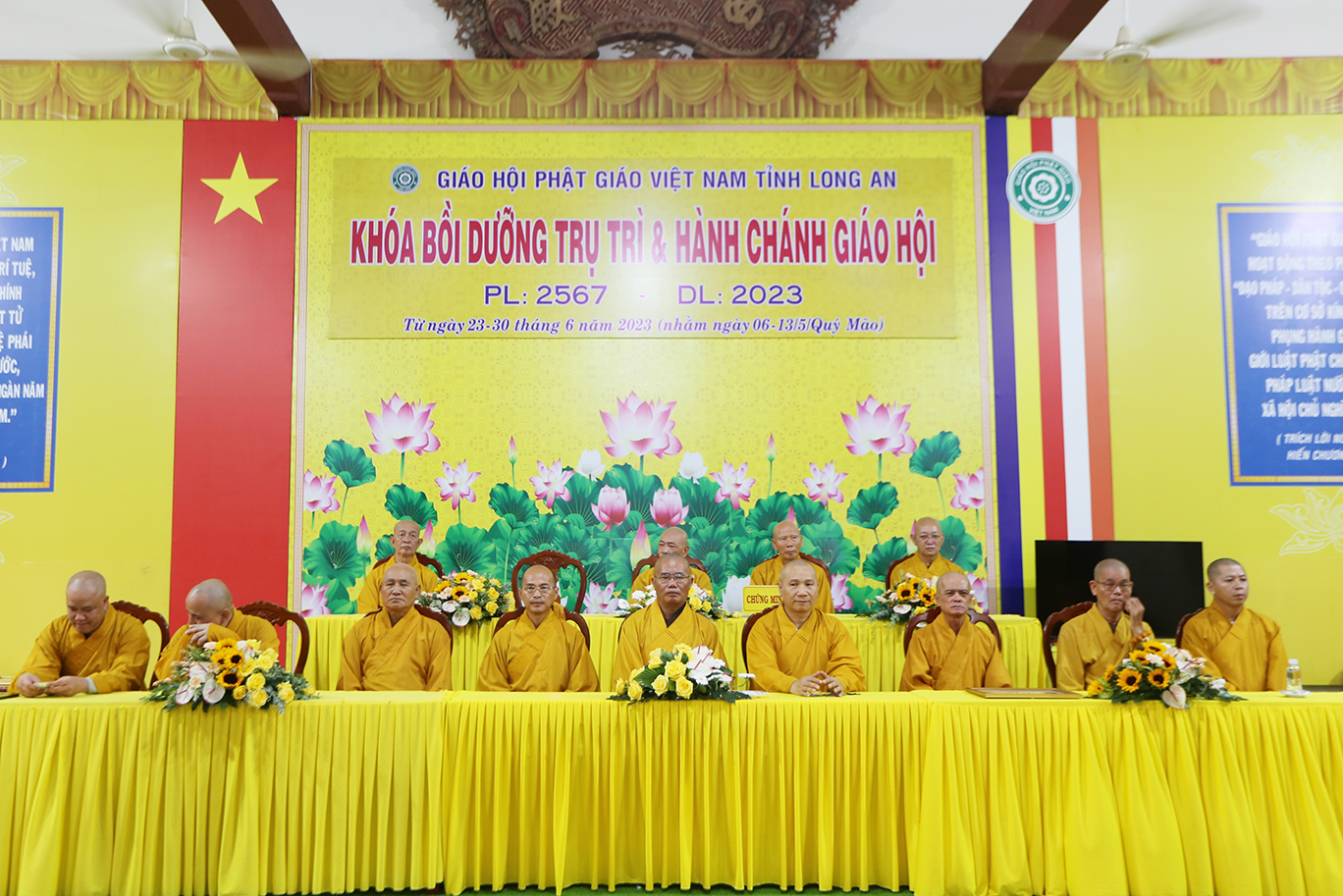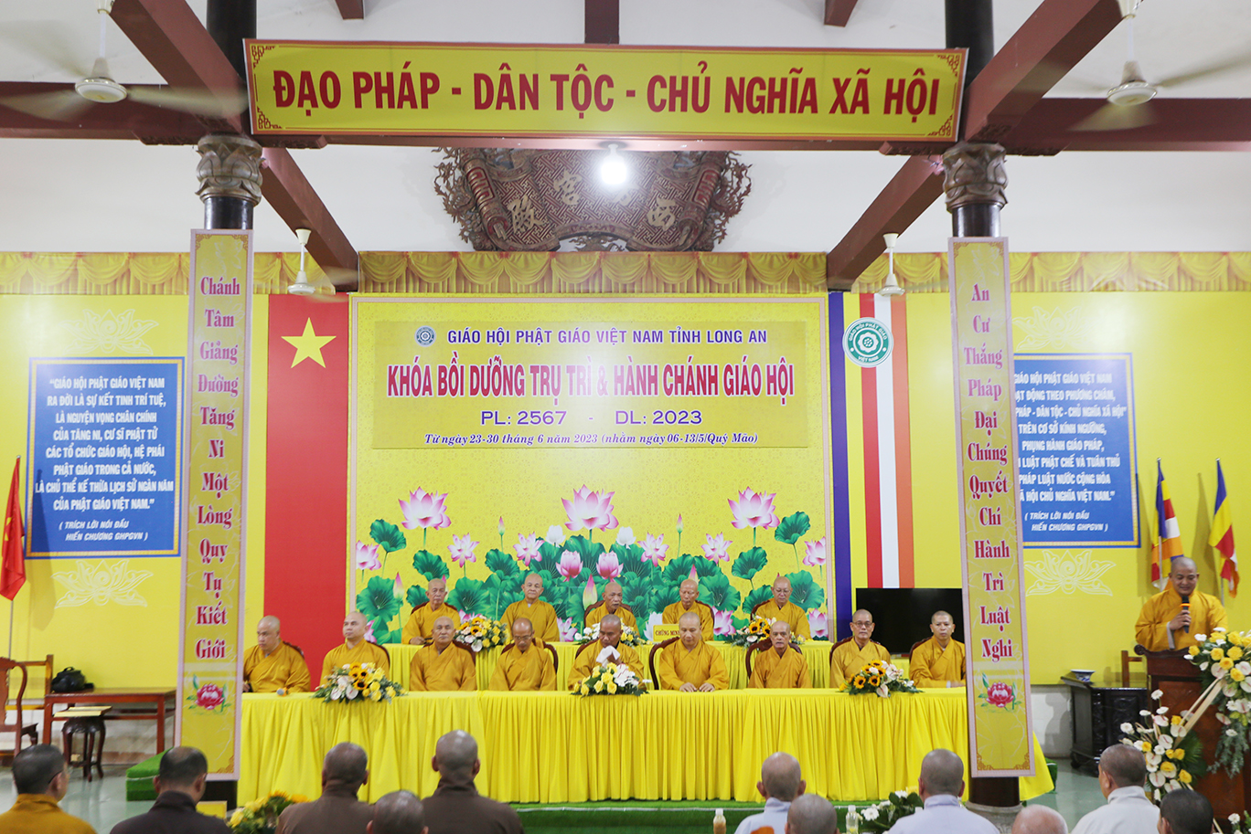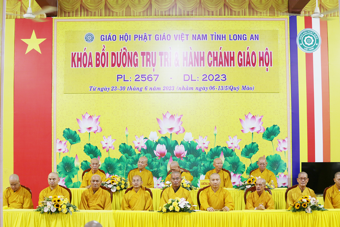 Thay mặt Ban Tổ chức, ĐĐ. Thích Lệ Duyên báo cáo kết quả Khóa Bồi Dưỡng Trụ Trì Và Hành Chính Giáo Hội Năm 2023. Theo đó, khóa học diễn ra từ ngày 23-30/6/2023 (nhằm ngày 6-13/5/Quý Mão) tại Chùa Kim Cang, ấp Bình Cang, xã Bình Thạnh, huyện Thủ Thừa, tỉnh Long An với 420 Tăng Ni tham dự. Lễ Khai mạc được cung nghinh HT. Thích Thiện Huệ – Thành viên HĐCM, Chứng minh BTS GHPGVN tỉnh Long An; HT. Thích Thiện Nhơn – Chủ tịch HĐTS; HT. Thích Thiện Pháp – Phó Chủ tịch Thường trực HĐTS; HT. Thích Thiện Thống – Phó Chủ tịch HĐTS.
