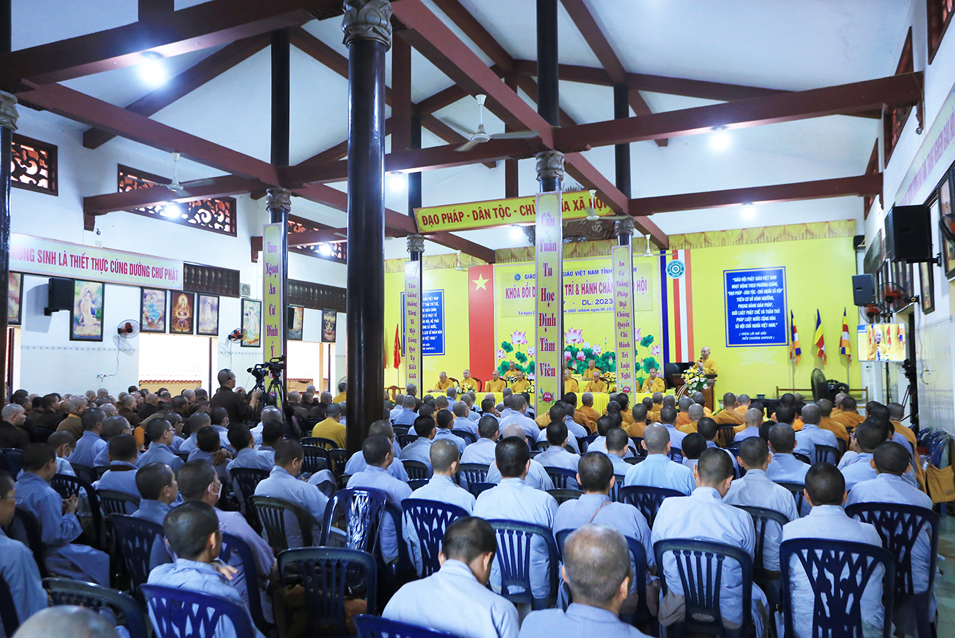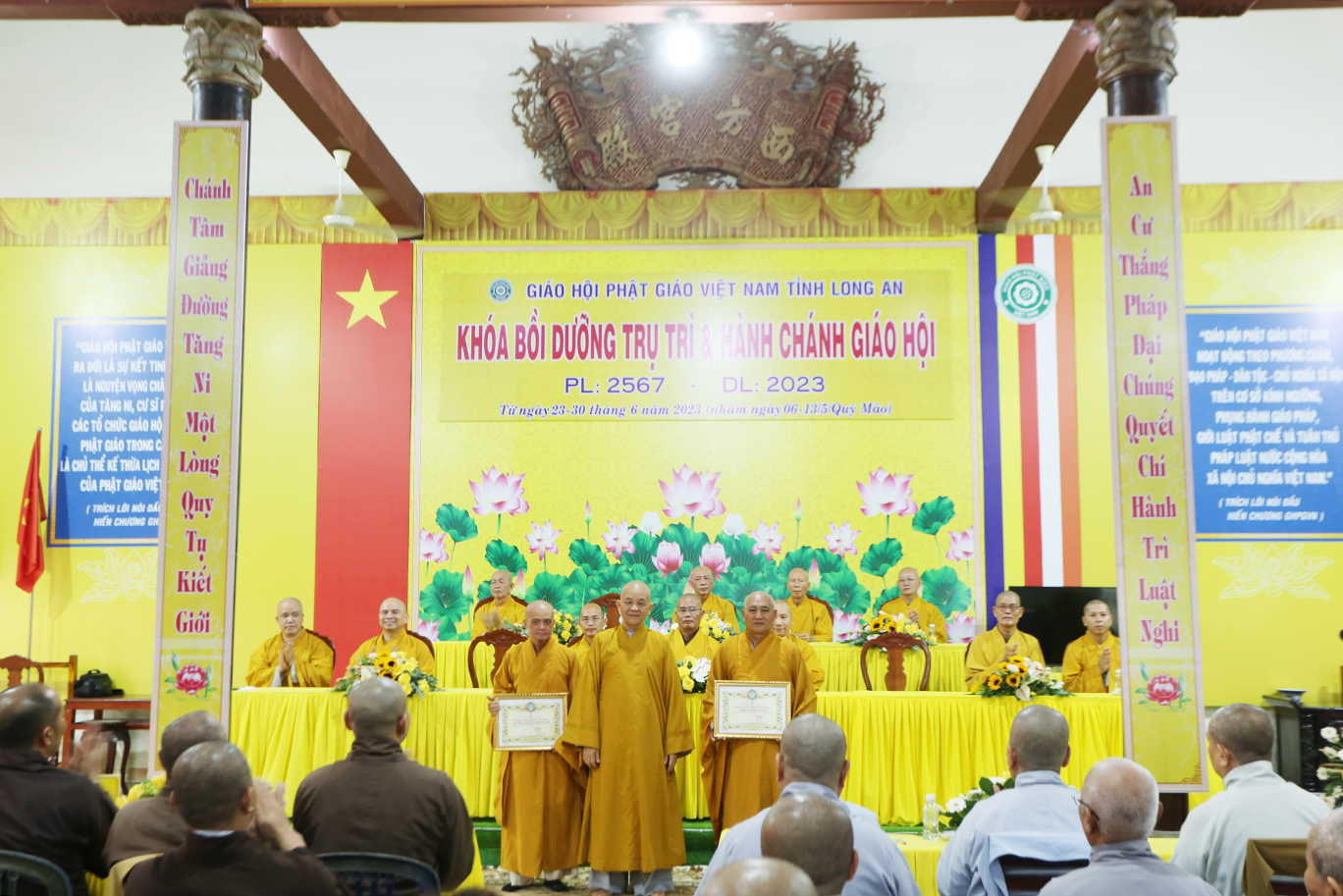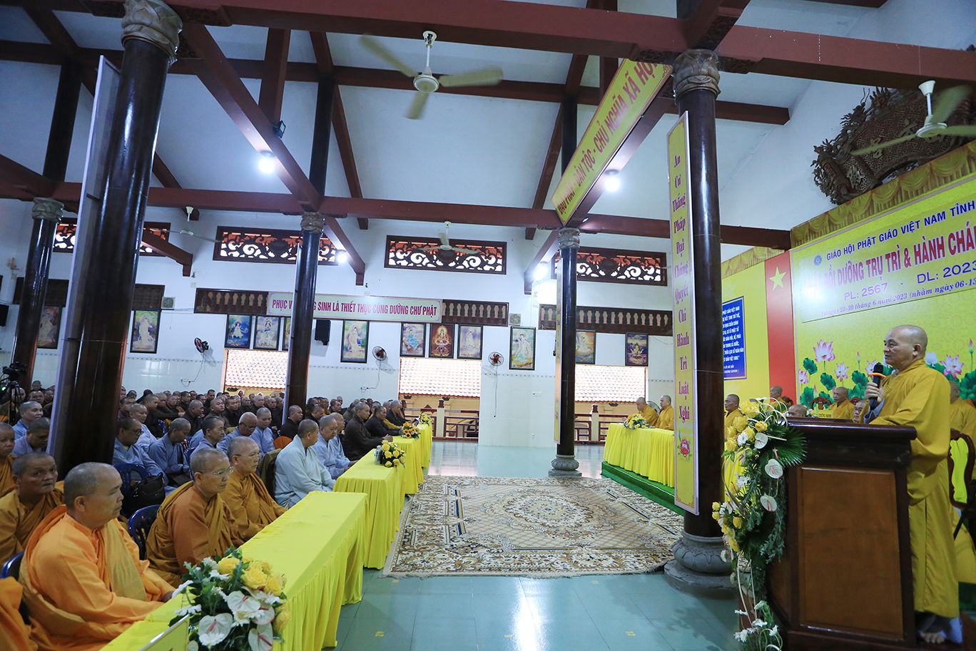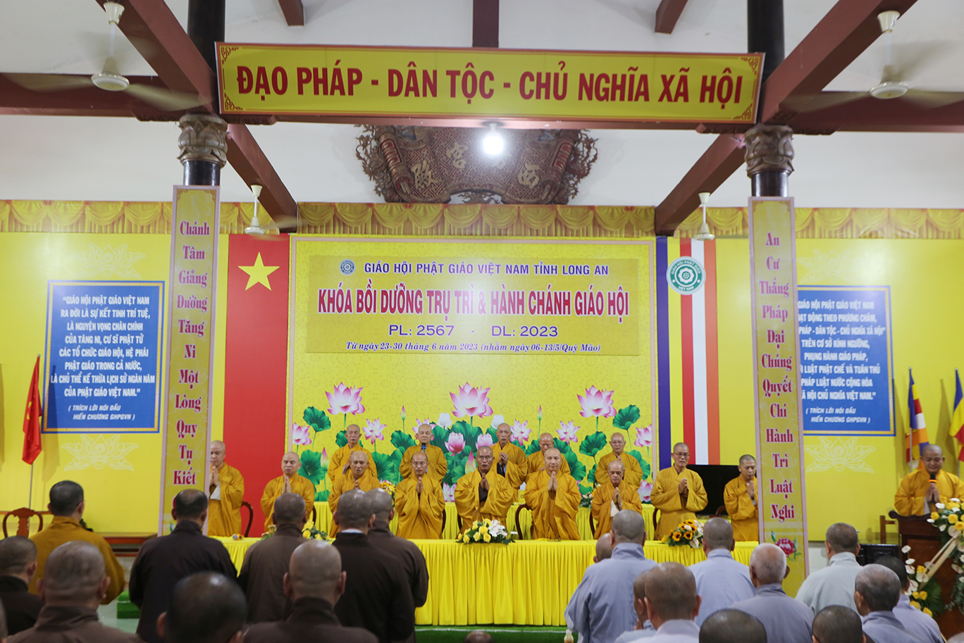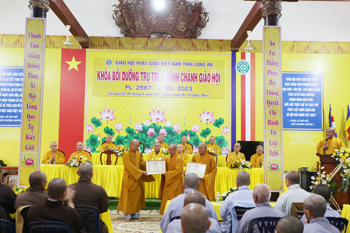 Thay mặt Ban Tổ chức, ĐĐ. Thích Lệ Duyên báo cáo kết quả Khóa Bồi Dưỡng Trụ Trì Và Hành Chính Giáo Hội Năm 2023. Theo đó, khóa học diễn ra từ ngày 23-30/6/2023 (nhằm ngày 6-13/5/Quý Mão) tại Chùa Kim Cang, ấp Bình Cang, xã Bình Thạnh, huyện Thủ Thừa, tỉnh Long An với 420 Tăng Ni tham dự. Lễ Khai mạc được cung nghinh HT. Thích Thiện Huệ – Thành viên HĐCM, Chứng minh BTS GHPGVN tỉnh Long An; HT. Thích Thiện Nhơn – Chủ tịch HĐTS; HT. Thích Thiện Pháp – Phó Chủ tịch Thường trực HĐTS; HT. Thích Thiện Thống – Phó Chủ tịch HĐTS.