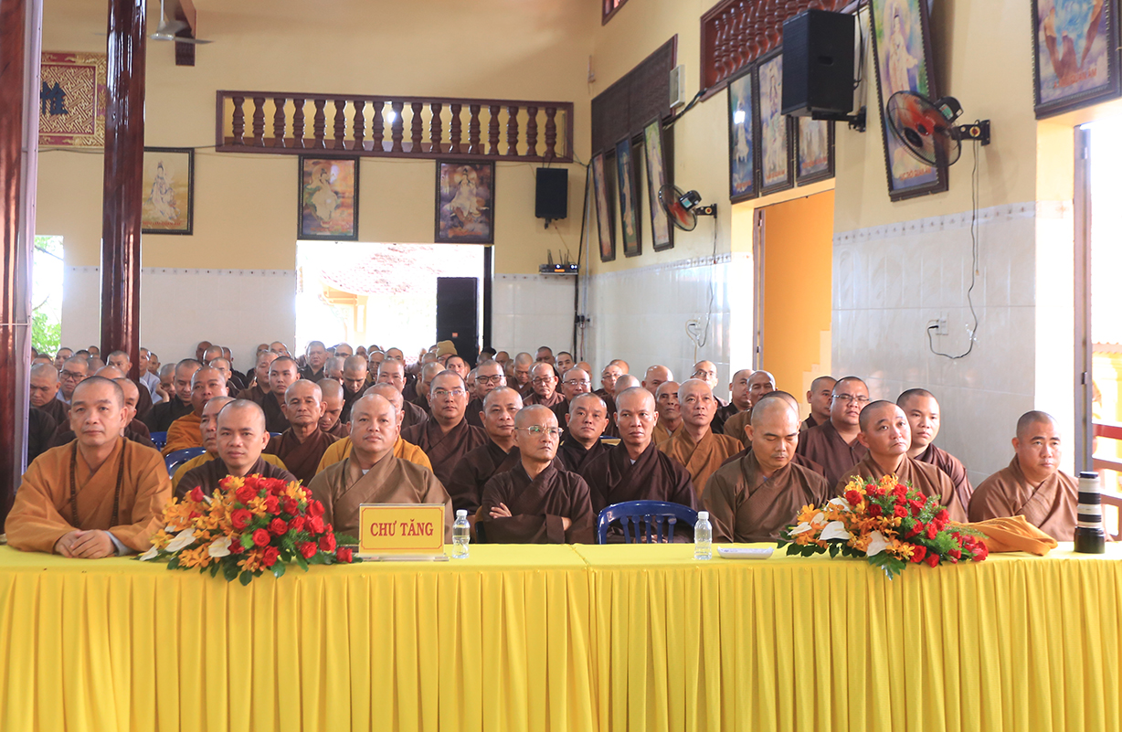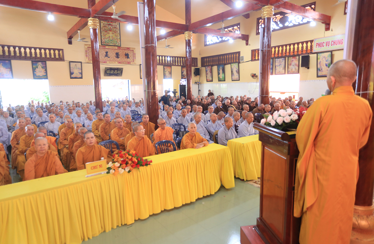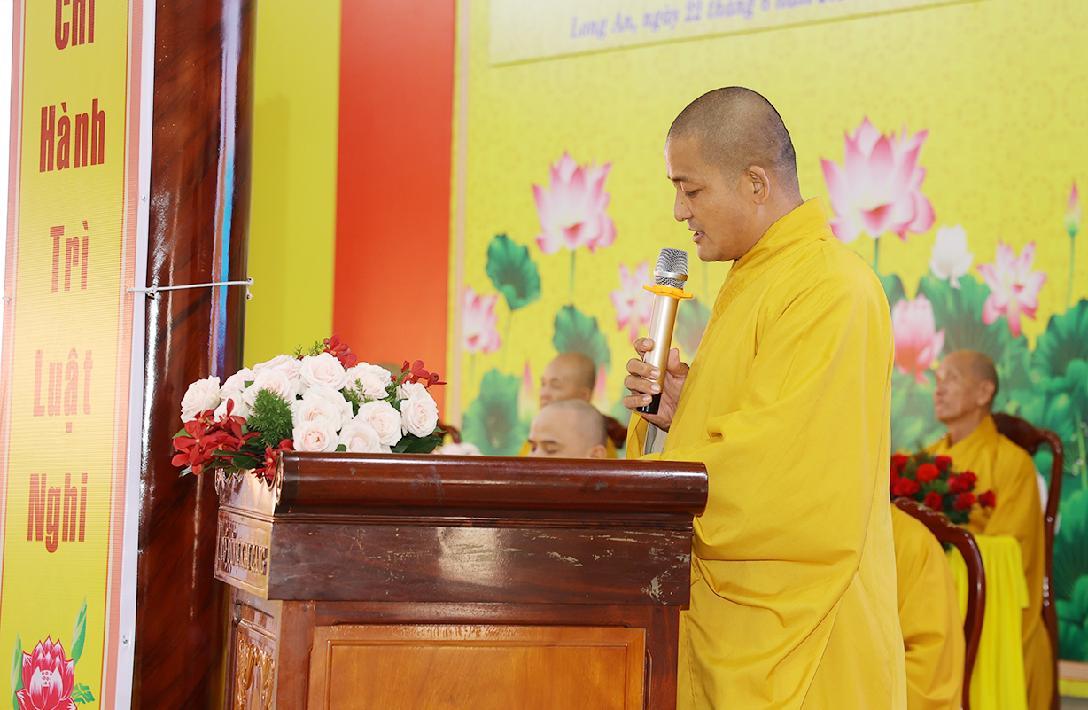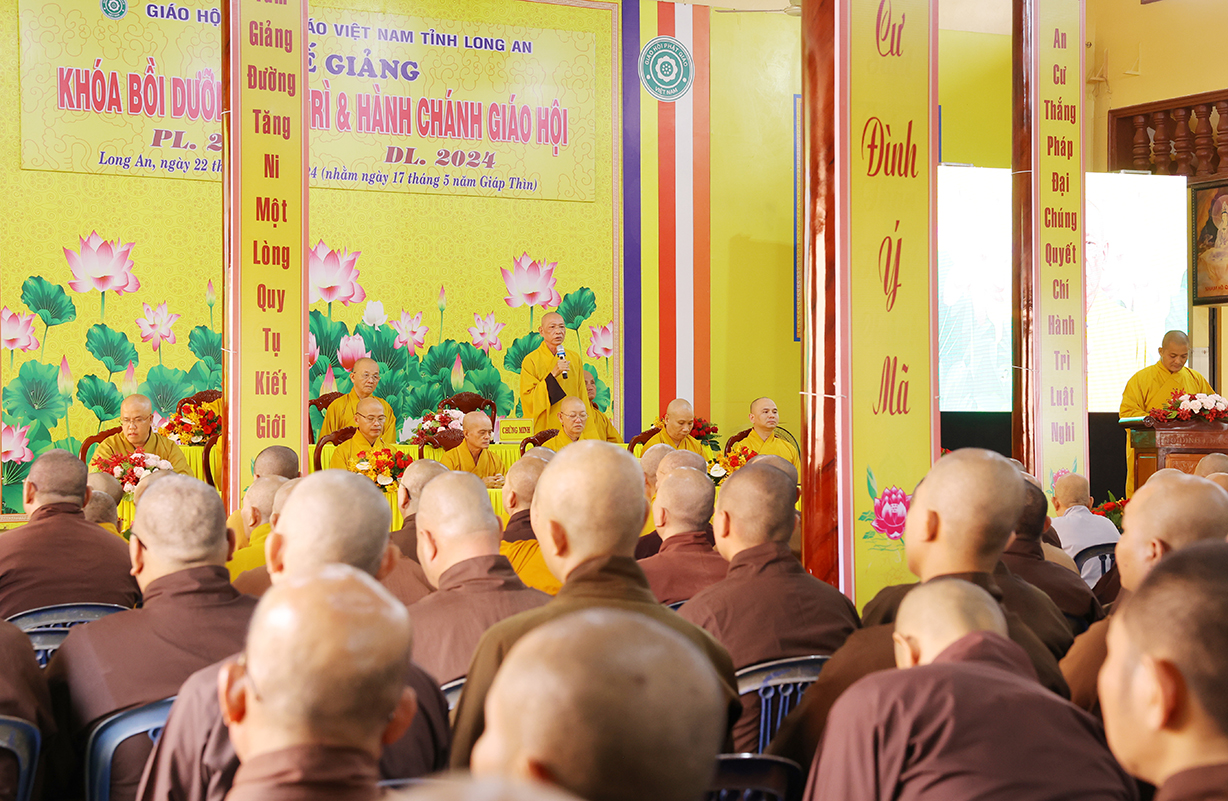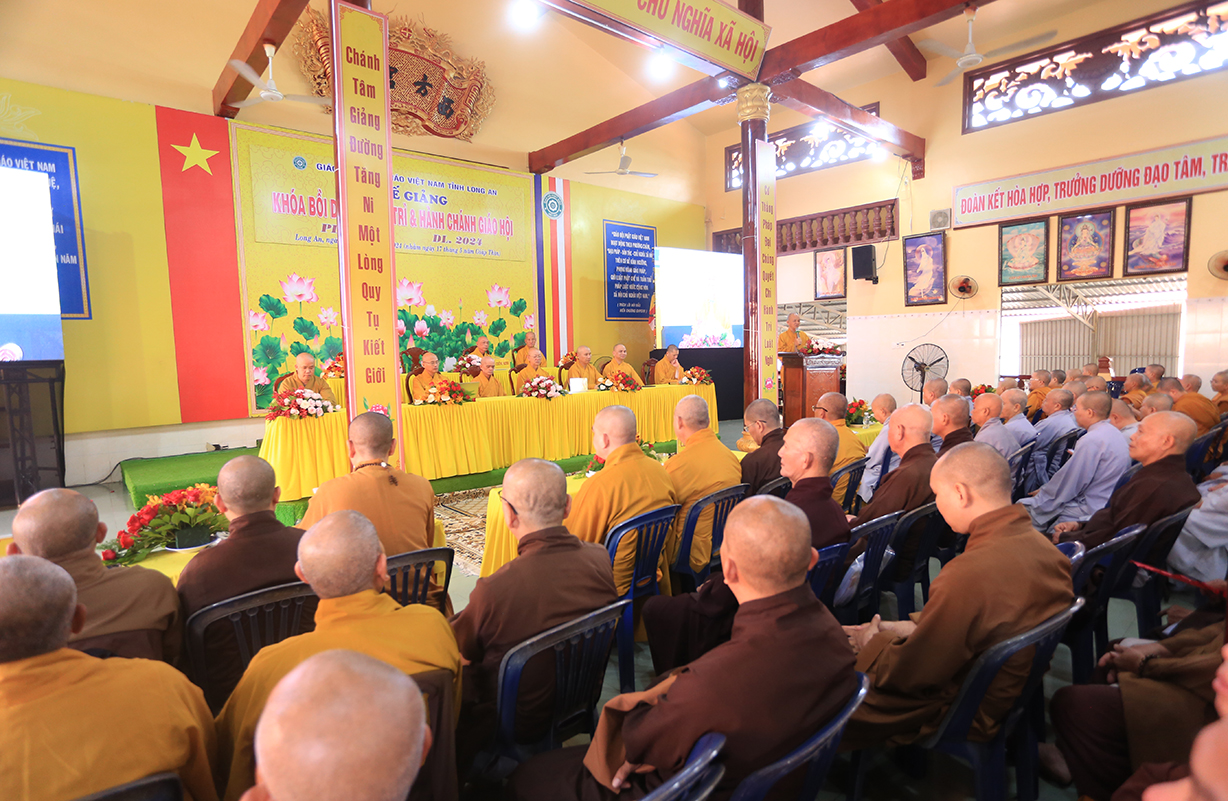Theo đó, Sau lễ khai mạc, Chư Tôn đức giáo phẩm Hội đồng Trị sự GHPGVN, Ban Trị sự GHPGVN tỉnh Long An và báo cáo viên của đại diện Ban Tôn giáo, giảng viên Trường đại học FPT, Trường Đại học Khoa học Xã hội và Nhân văn thuyết giảng và triển khai  nhiều chuên đề như: Hòa thượng Thích Thiện Thống, Phó Chủ tịch Hội đồng Trị sự, Phó Trưởng ban kiêm Chánh Thư ký Ban Tăng sự TƯ, triển khai “Quy chế Hoạt động Ban Tăng sự TƯ”; Thượng tọa Thích Tâm Hải, Trưởng ban TTTT GHPGVN Tp HCM, Tổng biên tập Báo Giác Ngộ, chia sẻ “Một số vấn đề về truyền thông Phật giáo hiện tại”.Ông Nguyễn Văn Mưng, Trưởng ban Tôn giáo tỉnh Long An, triển khai “Luật tín ngưỡng tôn giáo và Nghị định 95”. Đại đức Thích Lệ Ngôn, Phó Trưởng ban kiêm Trưởng ban Hoằng pháp GHPGVN tỉnh, chia sẻ “Việc học Phật pháp và ứng dụng trong đời sống Tăng Ni”.