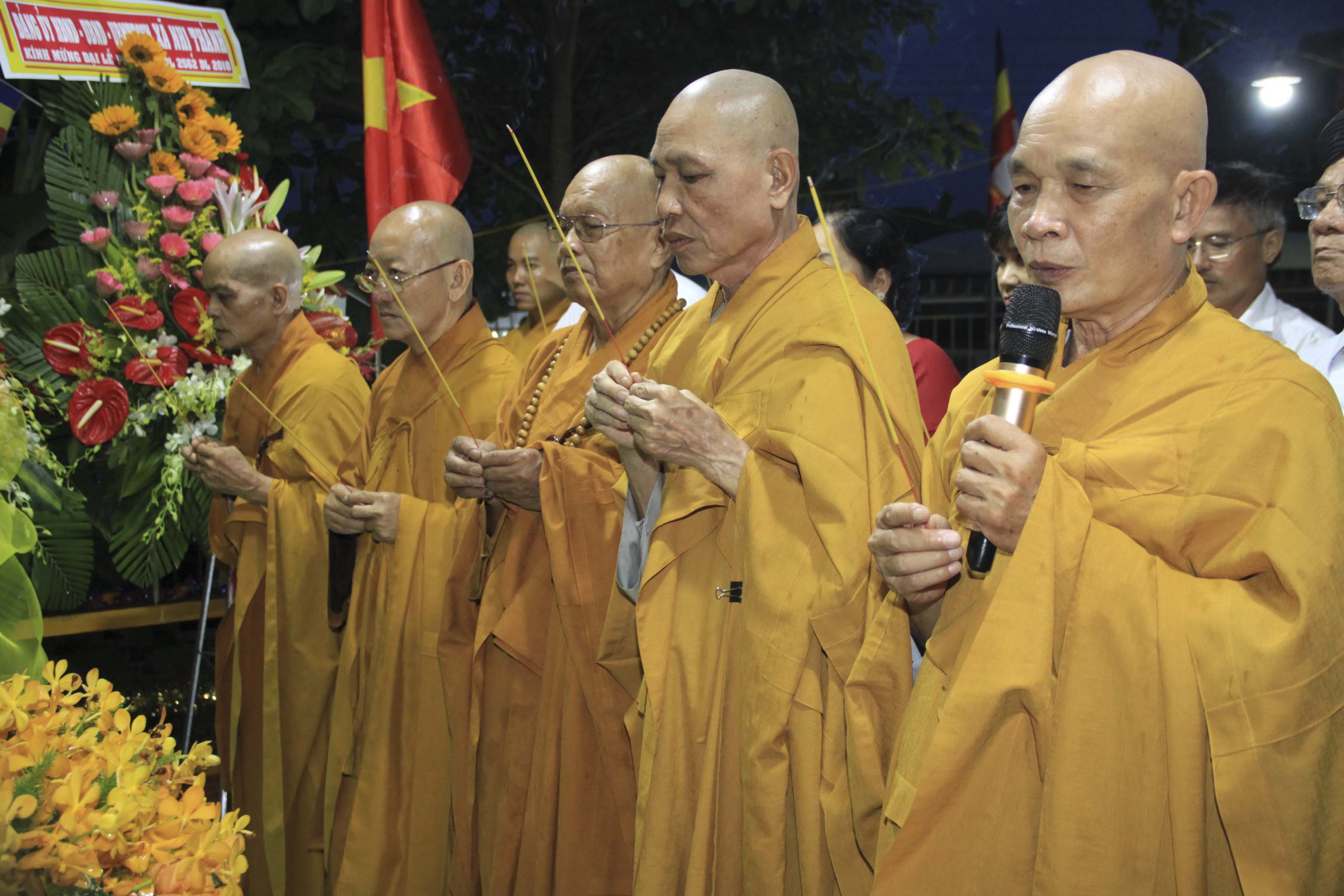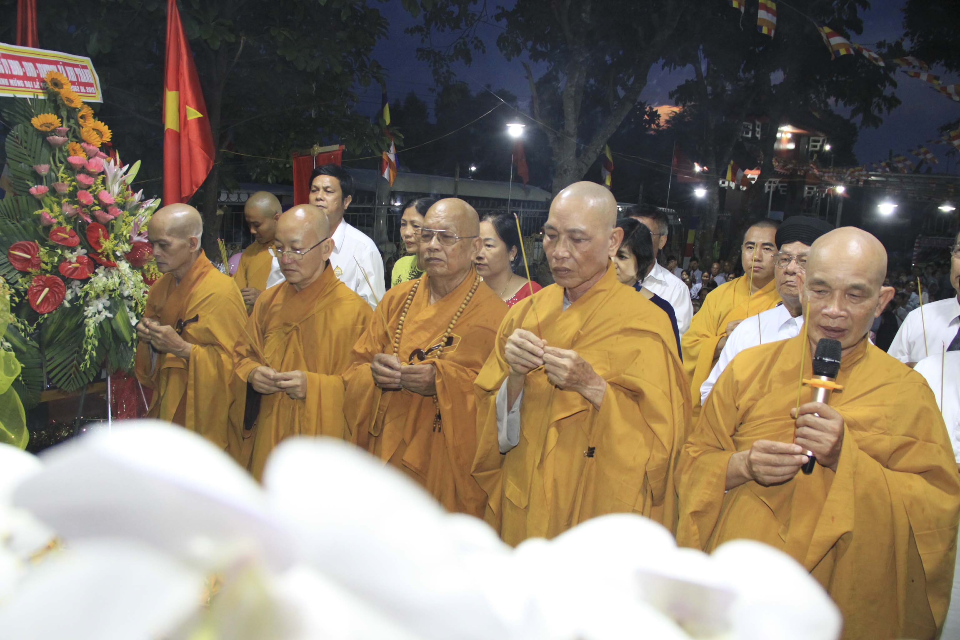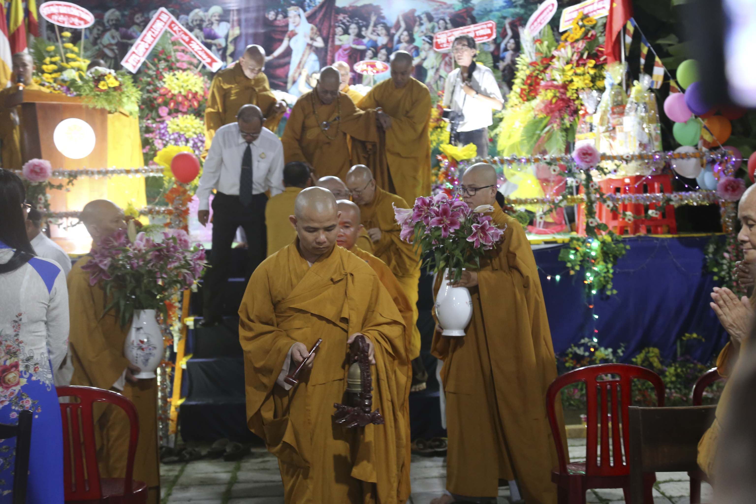 Từng hồi chuông trống Bát-nhã trầm hùng vang dội, buổi lễ Kính mừng Phật đản chính thức bắt đầu. Sau các phần nghi thức chào quốc kỳ, Ban tổ chức cung thỉnh chư Tôn đức Giáo phẩm, chư Tôn đức Tăng Ni đồng kính niệm, dâng hoa cúng dường Đức Phật Sơ sinh.