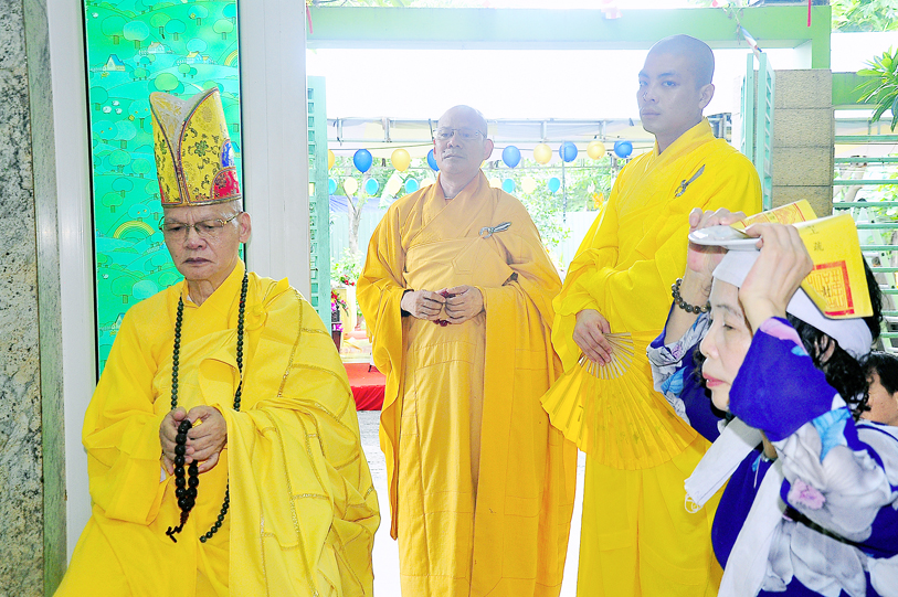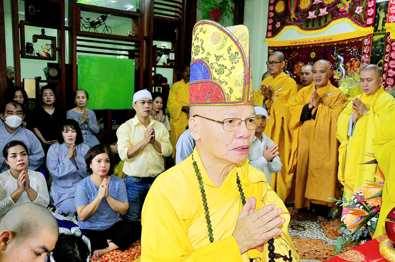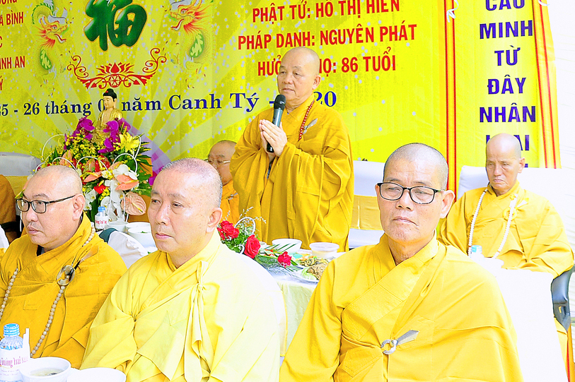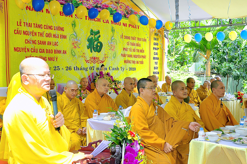 Buổi lễ được thực hiện theo phương pháp báo hiếu song thân mà kinh Vu Lan – Báo Hiếu đã dạy cho người đệ tử Phật. Trong phần lễ nghi, Hòa thượng Thích Minh Thiện có lời đạo từ đến hiếu tử, hiếu tôn của cụ bà Hồ Thị Hiền pháp danh Nguyên Phát: Hòa thượng tán thán đạo tâm, đạo hạnh của của bà cụ, hết lòng tôn kính và tận tâm hộ trì Tam Bảo, giáo dục con cháu sống theo lời Phật dạy. Hòa thượng nhắc những người con, người cháu thật có phước để được làm con, làm cháu của cụ, một người mẹ, người bà đức từ mẫu mực. Cuộc đời của cụ là bằng chứng sống về đạo đức, về niềm tin Tam Bảo cho con cháu noi theo. Khi hay tin con mình là Phật tử Nguyên Oanh bị ung thư máu, cụ ngày đêm trì kinh, niệm kệ, đến các chùa hữu duyên thỉnh chư tôn đức lập Đàn Dược sư mà khỏi bệnh đến nay hơn 15 năm.  Nhiều và nhiều câu chuyện như thế trong đời cụ. Hòa thượng răng con cháu của cụ tiếp nối giá trị về đạo tâm, nhân phẩm cao đẹp của cụ để dạy cho con cháu của mình về sau cũng chính là hiếu thảo với cụ. Về hiếu đạo Hoà thượng dạy “Hiếu cảm đến trời thì mưa thuận gió hoà, hiếu cảm đến cây cỏ thì ra hoa tốt trái lành, hiếu cảm đến người thì ai ai cũng kính quý!” và “điều thiện tối cao không gì hơn hiếu, điều ác tột cùng không gì hơn bất Hiếu” . Lời dạy và di huấn của cụ, Hòa thượng mong con cháu luôn ghi nhớ làm lẽ sống cho chính mình. Cuối lời Hòa thượng tán thán hiếu tâm, hiếu hạnh của Phật tử Nguyên Oanh cũng như toàn thể gia đình là vâng lời Phật dạy tác phước kỳ siêu cho cụ từ ngày cụ qua đời đến ngày chung thất.