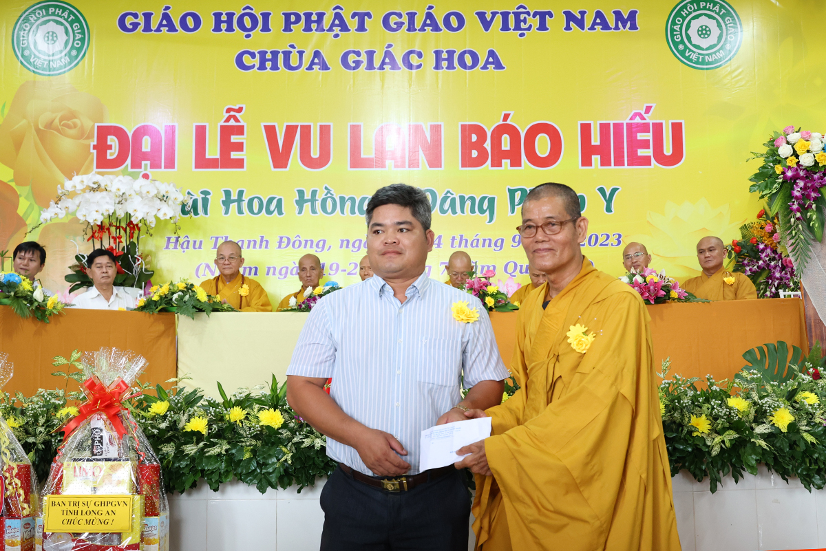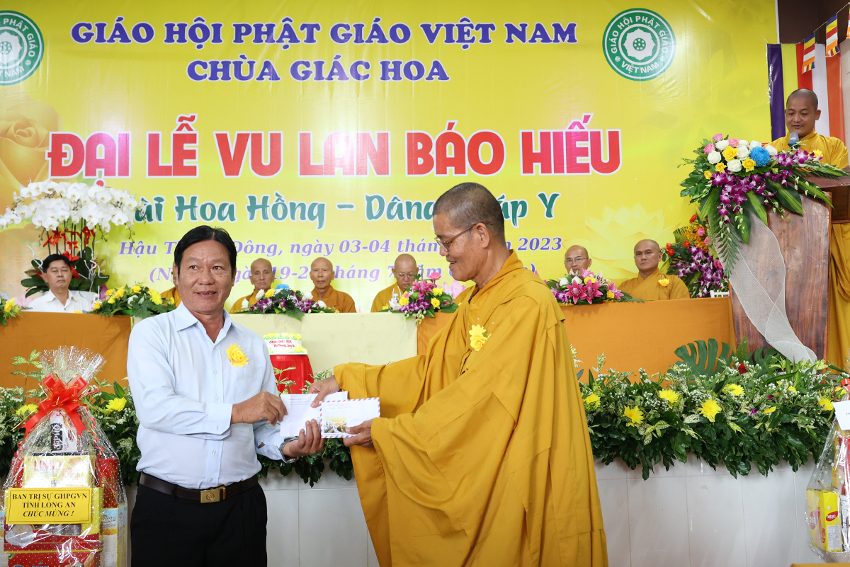 Ban đạo từ tại buổi lễ, Hòa Thượng Thích Minh Thiện – Ủy Viên HĐTS, Phó trưởng Ban Hoằng pháp TƯ, Trưởng BTS GHPGVN tỉnh Long An đã tán dương công đức Thượng tọa trụ trì chùa Giác Hoa trên tinh thần hiếu đạo đã hướng dẫn Phật tử đạo tràng tổ chức đại lễ Vu lan báo hiếu để nhớ ơn đến ân sinh dưỡng của hai đấng sinh thành cha và mẹ. Hòa thượng cũng chia sẻ về ý nghĩa tứ trọng ân, khuyến tấn Phật tử thực tập hạnh hiếu, sống và làm việc có ý nghĩa để xứng đáng là một người con Phật.
