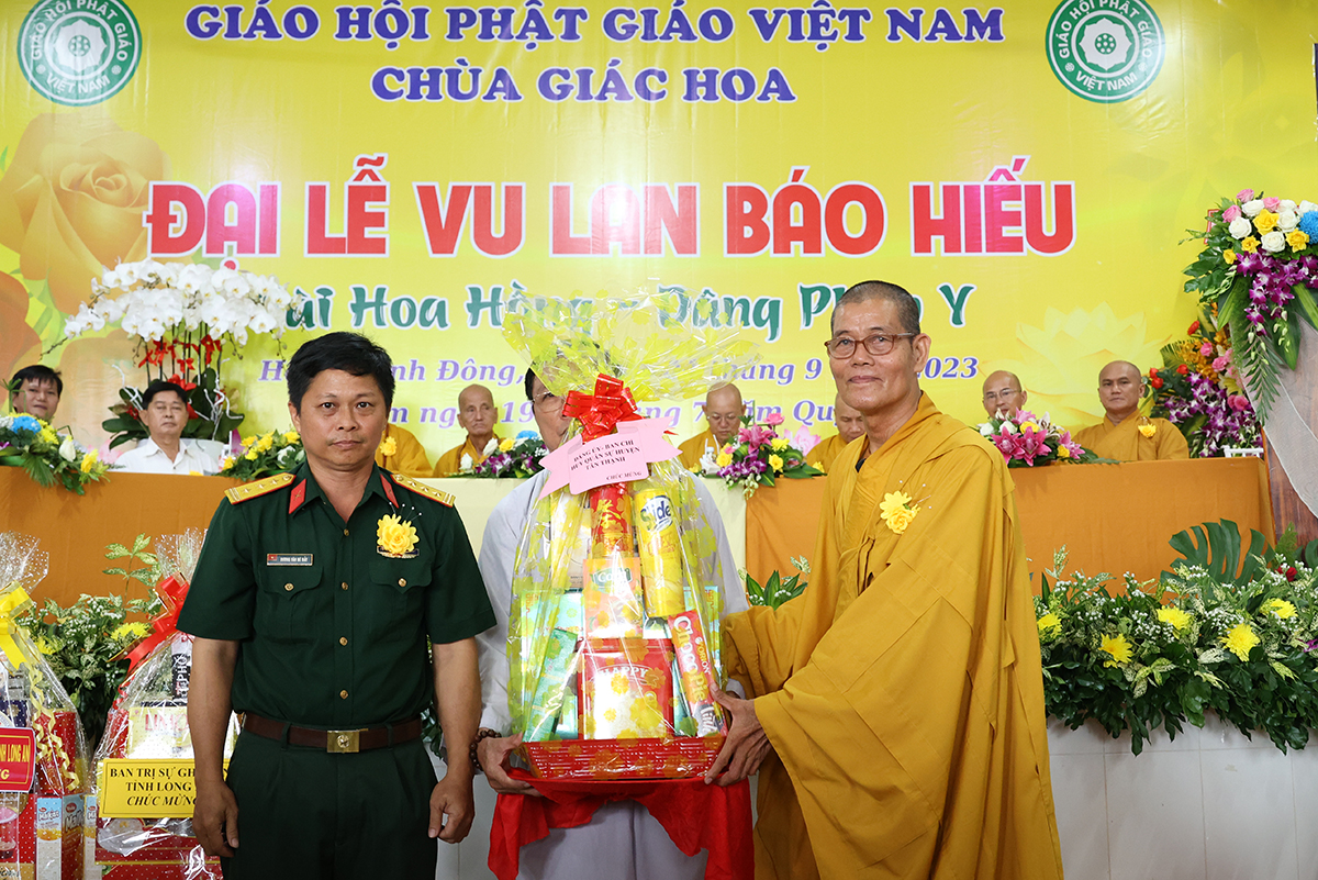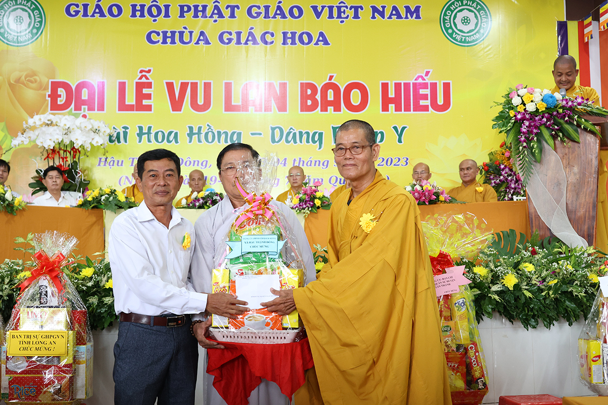 Phát biểu cảm tạ, Thượng tọa Thích Lệ Tấn – Ủy viên thường trực BTS, Phó Ban Từ thiện BTS GHPGVN tỉnh Long An, Trưởng BTS GHPGVN huyện Tân Thạnh, trụ trì chùa Giác Hoa, trưởng Ban tổ chức đại lễ đã thành kính cảm niệm tri ân chư Tôn đức giáo phẩm, chư Đại đức Tăng Ni đã không quảng ngại Phật sự đa đoan vì lòng thương tưởng đã quang lâm chứng minh và tham dự buổi lễ và đặc biệt Hòa thượng trưởng BTS GHPGVN tỉnh Long An còn ban bố những lời sách tấn vô cùng quý báu. Thượng tọa cũng tri ân đến các cấp chính quyền, chư vị khách quý, các cơ quan ban ngành đoàn thể cùng quý Phật tử đã dành thời gian quý báu trở về nơi chùa Giác Hoa để cùng nhau cất cao tinh thần hiếu nghĩa.