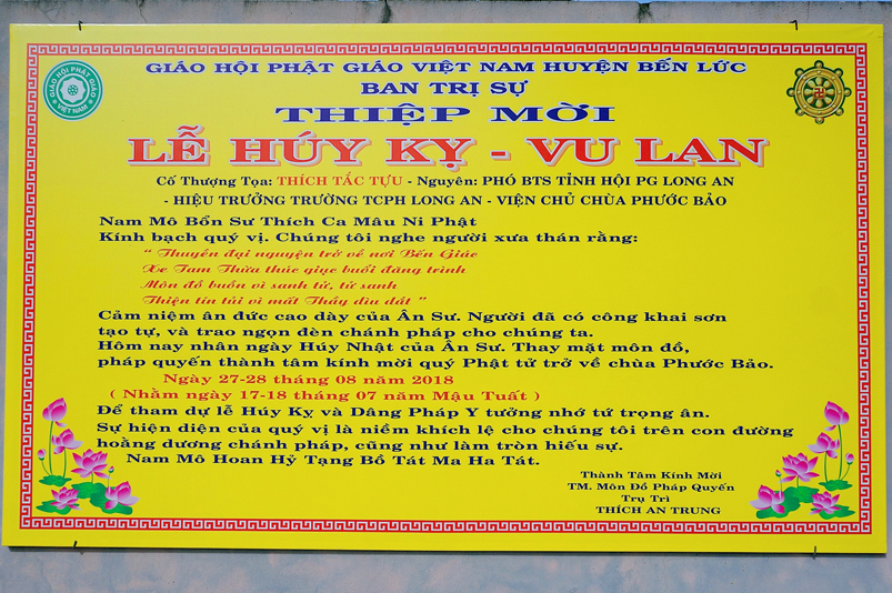Sáng ngày 28 tháng 8 năm 2018 (nhằm 17 tháng 7 năm Mậu Tuất), tại chùa Phước Bảo văn phòng Ban trị sự GHPGVN huyện Bến Lức tỉnh Long An, Đại Đức Thích An Trung Trưởng Ban Trị Sự PG huyện, trụ trì chùa Phước Bảo hiệp cùng Môn đồ Pháp quyến trang nghiêm tổ chức lễ Huý nhật cố Thượng toạ Thích Tắc Tựu- Nguyên phó Ban trị sự GHPGVN Long An, Hiệu trưởng trường Trung cấp Phật học tỉnh Long An, viện chủ chùa Phước Bảo và lễ Vu Lan PL 2562