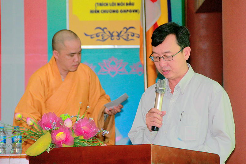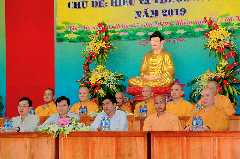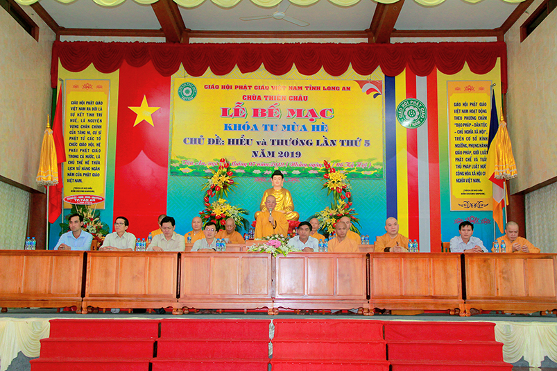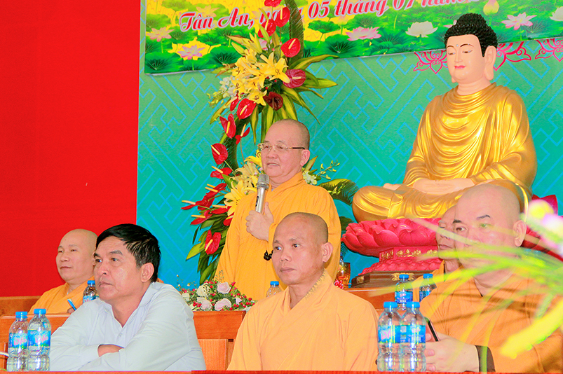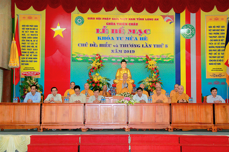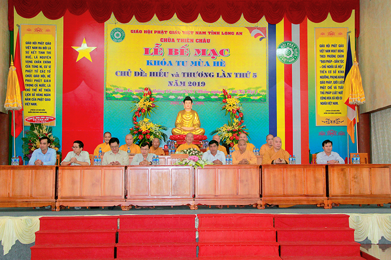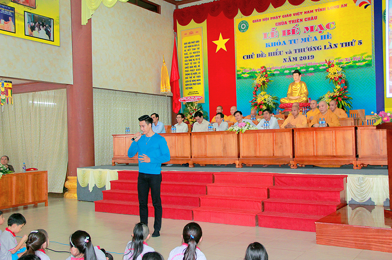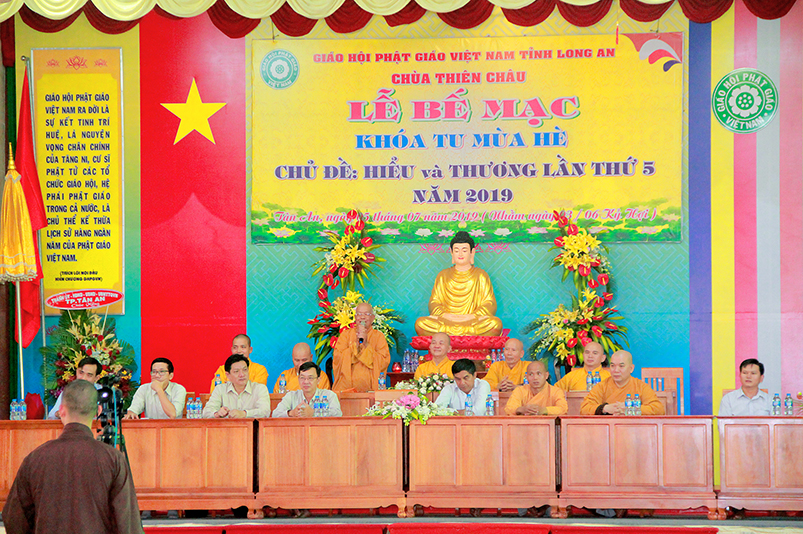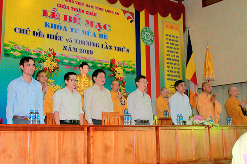 Thay mặt các cấp chính quyền, Ông Nguyễn Thanh Sơn- có lời phát biểu: “Ban trị Sự GHPGVN tỉnh Long An đã đáp ứng được nhu cầu sân chơi Phật giáo theo tinh thần từ bi và trí tuệ, sau những ngày cùng nhau sinh hoạt, chung sống trong tình thương yêu, lành mạnh, các em đã gắng bó trong chốn thiền môn như con một nhà”. Ông chia sẽ với các em:“Mong rằng các em thực hành “Hiểu và Thương” chính mình và ông bà cha mẹ của mình, nuôi dưỡng tâm từ bi ngày càng nhiều hơn, để trở thành con ngoan trò giỏi, khi về gia đình tuyên truyền được lối sống cao đẹp này được lan tỏa đến gia đình, và xã hội”. Cuối cùng Ông gởi lời chúc mừng khóa tu đã thành tựu tốt đẹp.