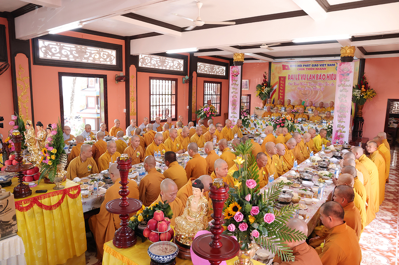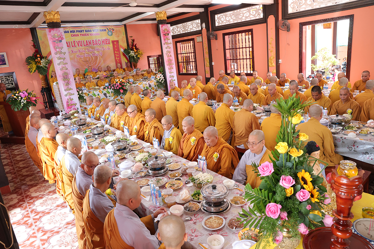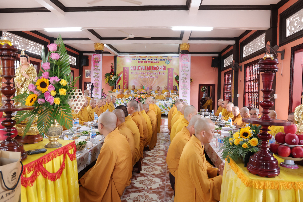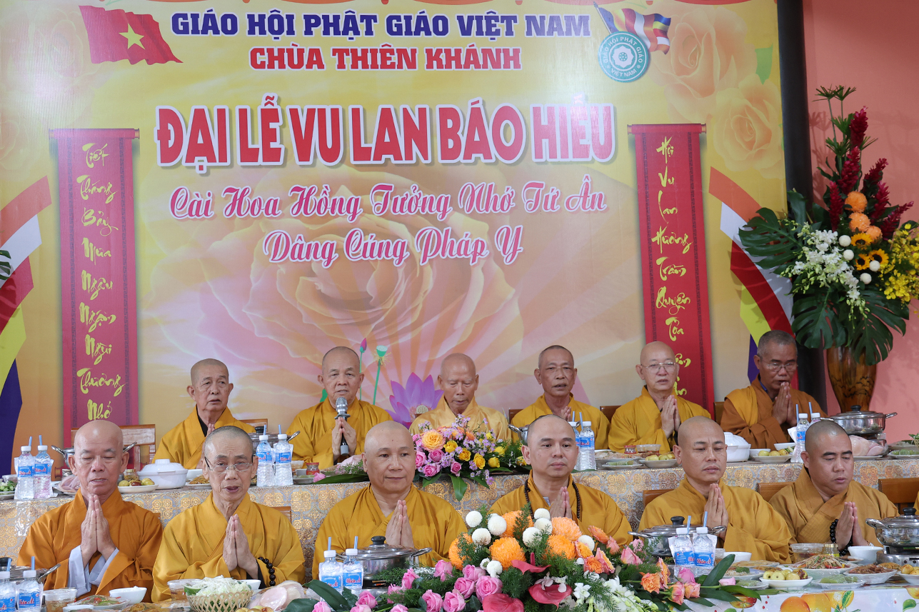 HT. Thích Minh Thiện – Chứng minh, cố vấn BTS GHPGVN tỉnh Tây Ninh ban lời đạo từ, tán thán tâm hiếu, hạnh hiếu của Phật tử chùa Thiên Khánh đã thể hiện qua lời văn tác bạch cúng dường. Hòa thượng nhấn mạnh Đại lễ Vu Lan Báo Hiếu là dịp nhắc nhở người con Phật dù là xuất gia hay tại gia hãy lấy chữ Hiếu, tôn trọng và báo đáp nghĩa ơn là nền tảng của đạo làm người, cũng là cội gốc của mọi hạnh lành trong Phật pháp. Chính vì vậy mà Đại lễ Vu Lan không chỉ tồn tại trong truyền thống đạo Phật mà con đi vào tín ngưỡng dân tộc Việt Nam. Hòa thượng sách tấn đại chúng tinh tấn tu tập, phước trí trang nghiêm để hòa chung vào ngày tôn giáo văn hóa thiêng liêng, biết phụng dưỡng song thân, phát huy trí tuệ của người học Phật để xây dựng đời sống an lạc cho tự thân, mang lại hạnh phúc cho gia đình, góp phần làm cho xã hội ngày càng thịnh trị, quốc gia hưng thịnh.